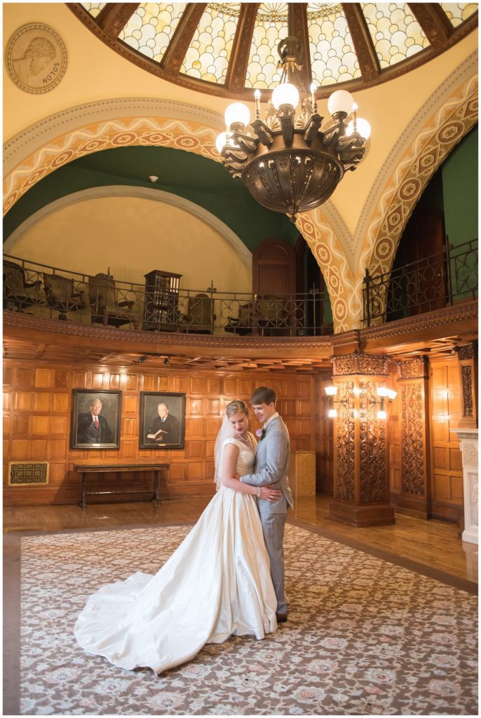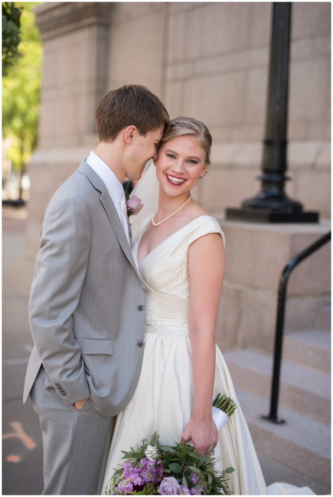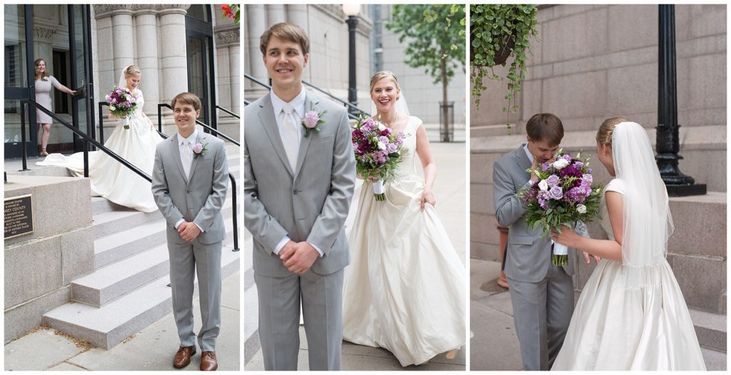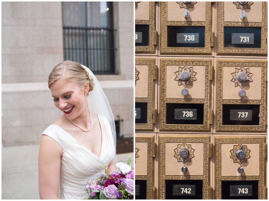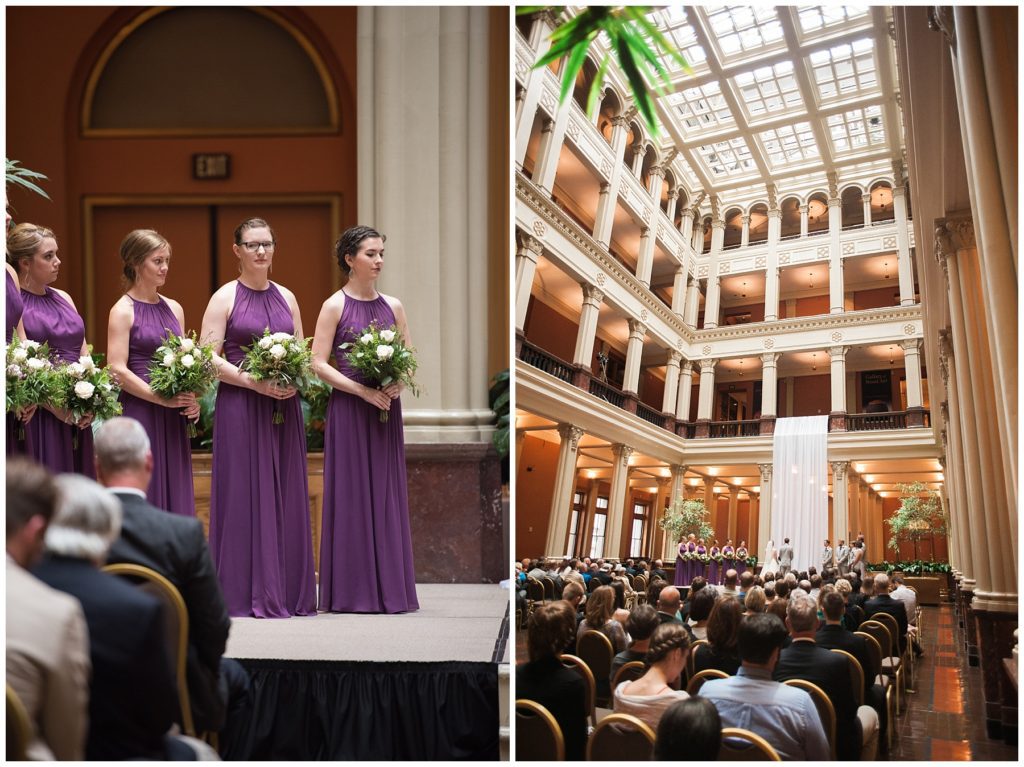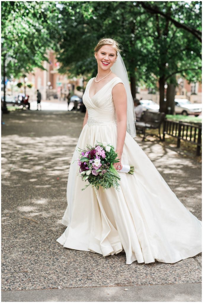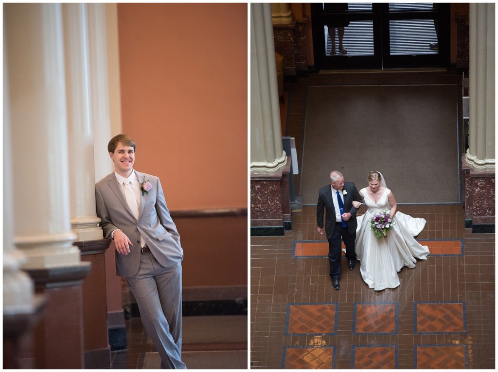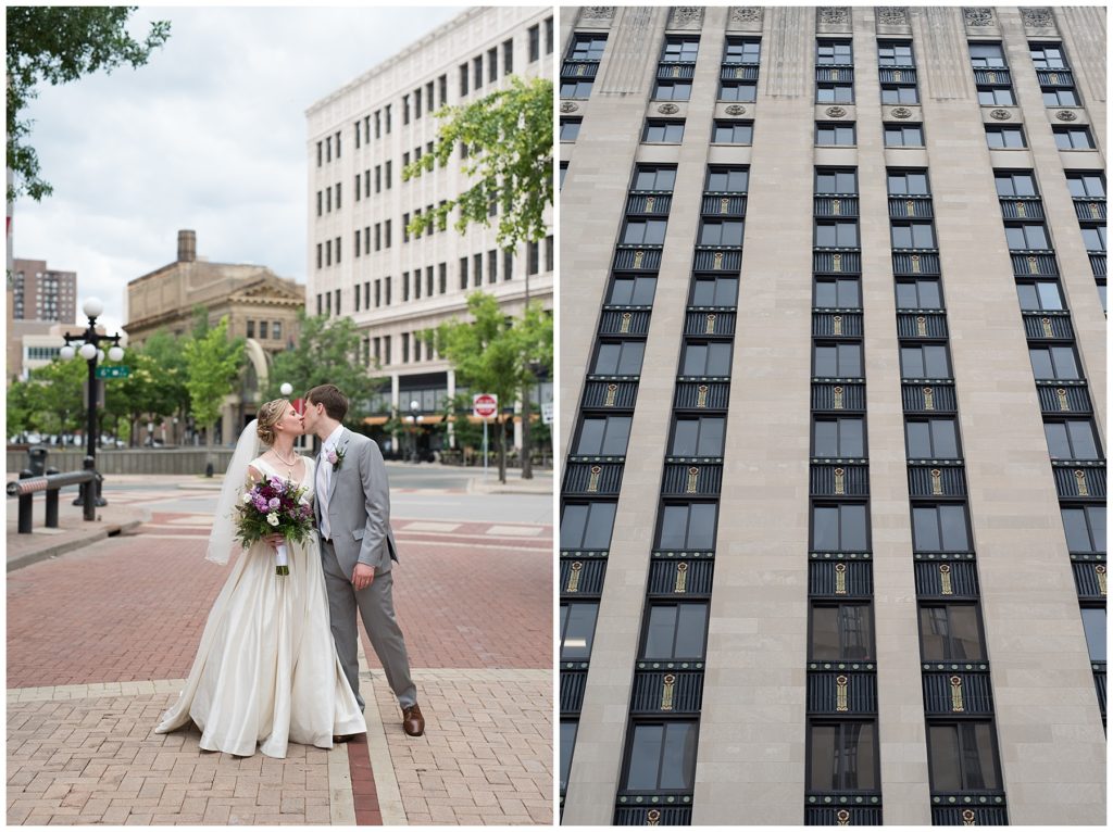 Their wedding day was just as beautiful. Surrounded by family and friends from all over the world, the two were wed in the historic Landmark Center of St. Paul. Their summer evening wedding could not have been more comfortable as the couple walked around the streets of Rice Park and along the river for photos. Rachel’s elegant satan Allure dress was stunning against Dan’s Josph Abbound grey suit. The violet and green bouquets from Florals by Claire added a stunning pop of color against the purple bridesmaid dresses from the Wedding Shoppe. Rachel and Dan both added heirloom pieces of jewelry to their day. Pearl earrings that Rachel’s mother on her wedding day, her necklace was her paternal grandmother’s and her bracelet was her maternal grandmother’s and a tie Clip that Dan’s grandfather passed on to him. Their ceremony was inside the Landmark Center and guests were invited to share in the festivities of dinner provided by BRIE catering and dancing DJ’d by Fulton Productions.