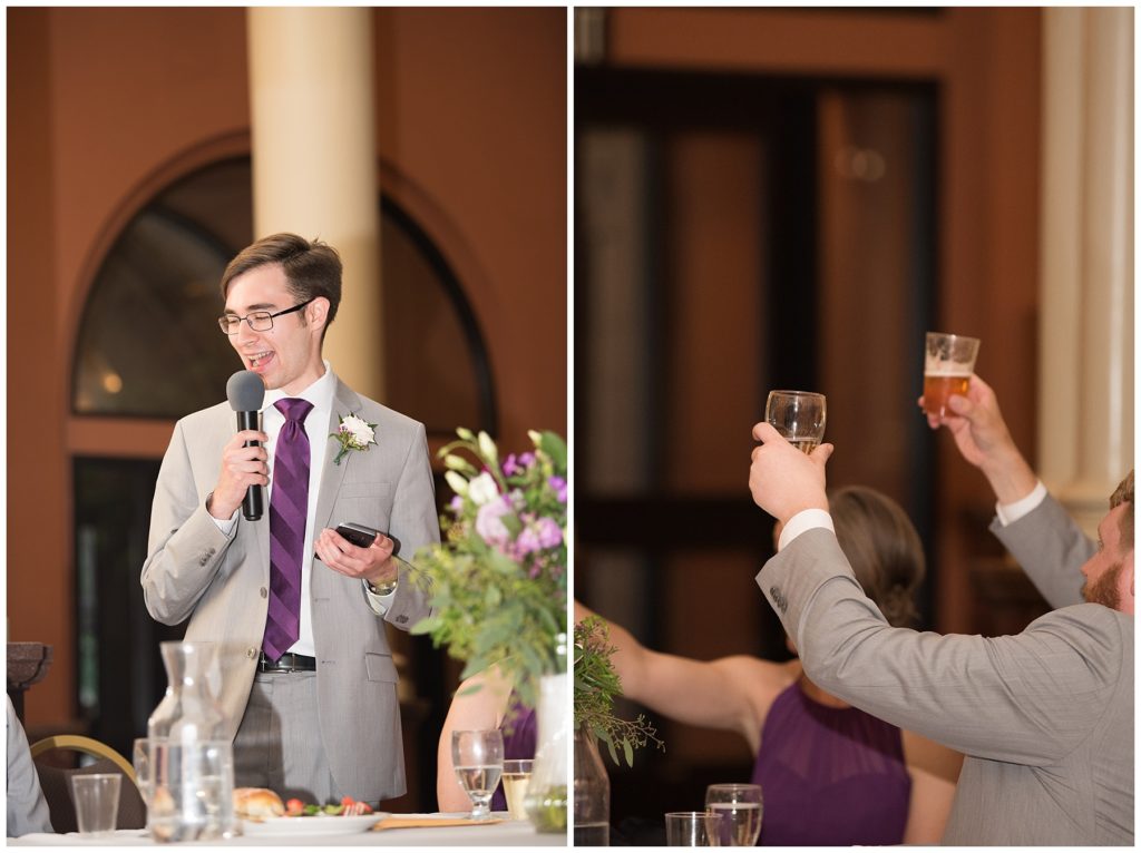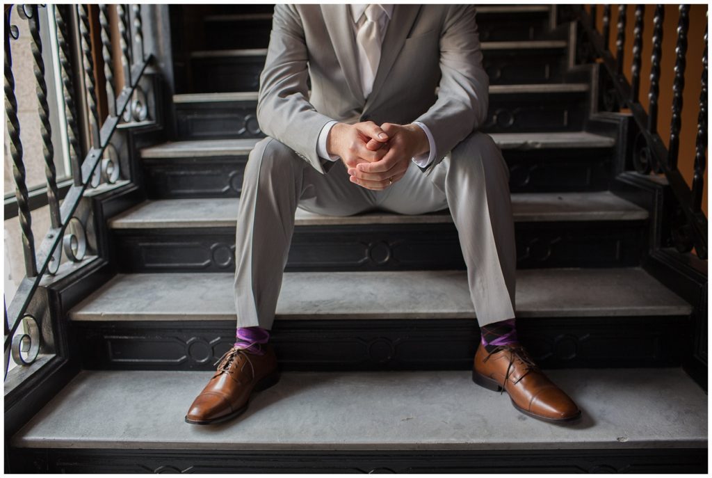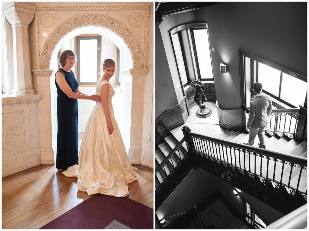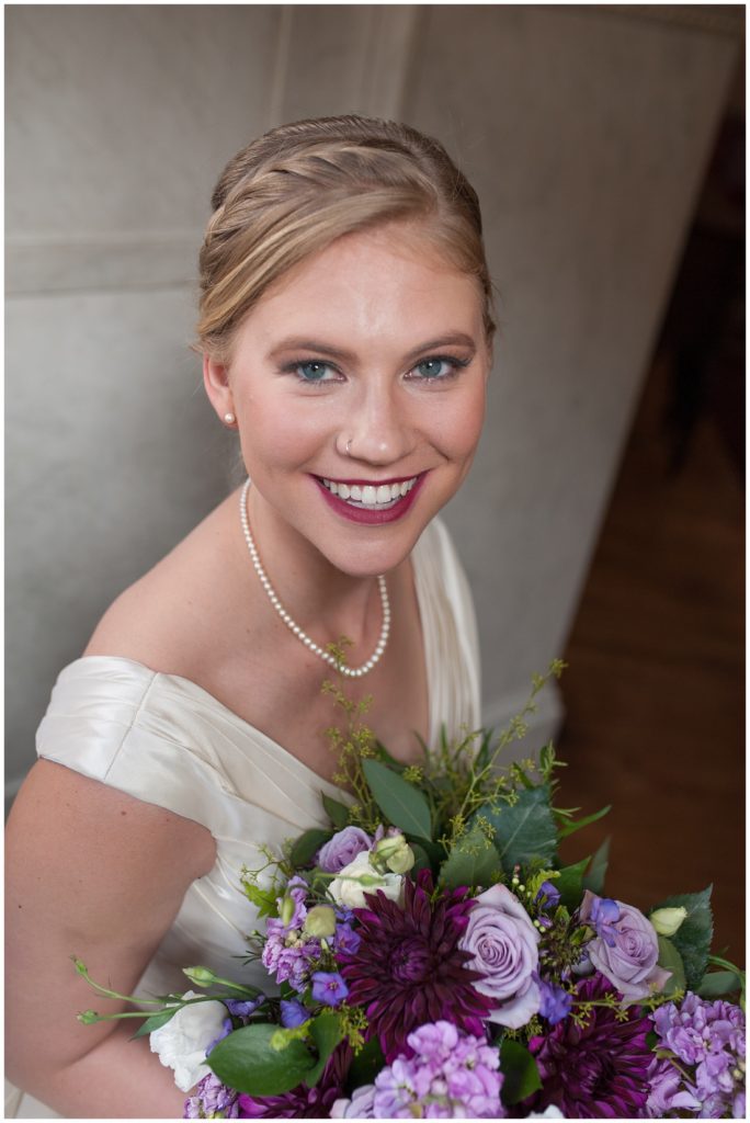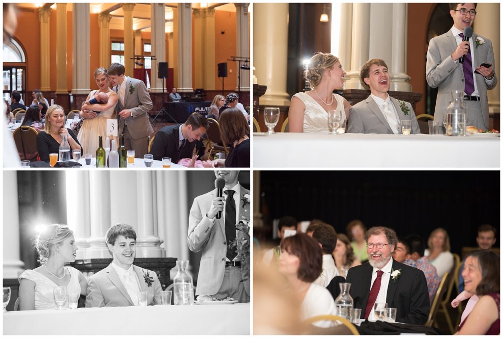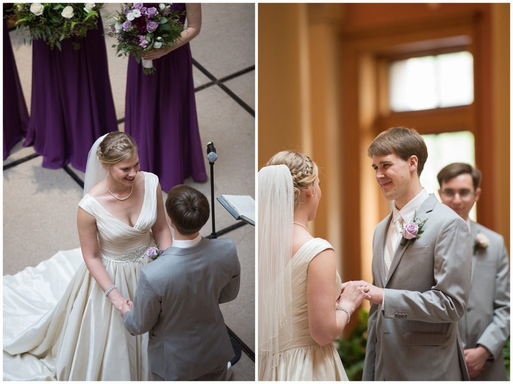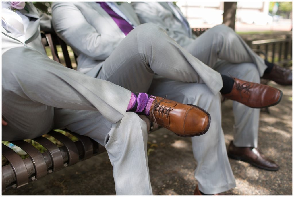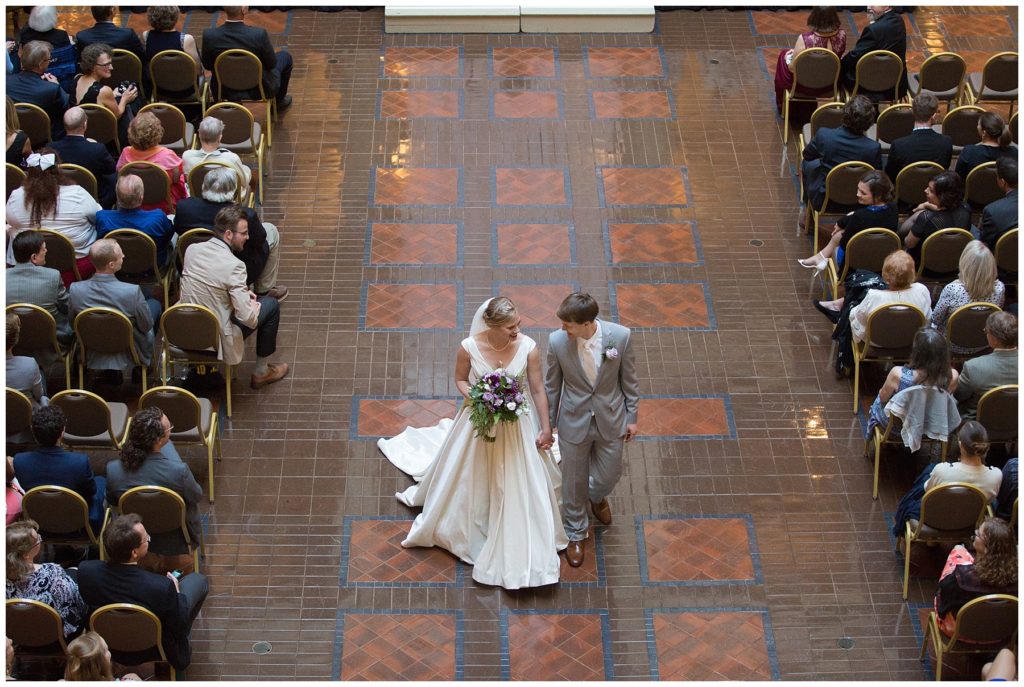 Their wedding day was just as beautiful. Surrounded by family and friends from all over the world, the two were wed in the historic Landmark Center of St. Paul. Their summer evening wedding could not have been more comfortable as the couple walked around the streets of Rice Park and along the river for photos. Rachel’s elegant satan Allure dress was stunning against Dan’s Josph Abbound grey suit. The violet and green bouquets from Florals by Claire added a stunning pop of color against the purple bridesmaid dresses from the Wedding Shoppe. Rachel and Dan both added heirloom pieces of jewelry to their day. Pearl earrings that Rachel’s mother on her wedding day, her necklace was her paternal grandmother’s and her bracelet was her maternal grandmother’s and a tie Clip that Dan’s grandfather passed on to him. Their ceremony was inside the Landmark Center and guests were invited to share in the festivities of dinner provided by BRIE catering and dancing DJ’d by Fulton Productions.