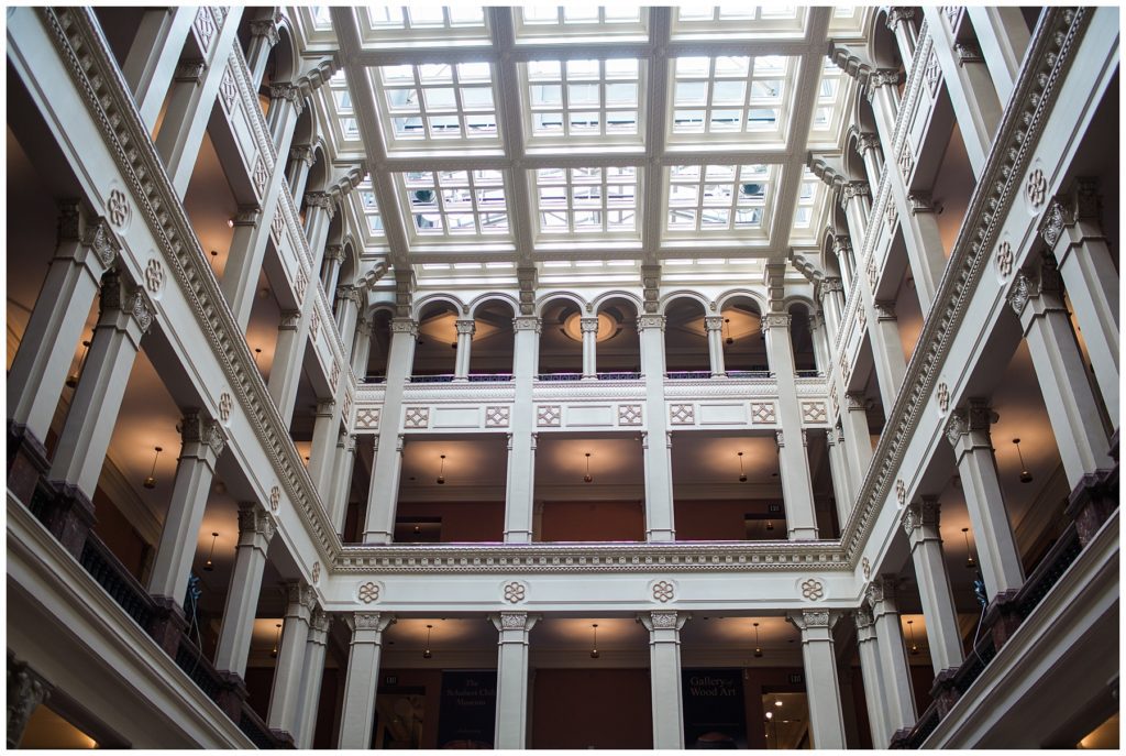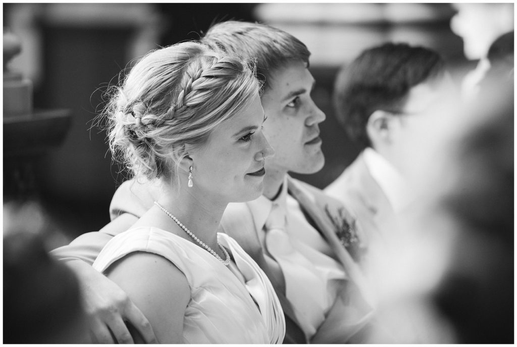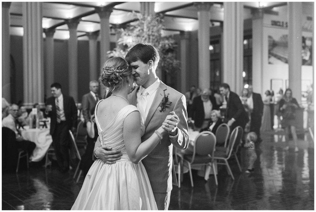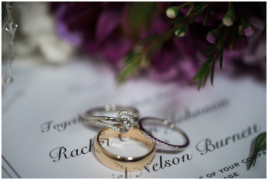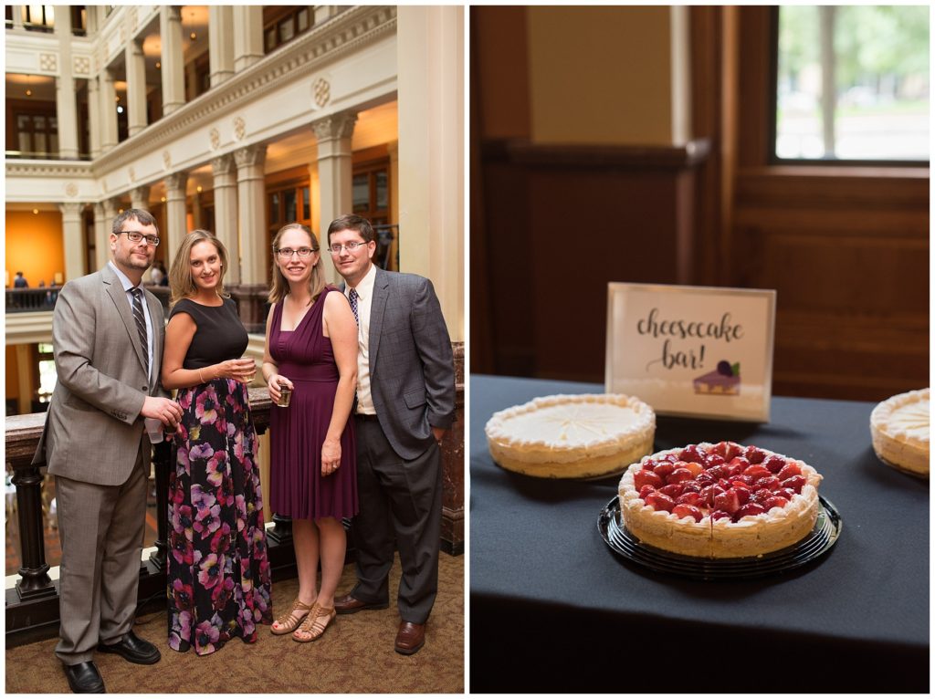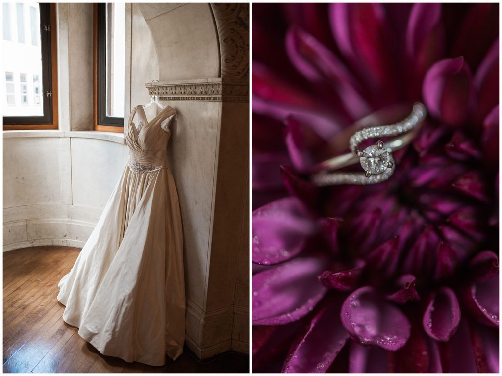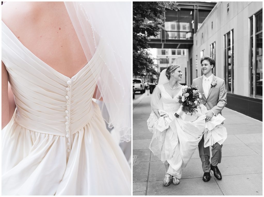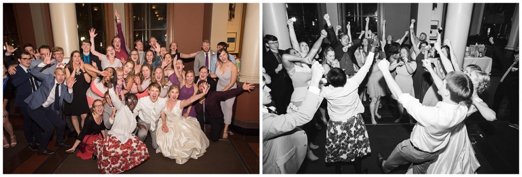 Their wedding day was just as beautiful. Surrounded by family and friends from all over the world, the two were wed in the historic Landmark Center of St. Paul. Their summer evening wedding could not have been more comfortable as the couple walked around the streets of Rice Park and along the river for photos. Rachel’s elegant satan Allure dress was stunning against Dan’s Josph Abbound grey suit. The violet and green bouquets from Florals by Claire added a stunning pop of color against the purple bridesmaid dresses from the Wedding Shoppe. Rachel and Dan both added heirloom pieces of jewelry to their day. Pearl earrings that Rachel’s mother on her wedding day, her necklace was her paternal grandmother’s and her bracelet was her maternal grandmother’s and a tie Clip that Dan’s grandfather passed on to him. Their ceremony was inside the Landmark Center and guests were invited to share in the festivities of dinner provided by BRIE catering and dancing DJ’d by Fulton Productions.
