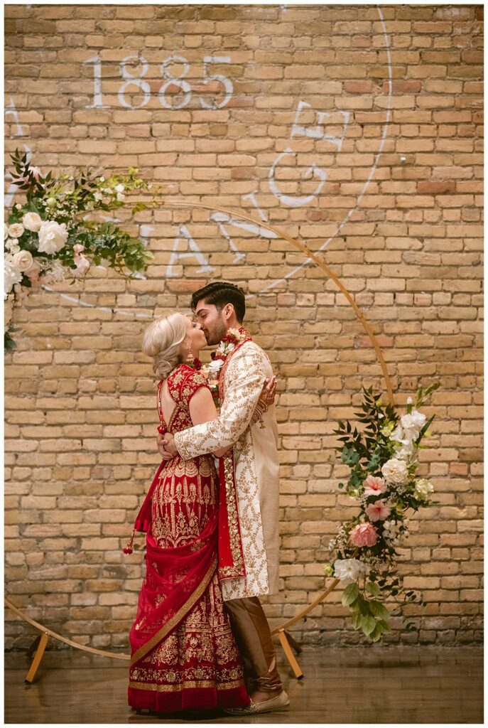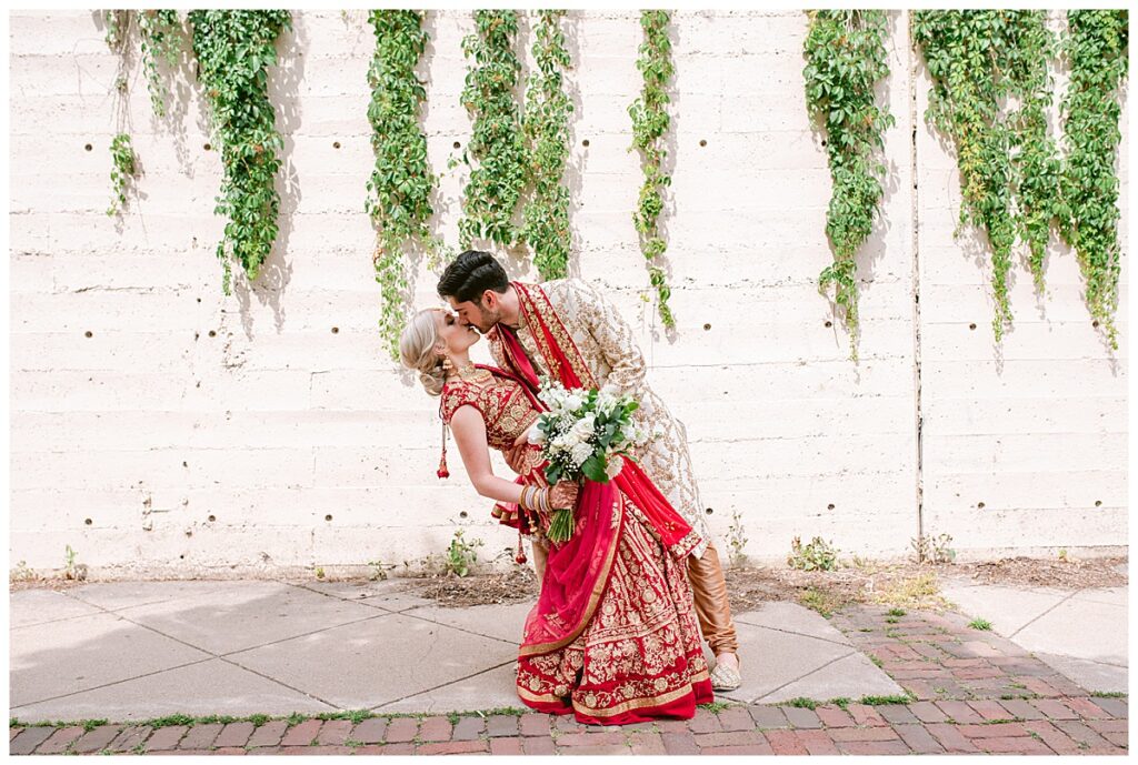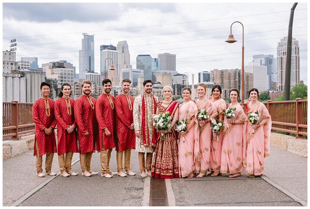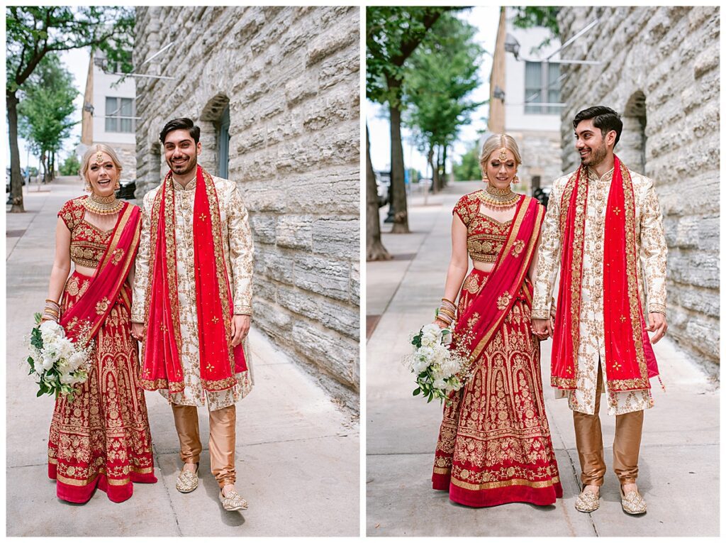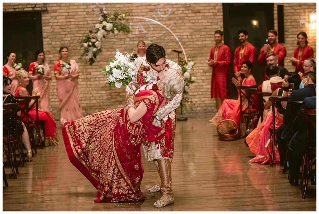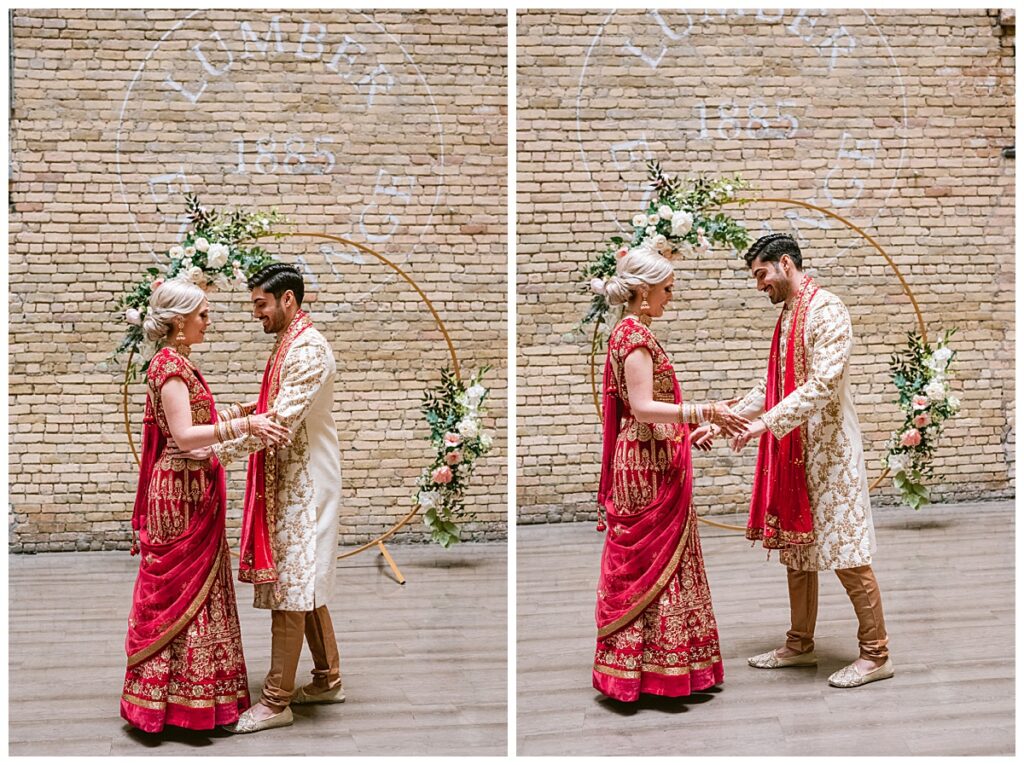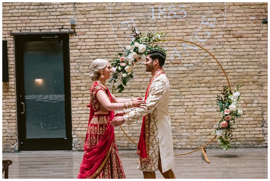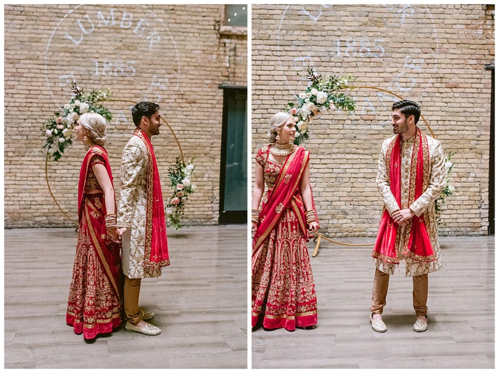 Both Heather and Ryan chose to get married in 2021 in Heather’s parent’s backyard with only family in attendance and decided on 2022 being the year they would host a large celebration for both family and friends from near and far. The couple chose to host their ceremony and reception at the industrial Lumber Exchange in downtown Minneapolis. Being that Ryan comes from an Indian heritage, the couple chose to start the day in Indian garb. Full of color and vibrance and representing good luck and happiness, Heather wore a traditional red and gold sari and Ryan word a beautifully embroidered Kafni. The bridesmaids and groomsmen also wore wedding sari’s and Kafni.