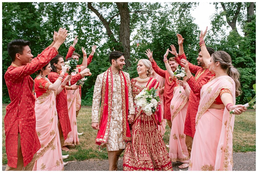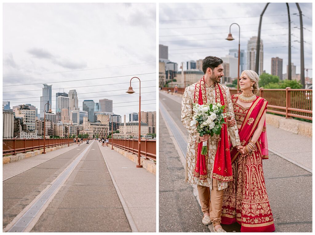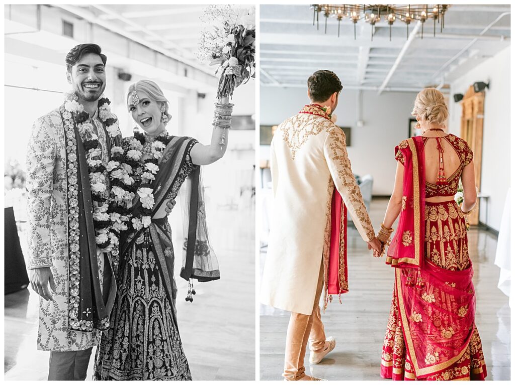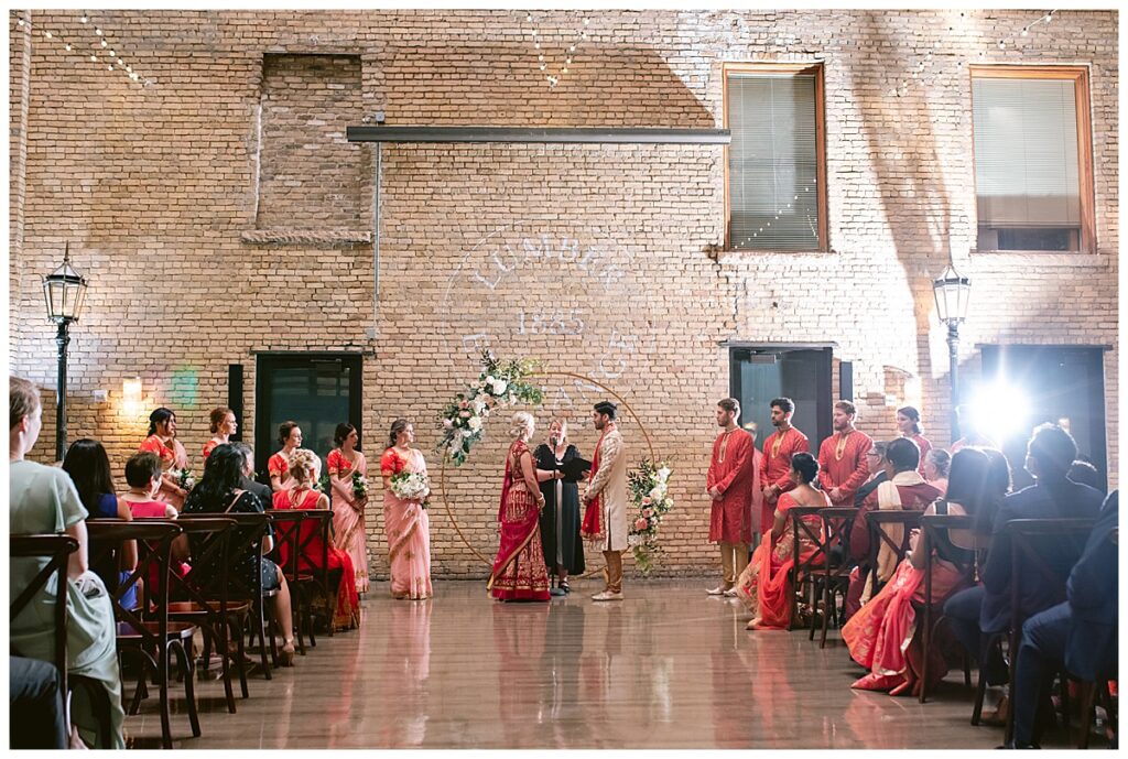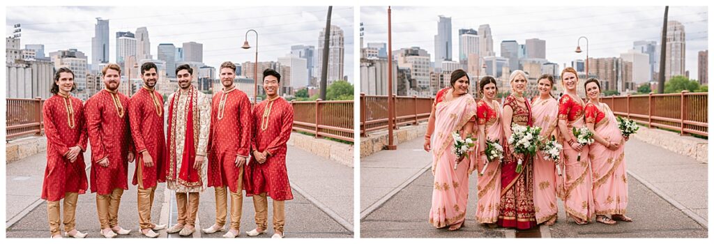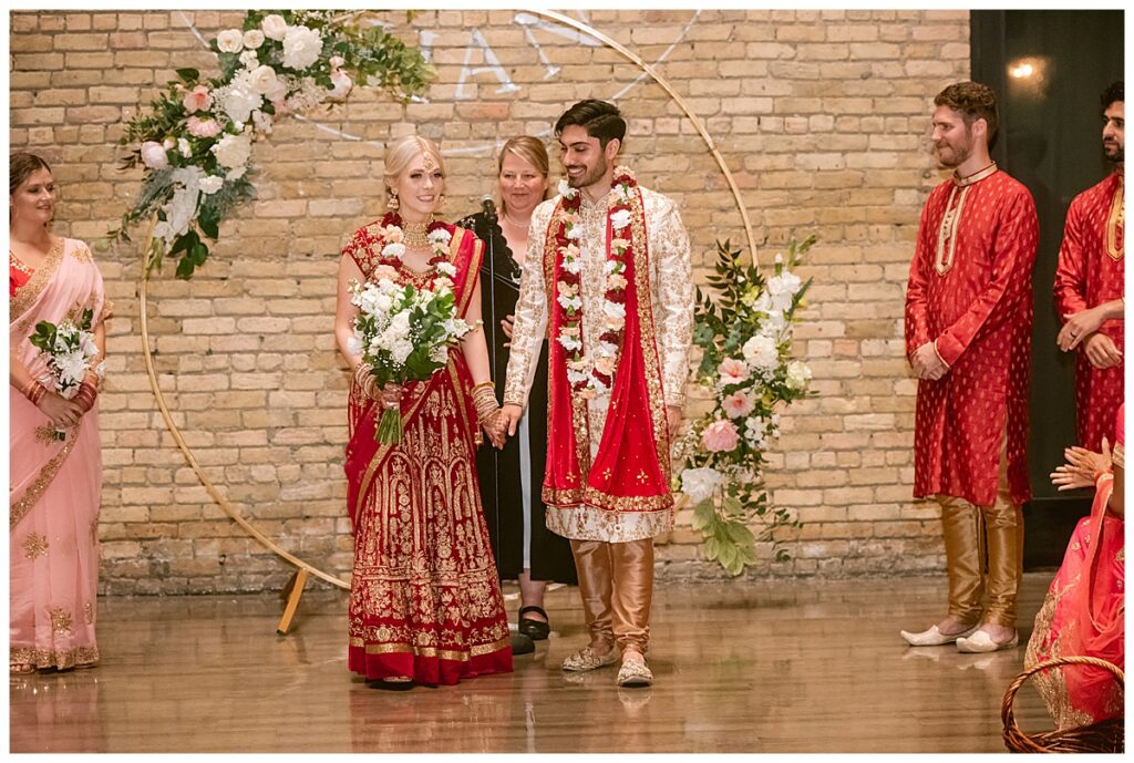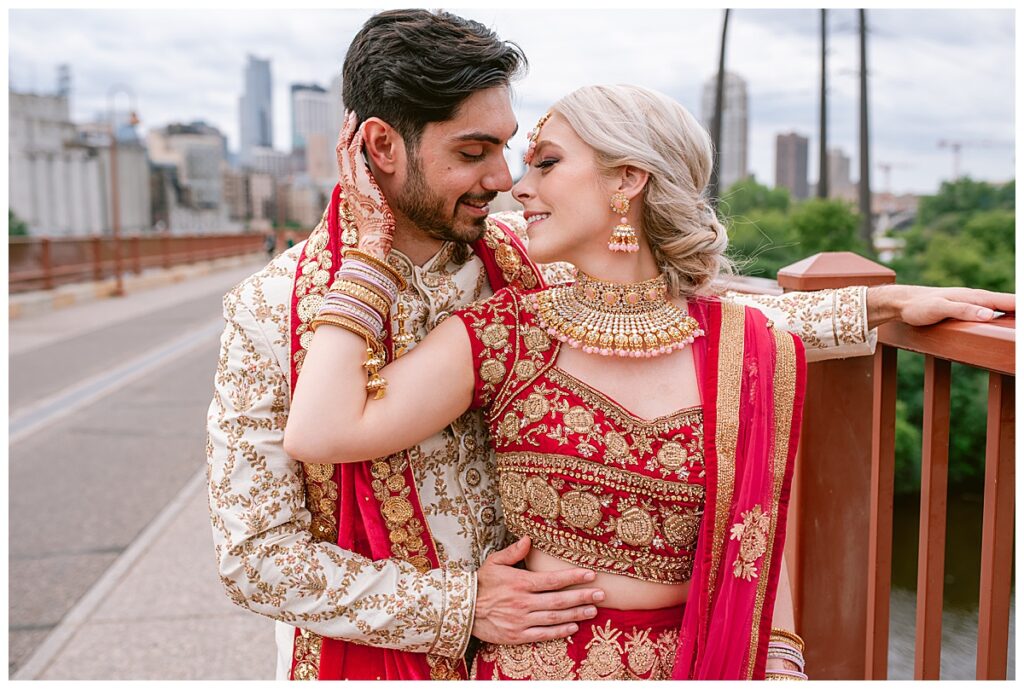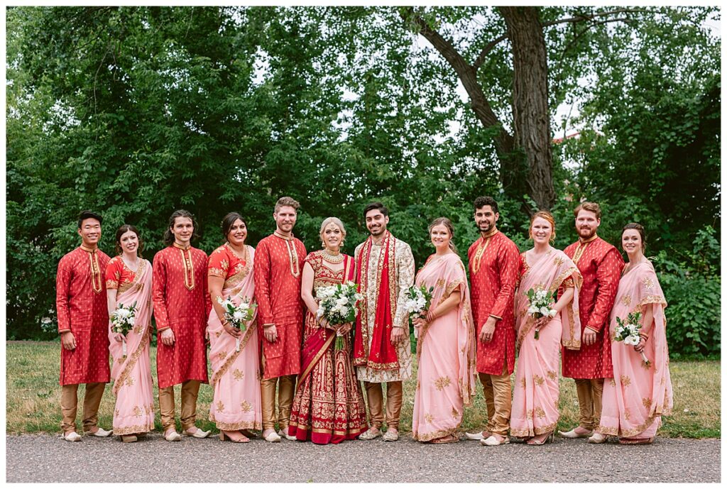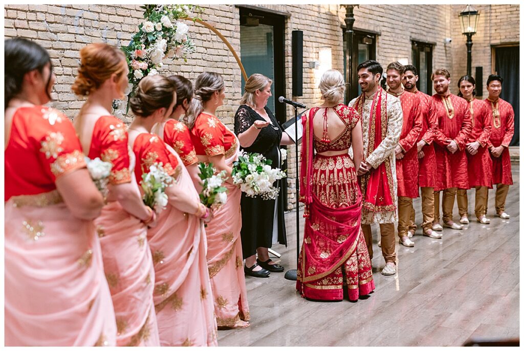 Both Heather and Ryan chose to get married in 2021 in Heather’s parent’s backyard with only family in attendance and decided on 2022 being the year they would host a large celebration for both family and friends from near and far. The couple chose to host their ceremony and reception at the industrial Lumber Exchange in downtown Minneapolis. Being that Ryan comes from an Indian heritage, the couple chose to start the day in Indian garb. Full of color and vibrance and representing good luck and happiness, Heather wore a traditional red and gold sari and Ryan word a beautifully embroidered Kafni. The bridesmaids and groomsmen also wore wedding sari’s and Kafni.