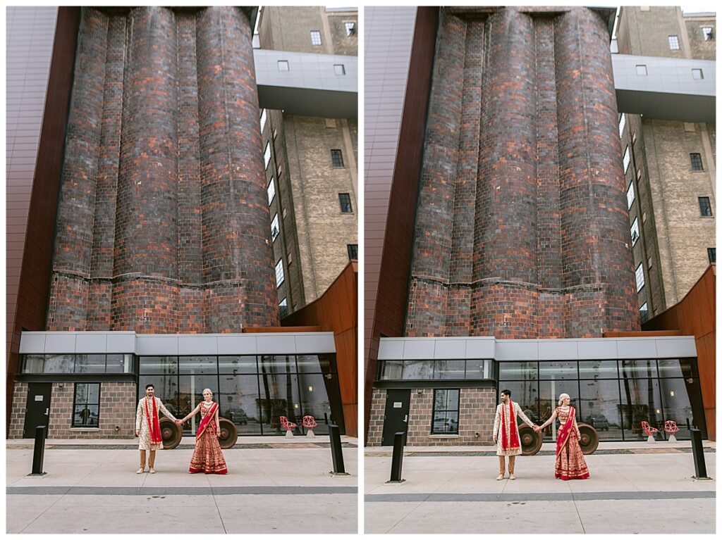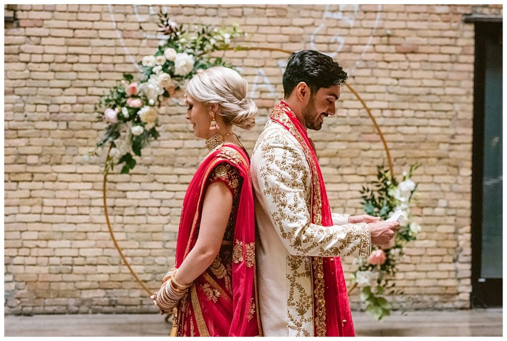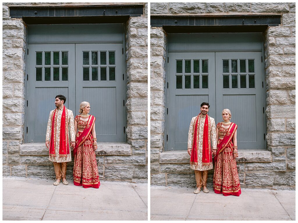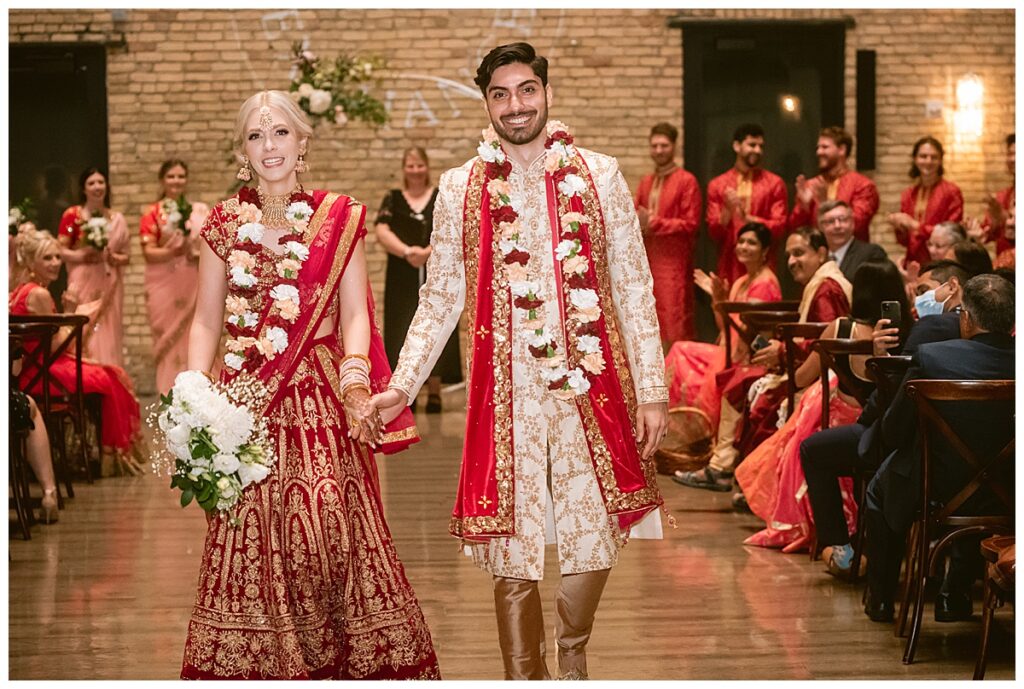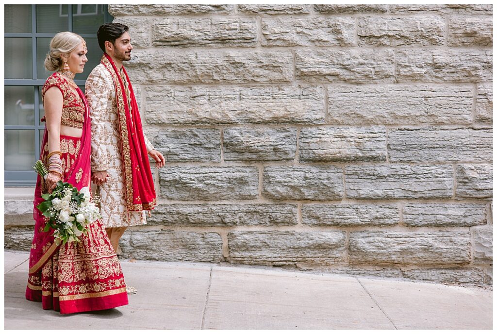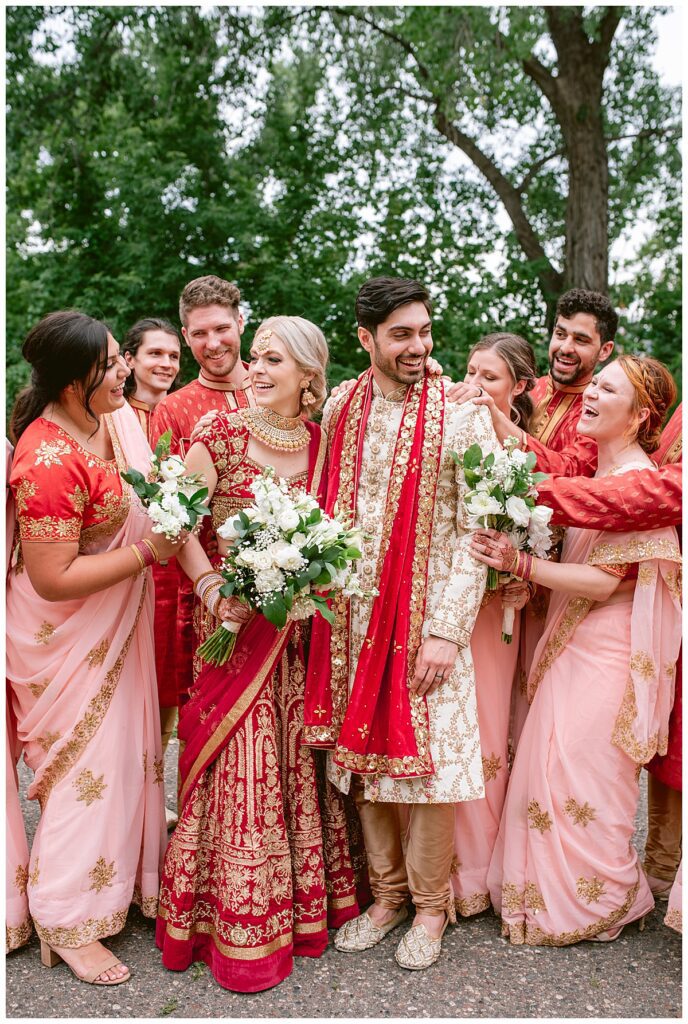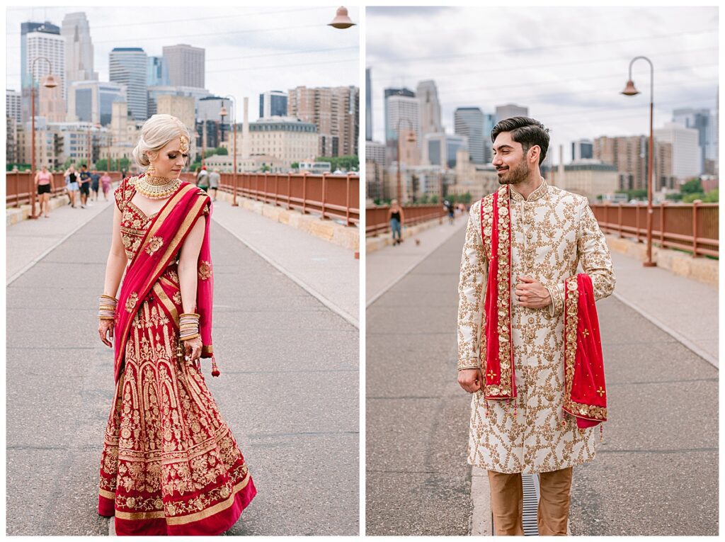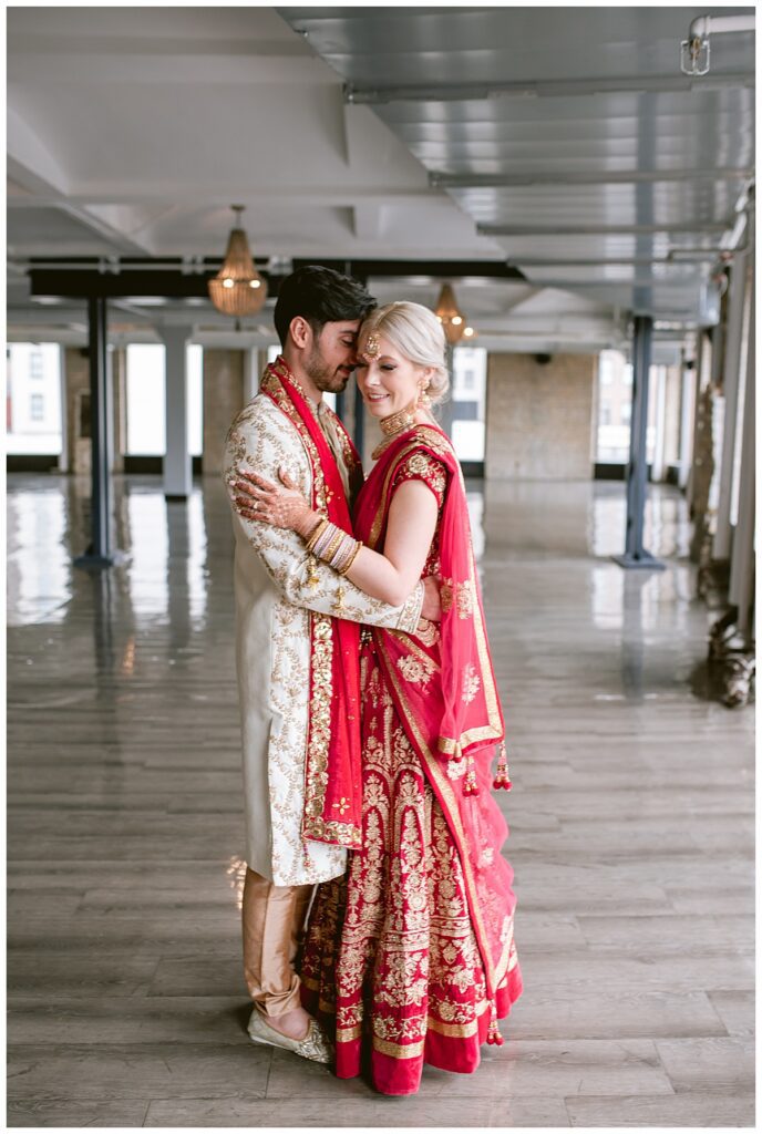Both Heather and Ryan chose to get married in 2021 in Heather’s parent’s backyard with only family in attendance and decided on 2022 being the year they would host a large celebration for both family and friends from near and far. The couple chose to host their ceremony and reception at the industrial Lumber Exchange in downtown Minneapolis. Being that Ryan comes from an Indian heritage, the couple chose to start the day in Indian garb. Full of color and vibrance and representing good luck and happiness, Heather wore a traditional red and gold sari and Ryan word a beautifully embroidered Kafni. The bridesmaids and groomsmen also wore wedding sari’s and Kafni.