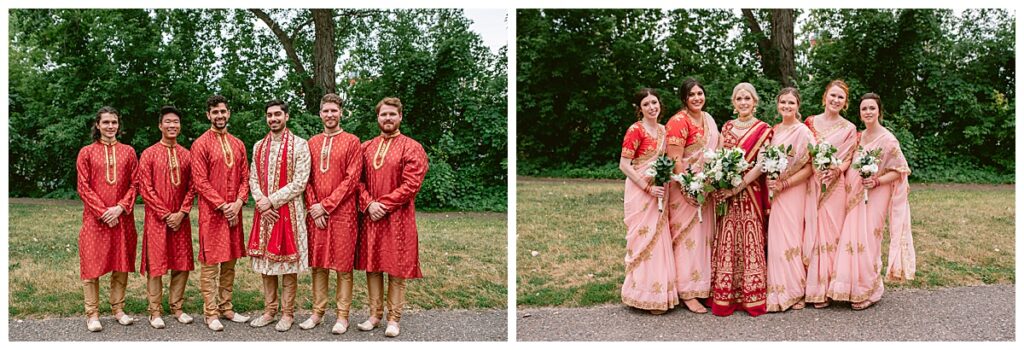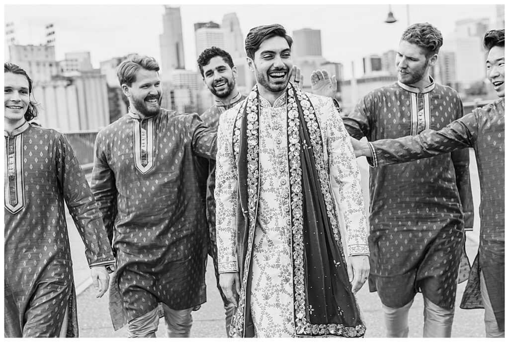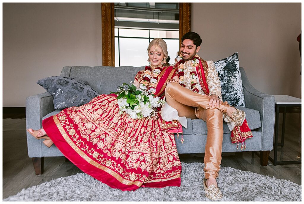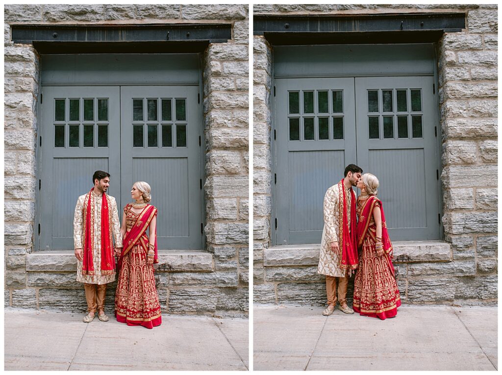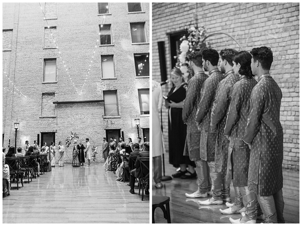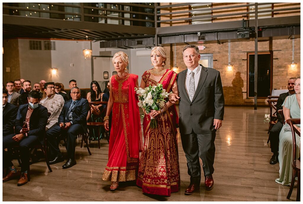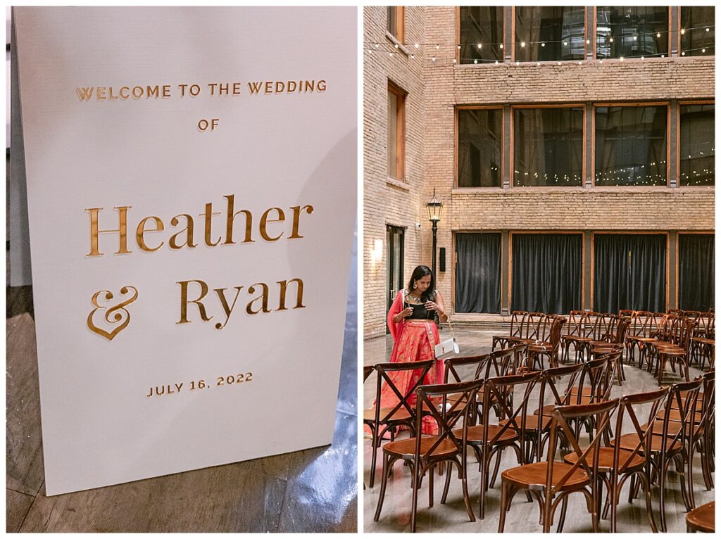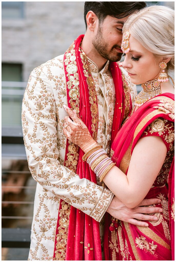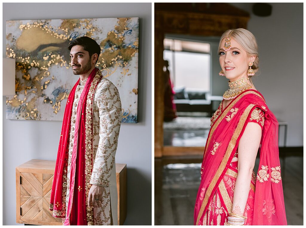Both Heather and Ryan chose to get married in 2021 in Heather’s parent’s backyard with only family in attendance and decided on 2022 being the year they would host a large celebration for both family and friends from near and far. The couple chose to host their ceremony and reception at the industrial Lumber Exchange in downtown Minneapolis. Being that Ryan comes from an Indian heritage, the couple chose to start the day in Indian garb. Full of color and vibrance and representing good luck and happiness, Heather wore a traditional red and gold sari and Ryan word a beautifully embroidered Kafni. The bridesmaids and groomsmen also wore wedding sari’s and Kafni.