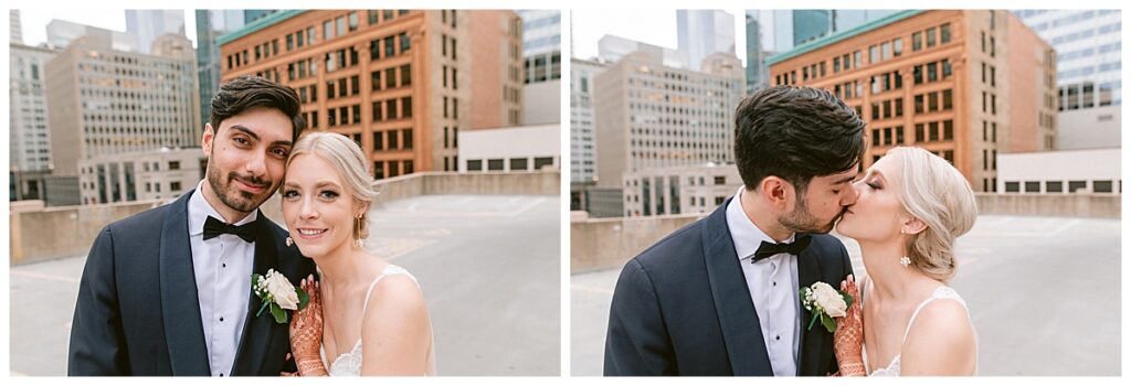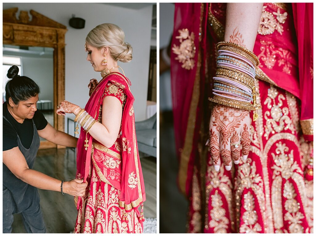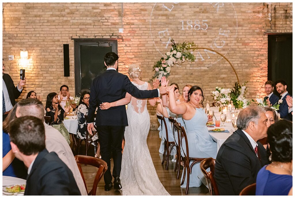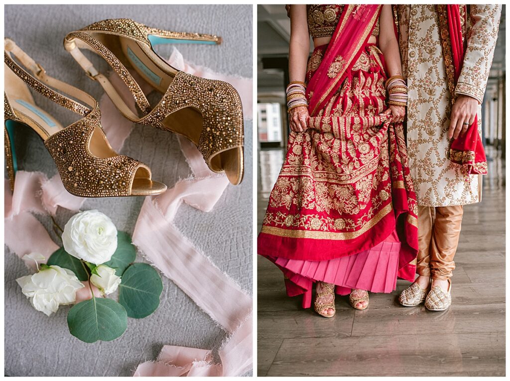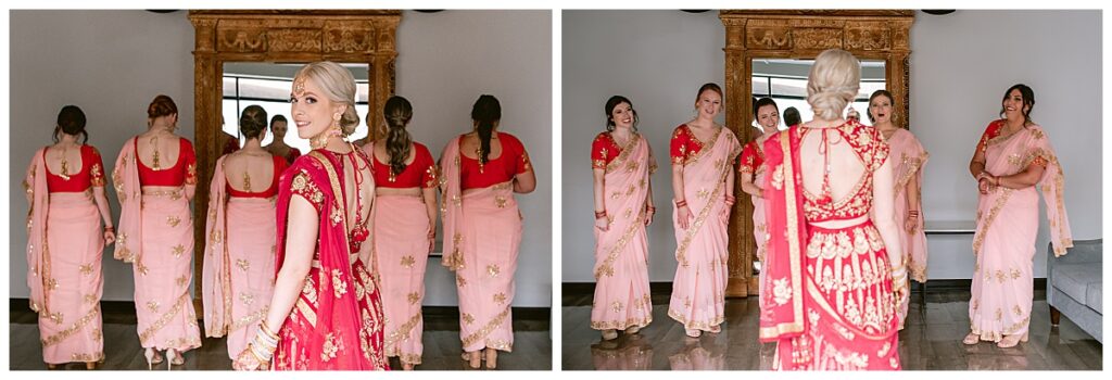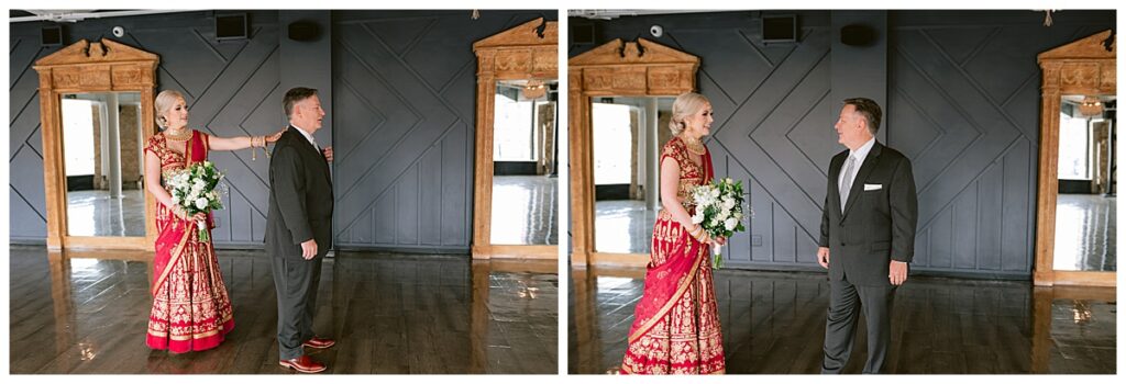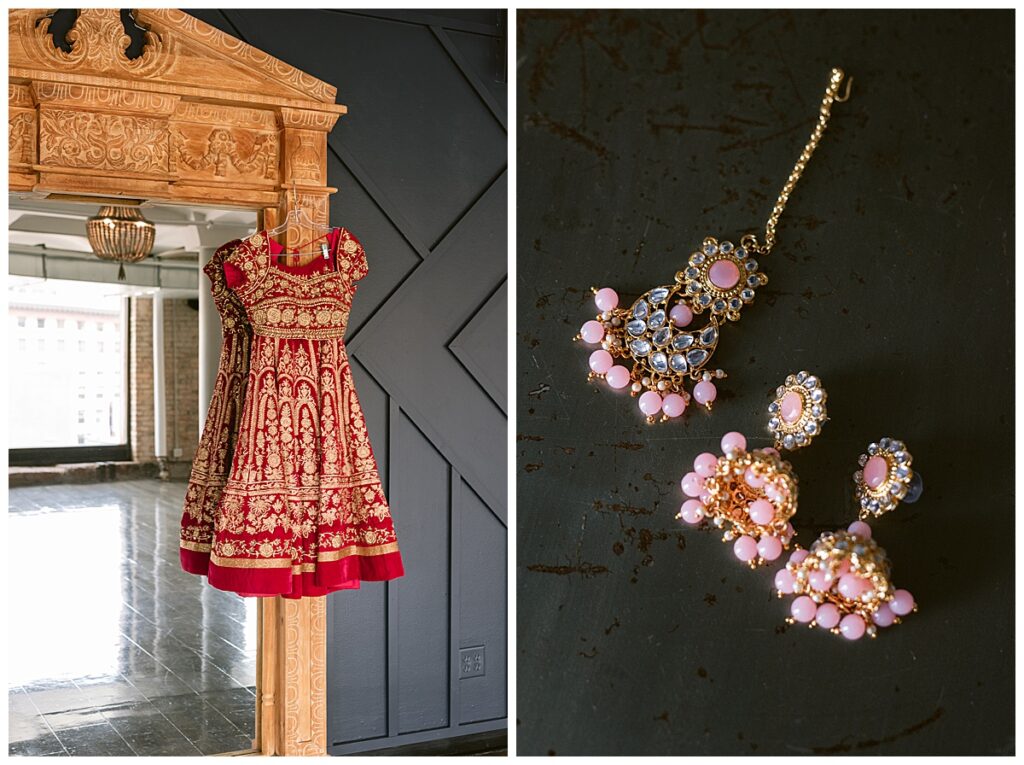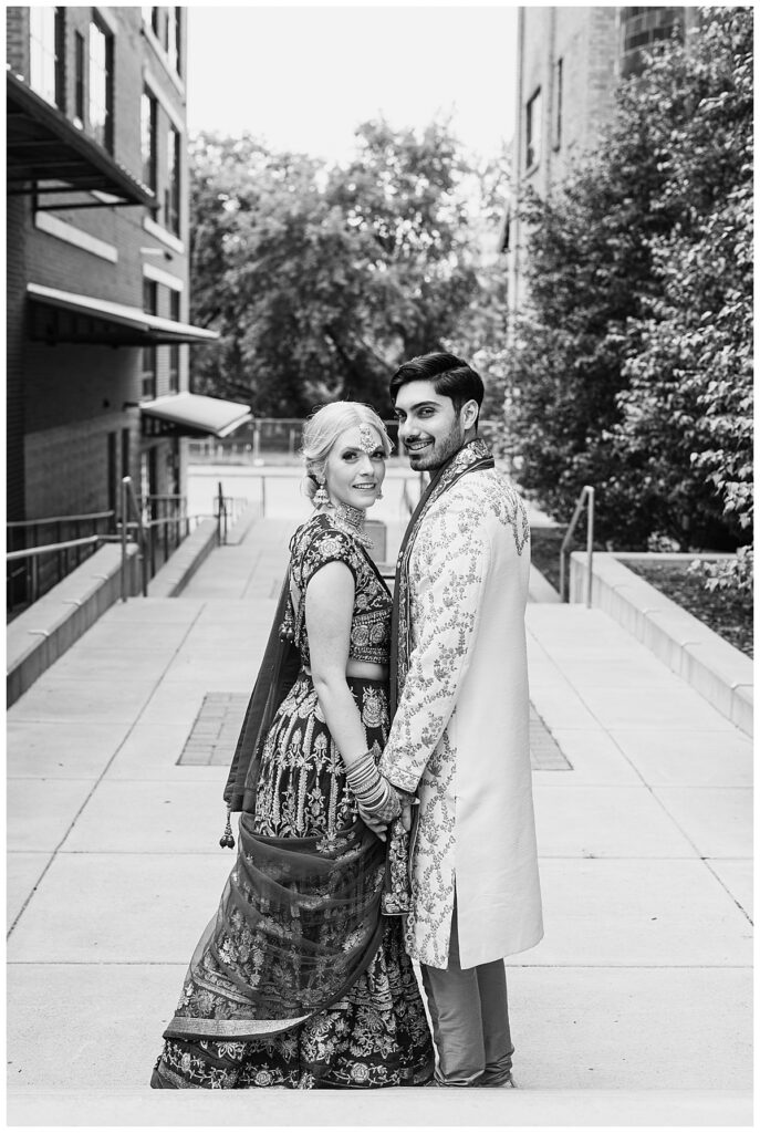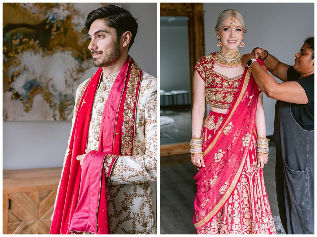 Both Heather and Ryan chose to get married in 2021 in Heather’s parent’s backyard with only family in attendance and decided on 2022 being the year they would host a large celebration for both family and friends from near and far. The couple chose to host their ceremony and reception at the industrial Lumber Exchange in downtown Minneapolis. Being that Ryan comes from an Indian heritage, the couple chose to start the day in Indian garb. Full of color and vibrance and representing good luck and happiness, Heather wore a traditional red and gold sari and Ryan word a beautifully embroidered Kafni. The bridesmaids and groomsmen also wore wedding sari’s and Kafni.