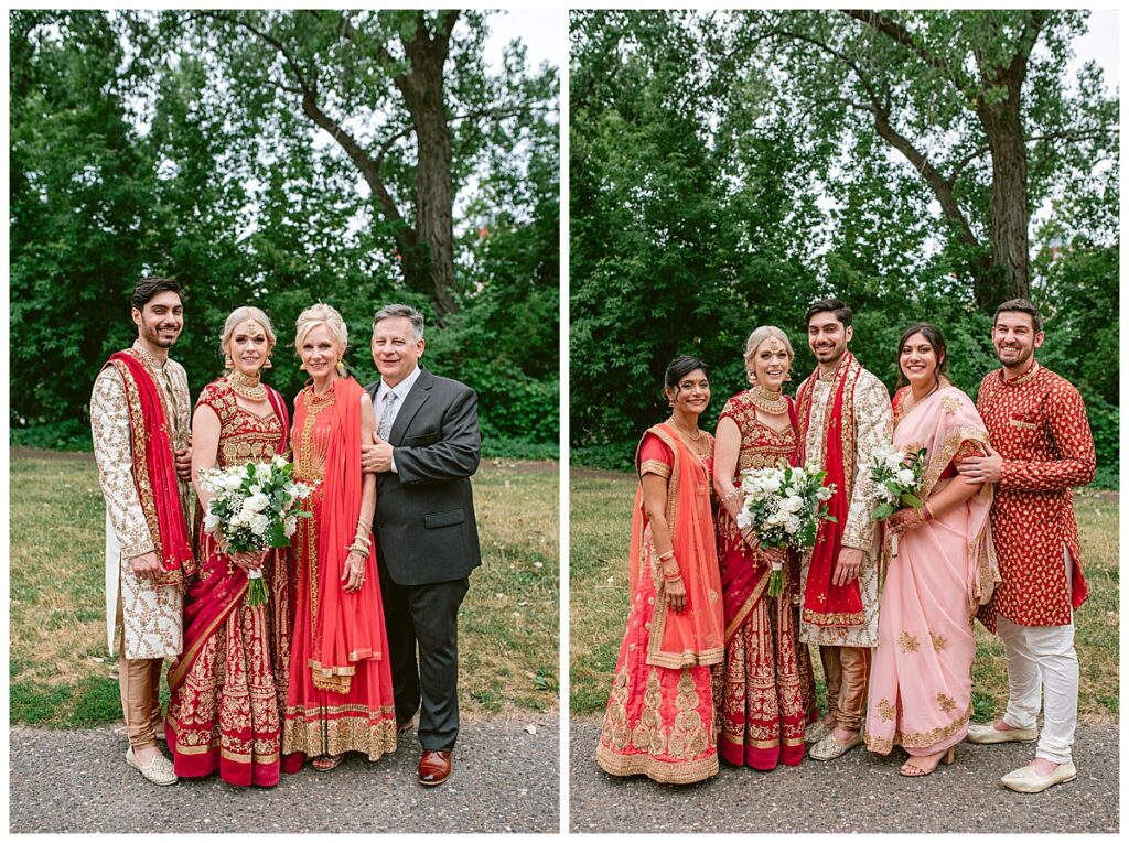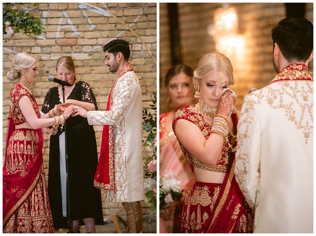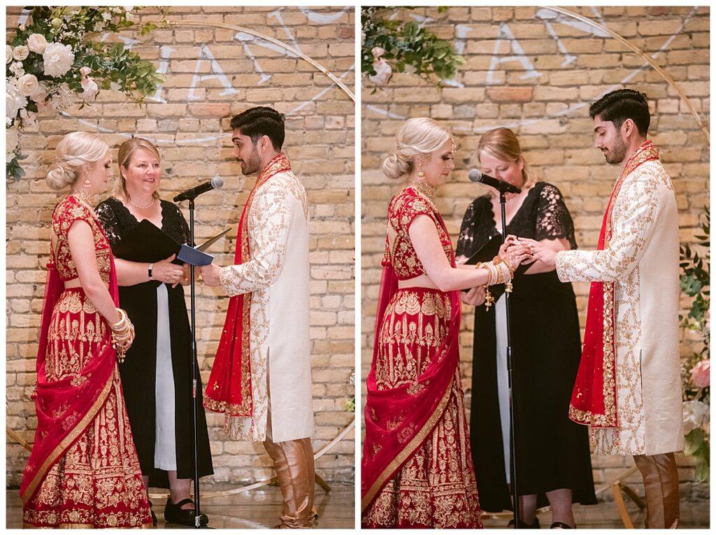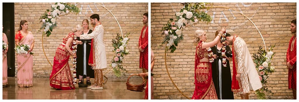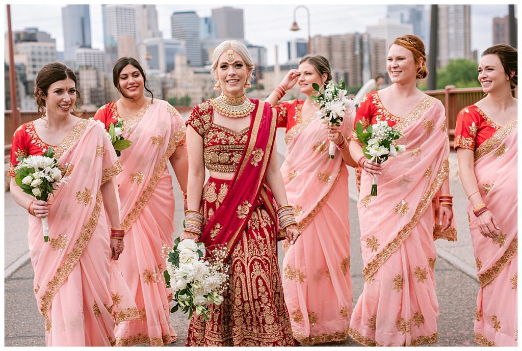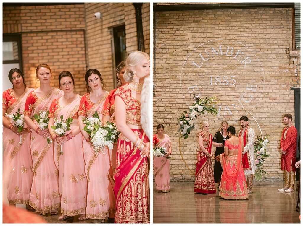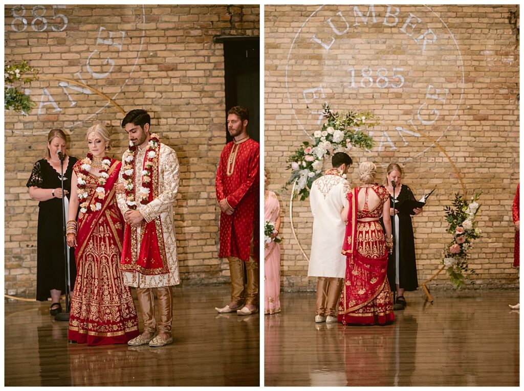 The women began the day getting ready at the Lumber Exchange bridal suite with Heather’s beautiful updo done by Lisa Nghiem of LHN Beauty and Make up completed by Belissimo Salon. The women then were helped into their Sari’s while the men also got dressed and ready for the day. Heather and Ryan had an emotional first look and then we headed to the Stone Arch Bridge with family and the wedding party for some city photos with Rent my Party Bus. Upon returning, guests began arriving with Erica of Piece of Cake Wedding Planning, making sure that everything was perfectly timed for the beautiful ceremony. Heather and Ryan exchanged rings and vows and then took the seven steps together as they vowed to support and love one another. They ended the ceremony by exchanging flower garlands.