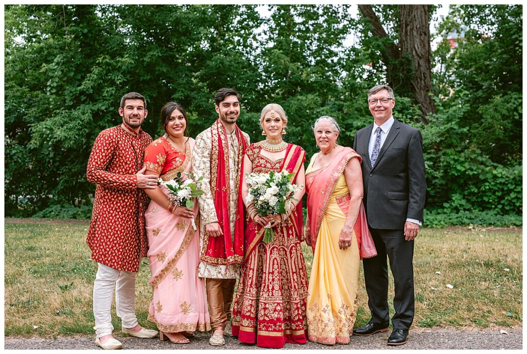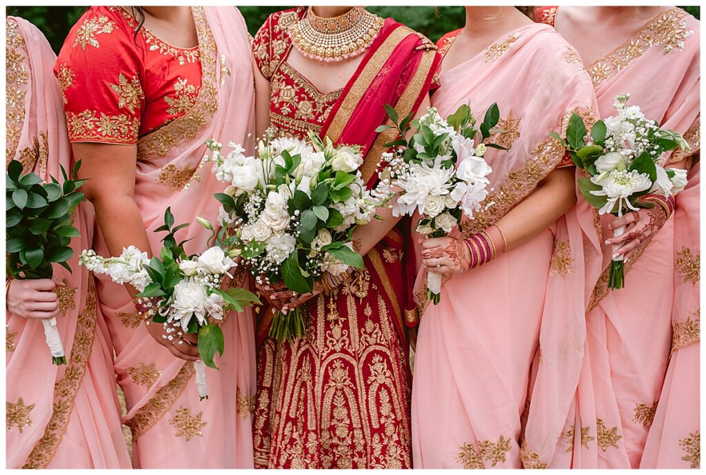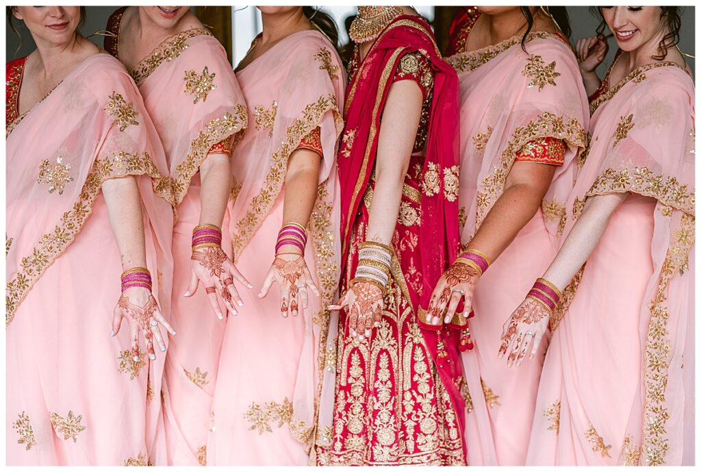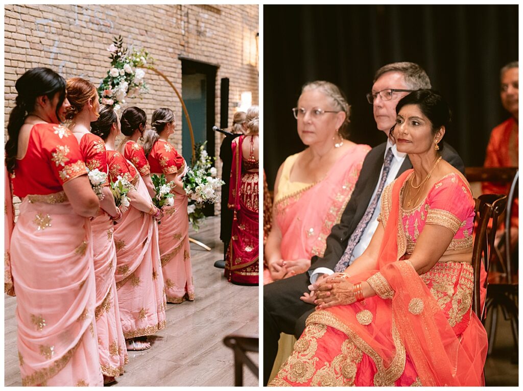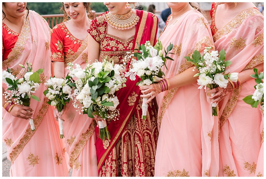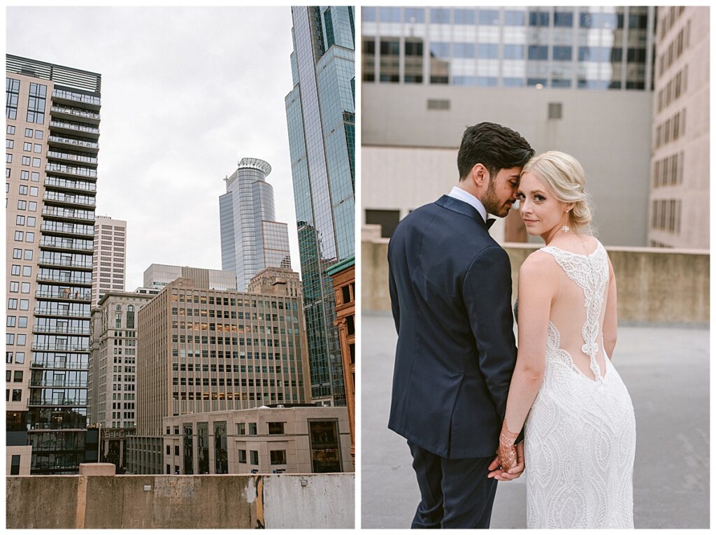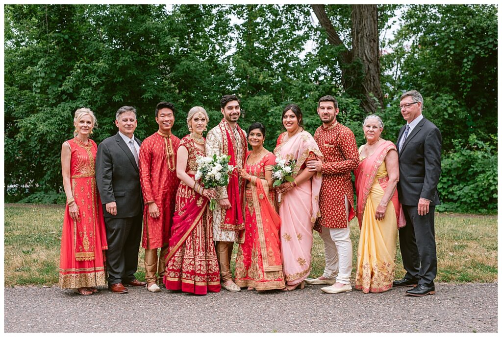 The women began the day getting ready at the Lumber Exchange bridal suite with Heather’s beautiful updo done by Lisa Nghiem of LHN Beauty and Make up completed by Belissimo Salon. The women then were helped into their Sari’s while the men also got dressed and ready for the day. Heather and Ryan had an emotional first look and then we headed to the Stone Arch Bridge with family and the wedding party for some city photos with Rent my Party Bus. Upon returning, guests began arriving with Erica of Piece of Cake Wedding Planning, making sure that everything was perfectly timed for the beautiful ceremony. Heather and Ryan exchanged rings and vows and then took the seven steps together as they vowed to support and love one another. They ended the ceremony by exchanging flower garlands.