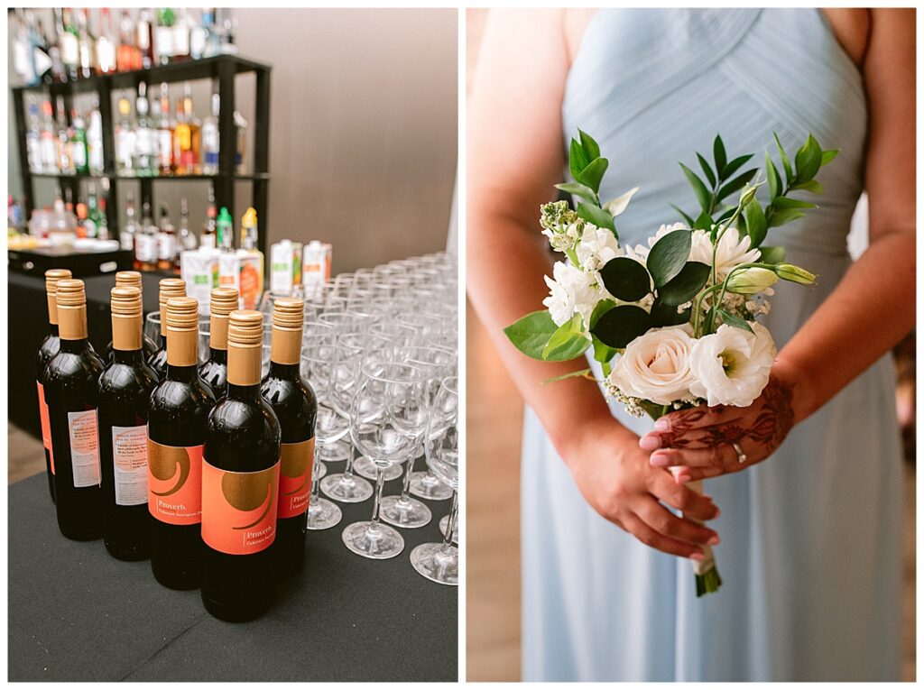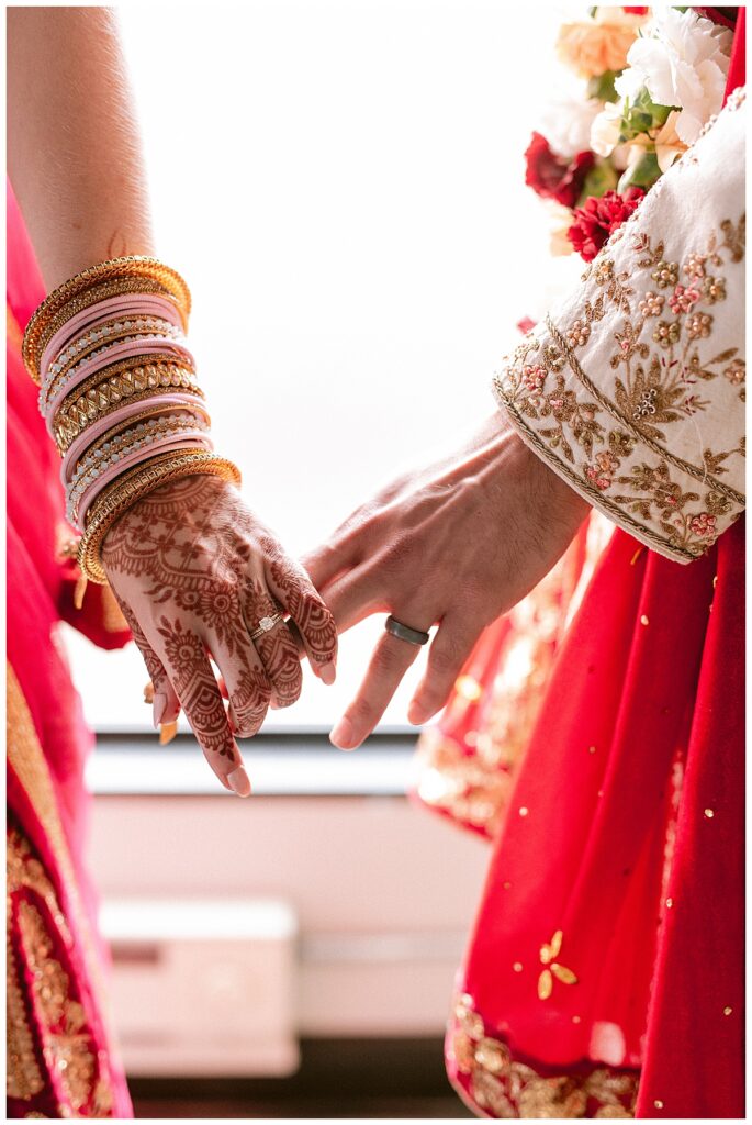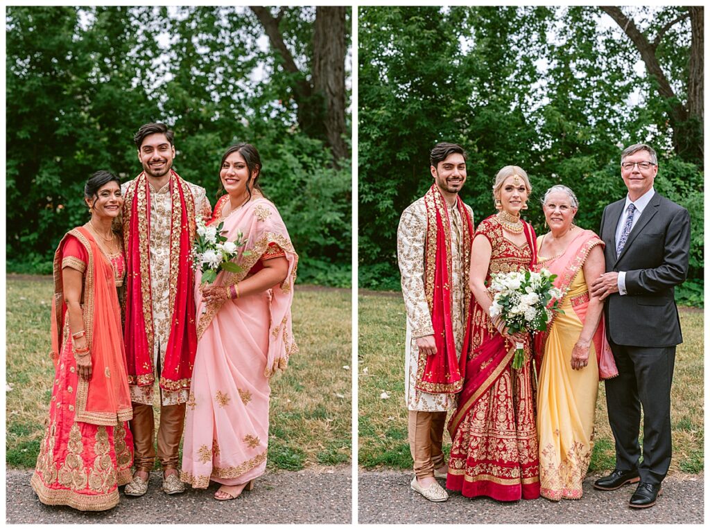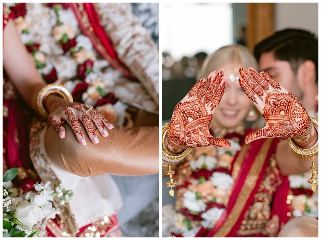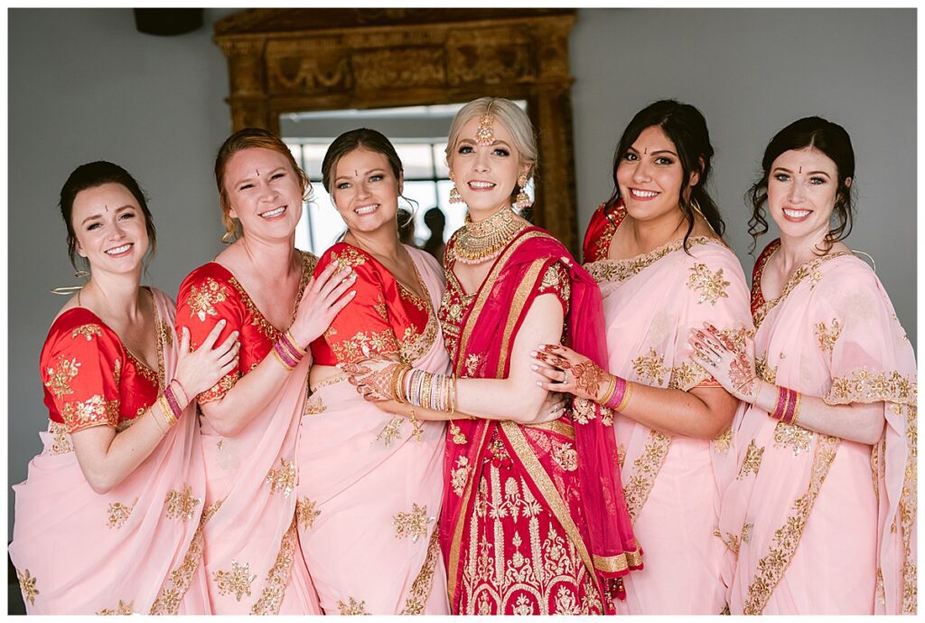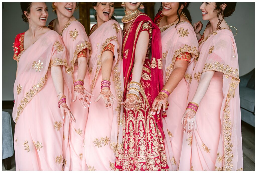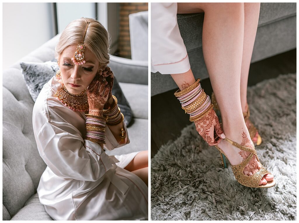 The women began the day getting ready at the Lumber Exchange bridal suite with Heather’s beautiful updo done by Lisa Nghiem of LHN Beauty and Make up completed by Belissimo Salon. The women then were helped into their Sari’s while the men also got dressed and ready for the day. Heather and Ryan had an emotional first look and then we headed to the Stone Arch Bridge with family and the wedding party for some city photos with Rent my Party Bus. Upon returning, guests began arriving with Erica of Piece of Cake Wedding Planning, making sure that everything was perfectly timed for the beautiful ceremony. Heather and Ryan exchanged rings and vows and then took the seven steps together as they vowed to support and love one another. They ended the ceremony by exchanging flower garlands.