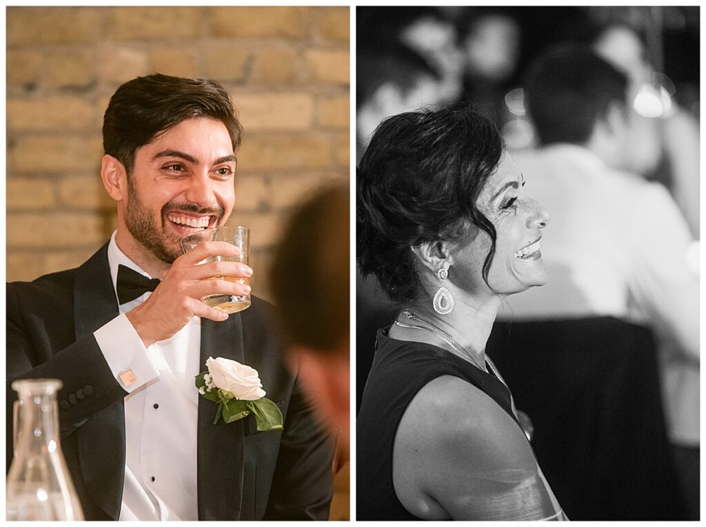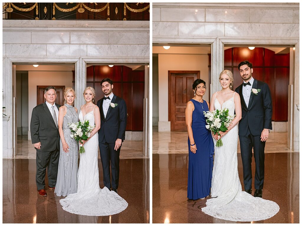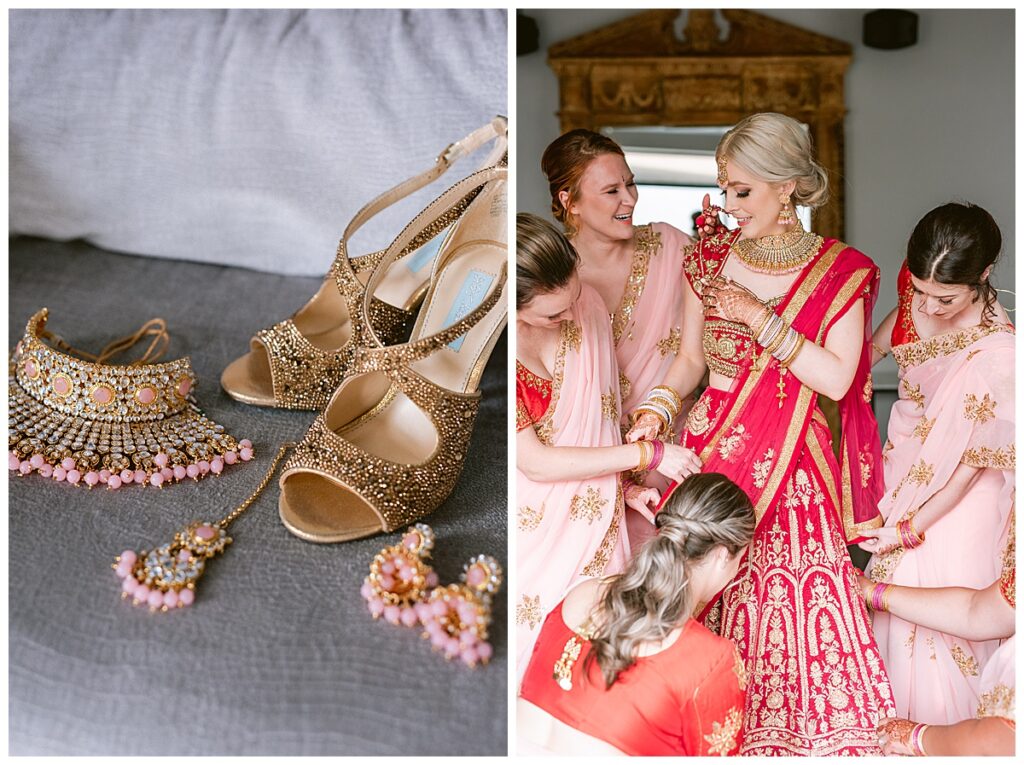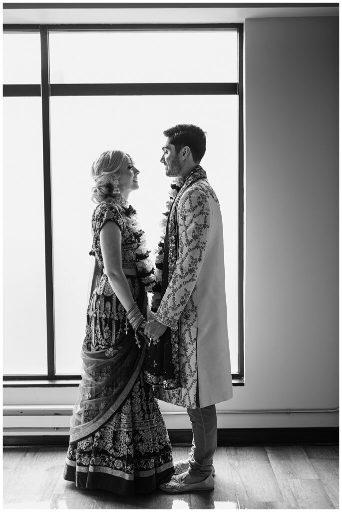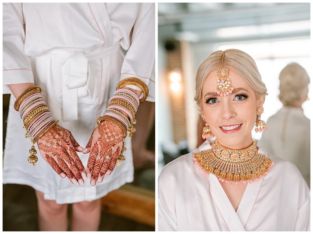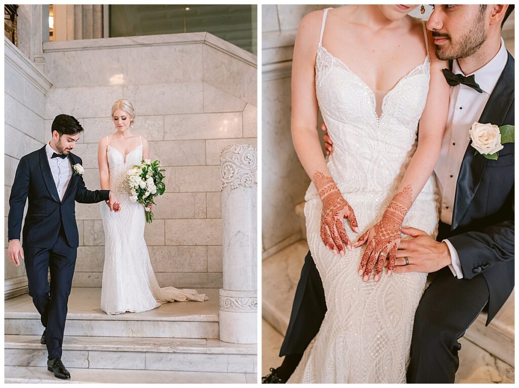 The women began the day getting ready at the Lumber Exchange bridal suite with Heather’s beautiful updo done by Lisa Nghiem of LHN Beauty and Make up completed by Belissimo Salon. The women then were helped into their Sari’s while the men also got dressed and ready for the day. Heather and Ryan had an emotional first look and then we headed to the Stone Arch Bridge with family and the wedding party for some city photos with Rent my Party Bus. Upon returning, guests began arriving with Erica of Piece of Cake Wedding Planning, making sure that everything was perfectly timed for the beautiful ceremony. Heather and Ryan exchanged rings and vows and then took the seven steps together as they vowed to support and love one another. They ended the ceremony by exchanging flower garlands.