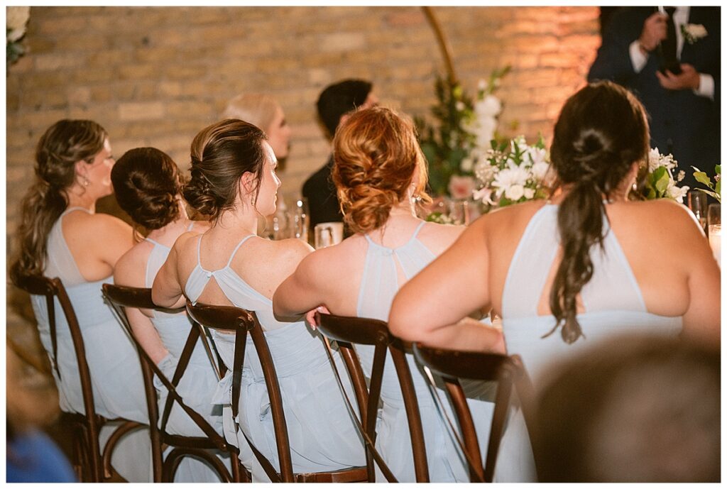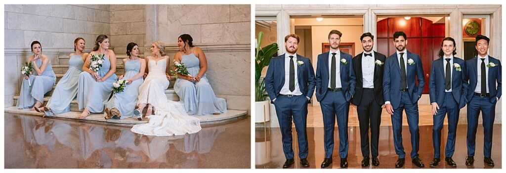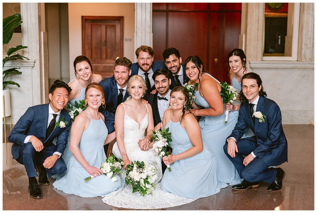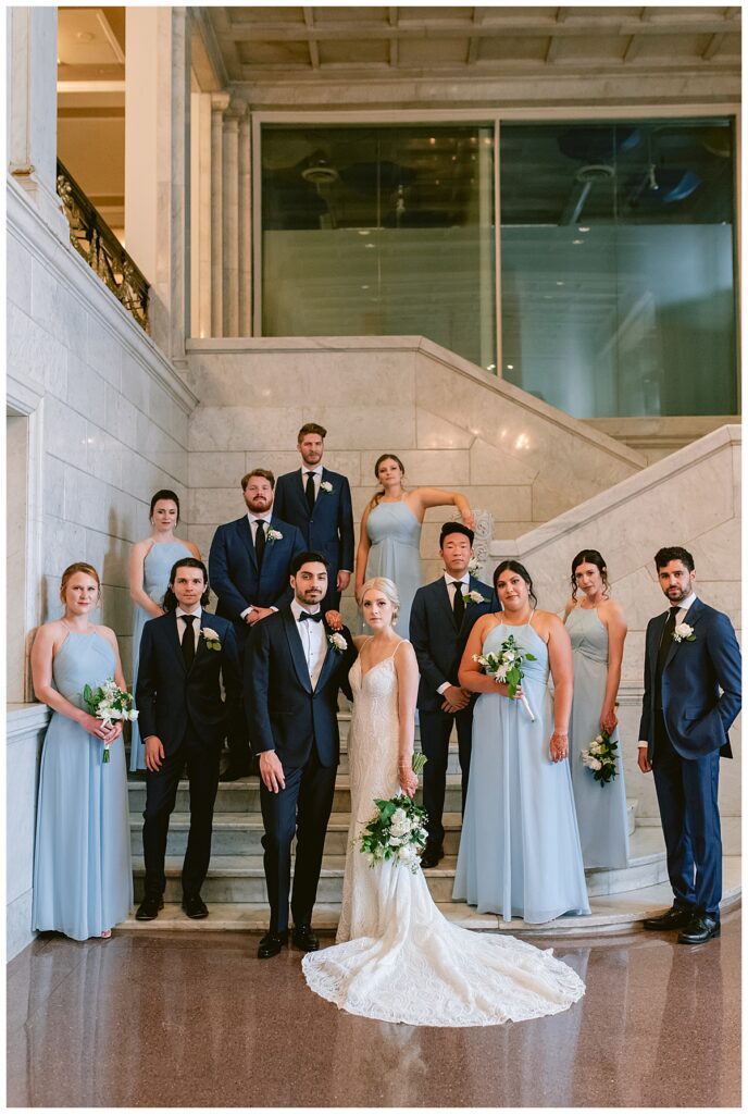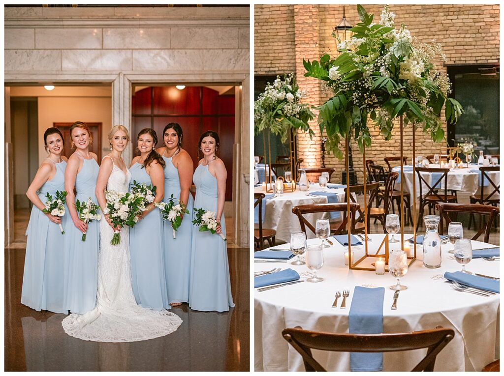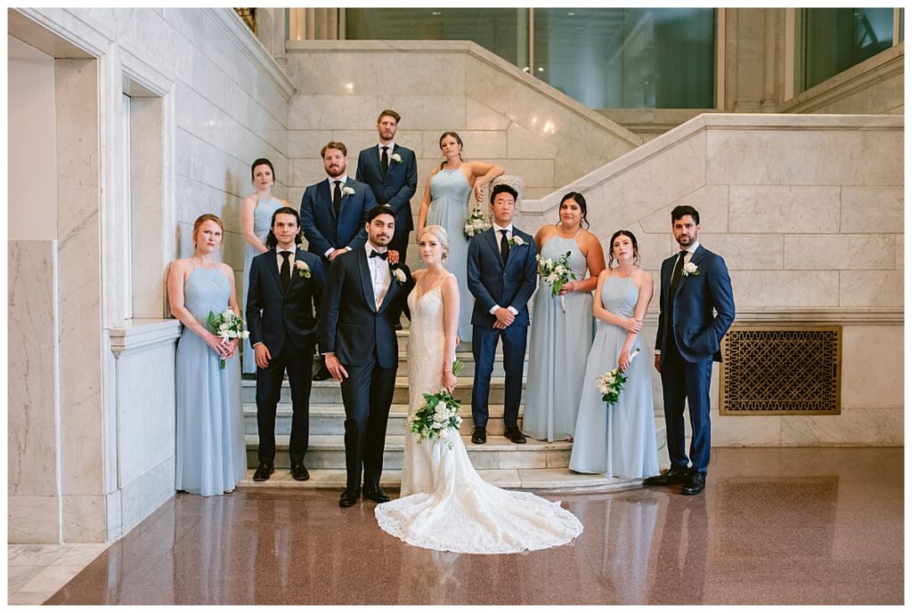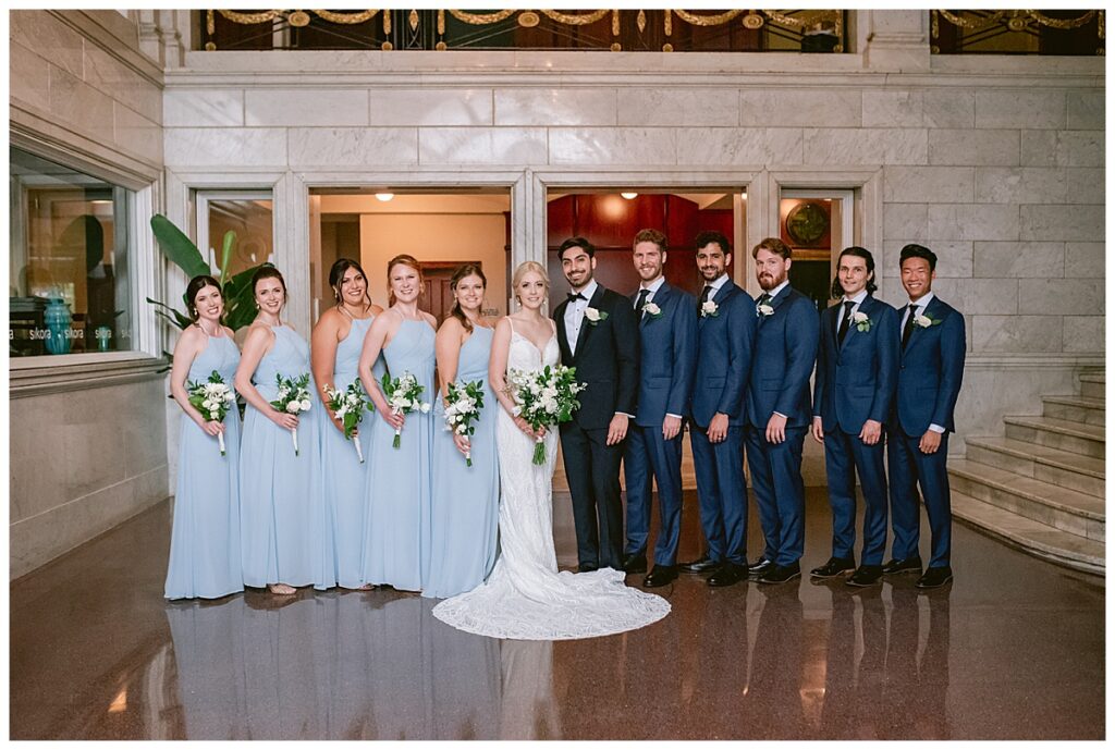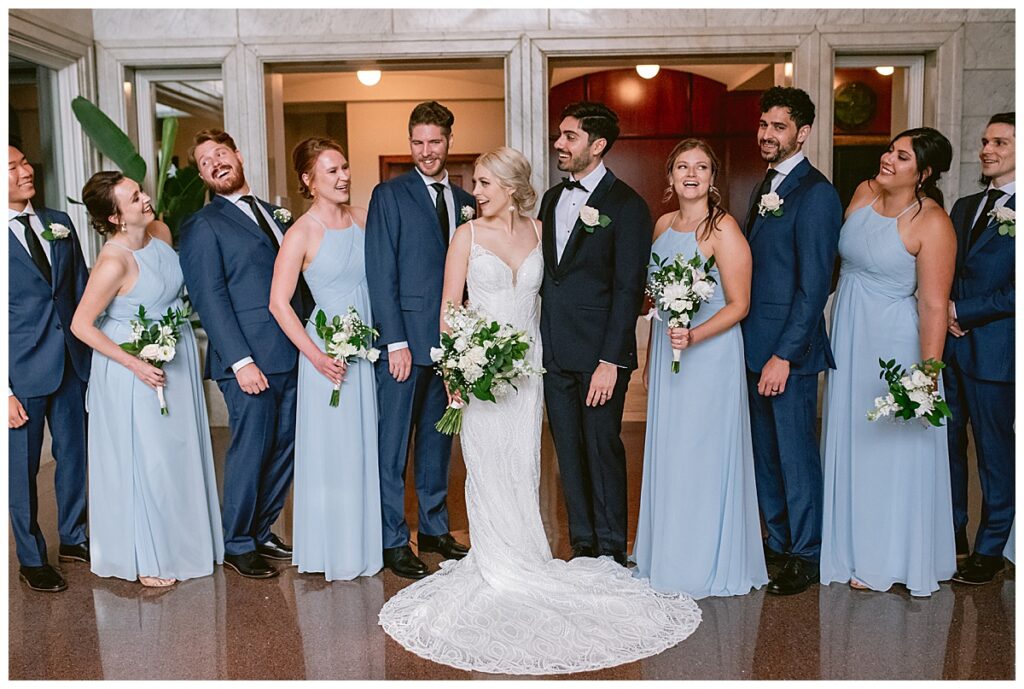 After the ceremony while guests conversed at Pourhouse for the social hour, Heather and Ryan proceeded to get into western attire. Heather in her beautiful gown from the Wedding Shoppe and Ryan in his sharp navy suit from Suit Supply. The couple chose to do a second first look and then the wedding party joined us for more formal photos. The light blue dresses from the Wedding Shoppe when paired with the bouquets that Heather created from the flowers at the Minneapolis Farmer’s Market looked stunning.