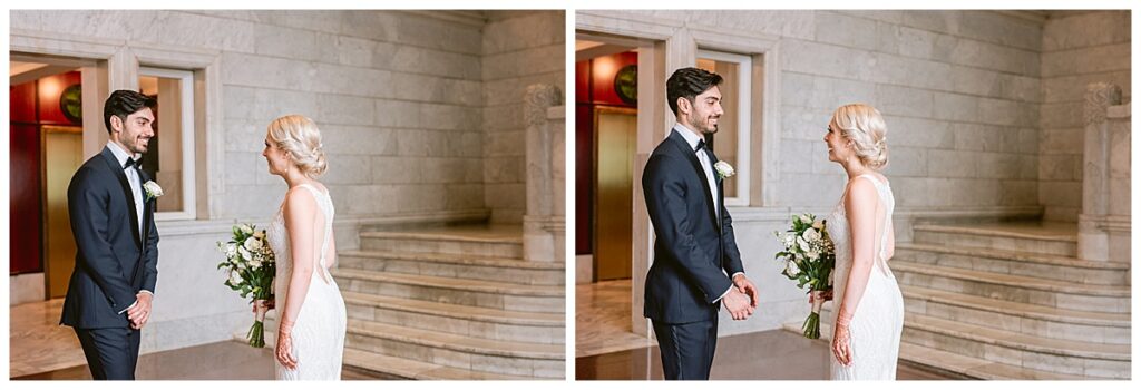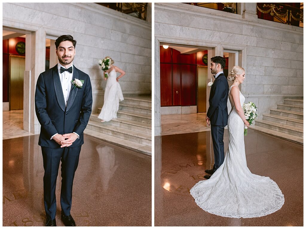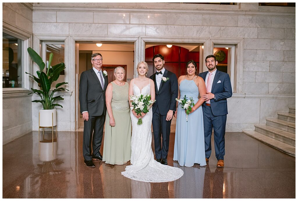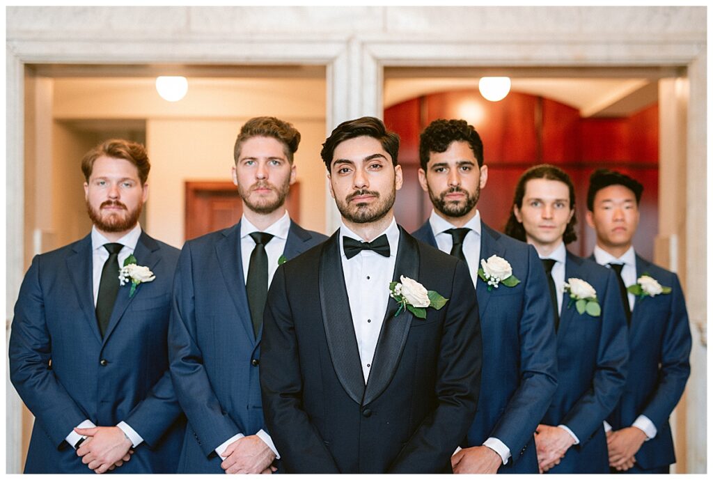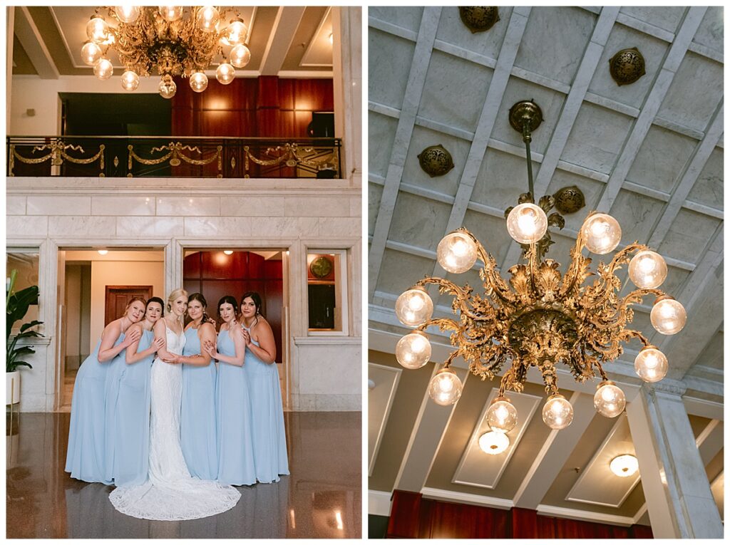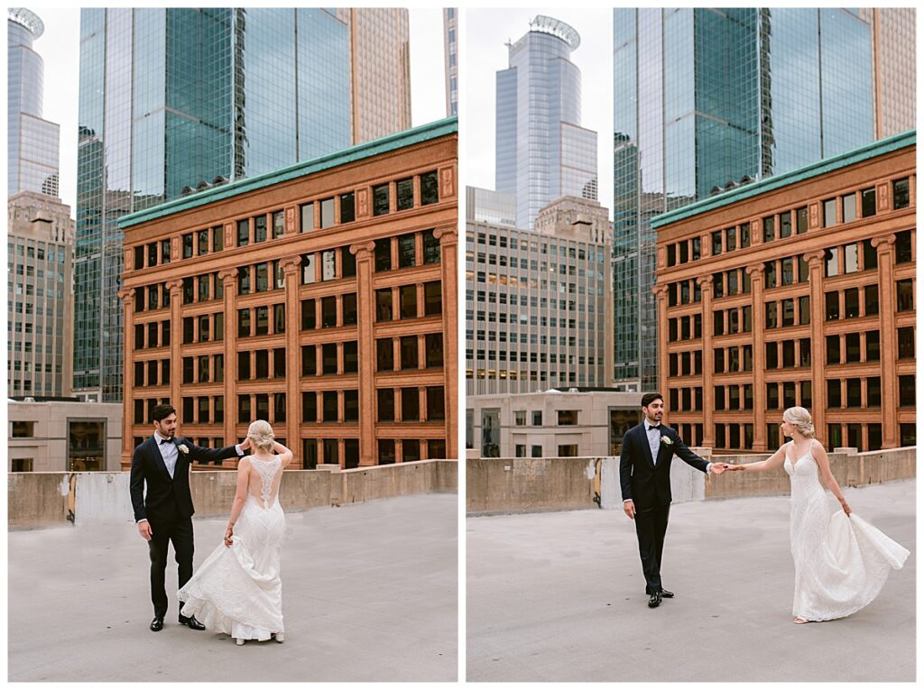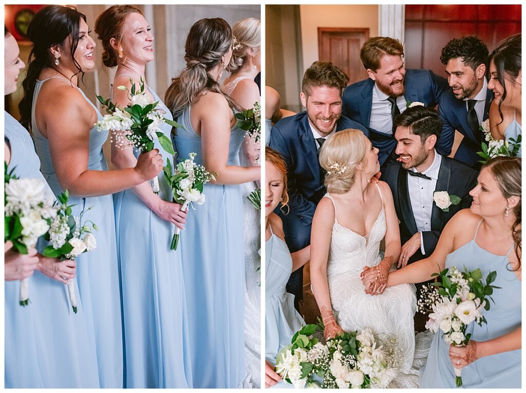 After the ceremony while guests conversed at Pourhouse for the social hour, Heather and Ryan proceeded to get into western attire. Heather in her beautiful gown from the Wedding Shoppe and Ryan in his sharp navy suit from Suit Supply. The couple chose to do a second first look and then the wedding party joined us for more formal photos. The light blue dresses from the Wedding Shoppe when paired with the bouquets that Heather created from the flowers at the Minneapolis Farmer’s Market looked stunning.