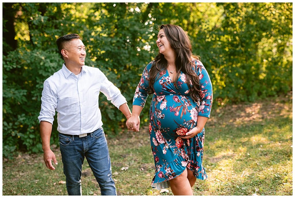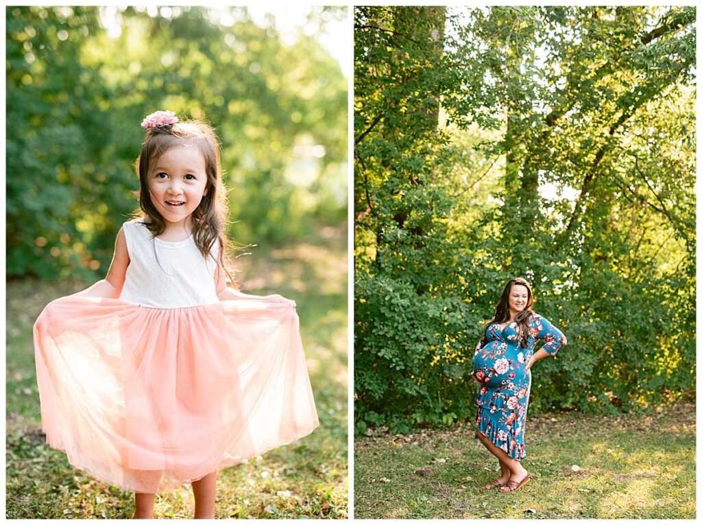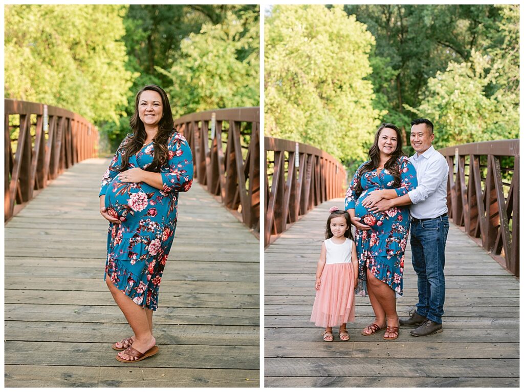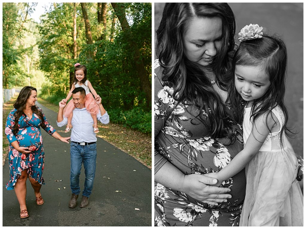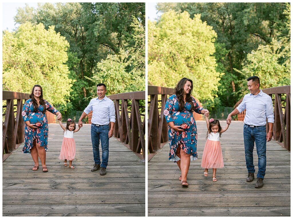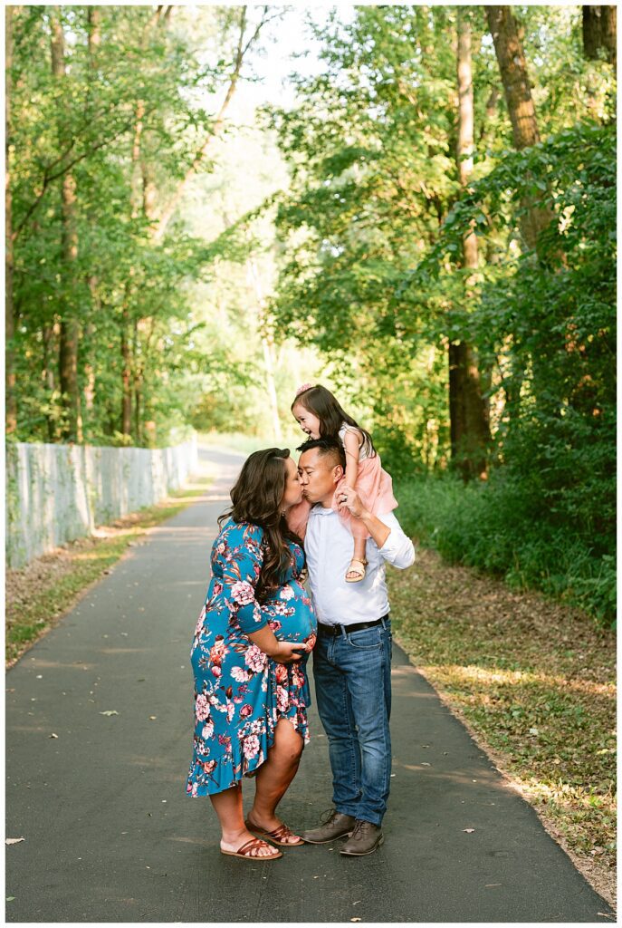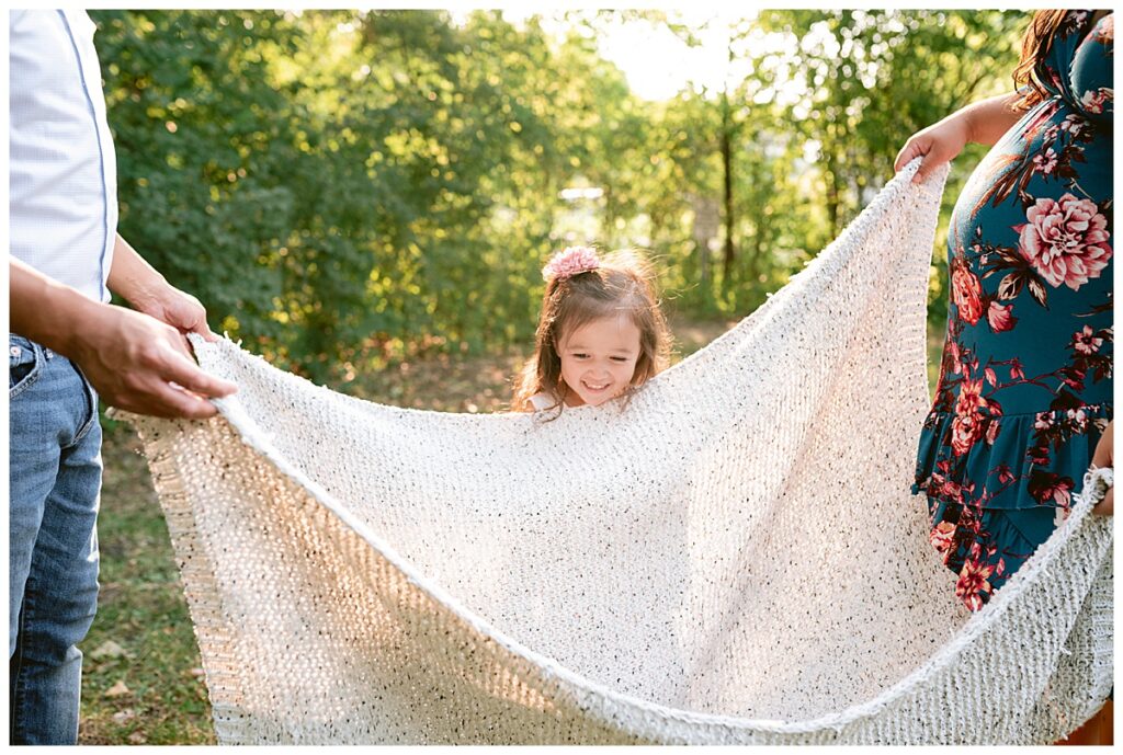 We chose park close to their home in Roseville where we did their first maternity session with their daughter. At that time we were dealing with the elements of winter, and this time around we had beautiful green grass and full trees. We wandered around the path for some shots of her and her husband, and then added her daughter to the mix. We played hide and seek with the blanket, ran in circles to kiss mommy and daddy and even sung to the baby.