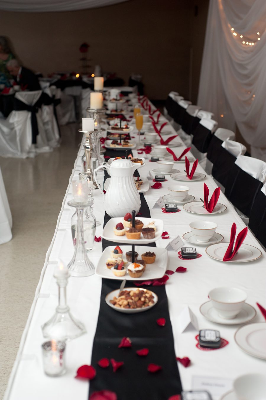 Ceiling draping, lights and table linens: Illuminations by Lori Cole