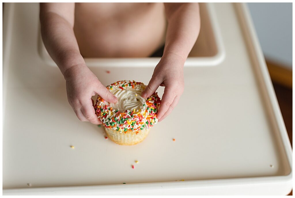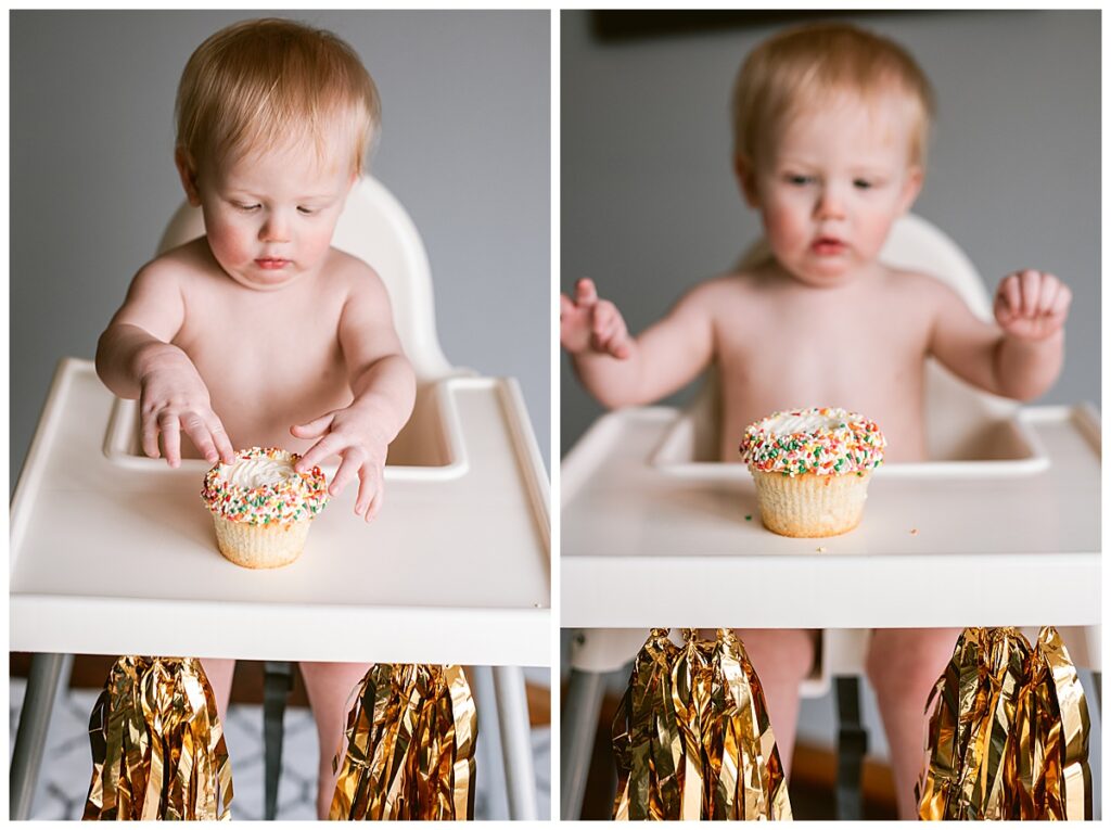 Meyer was so much fun to watch as Laura brought out his cupcake to smash. He started out tentatively and then moved into playing with the sprinkles and figuring out that it was good to eat!