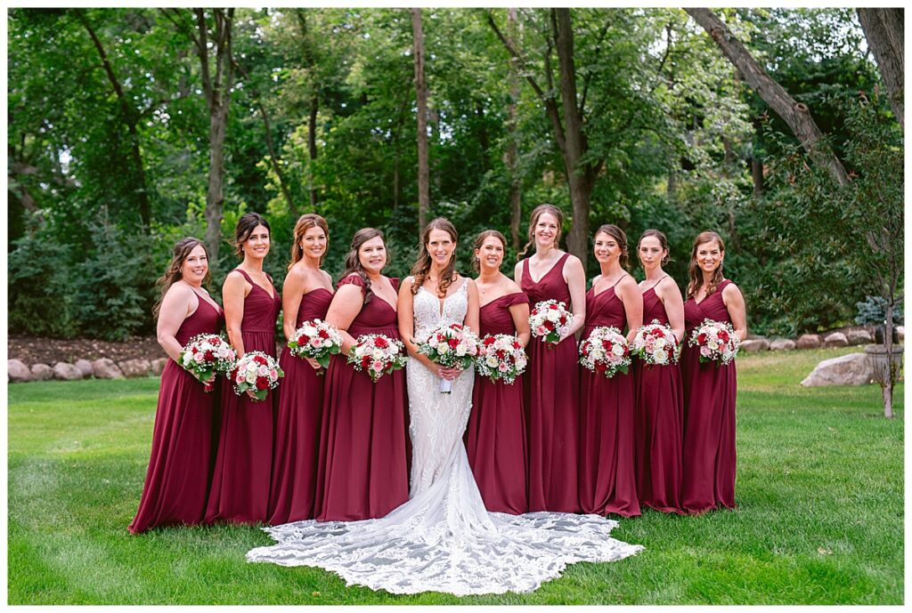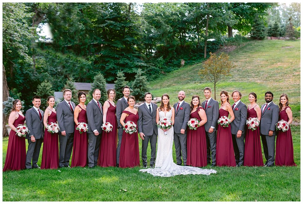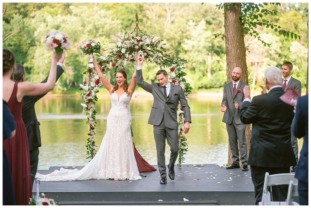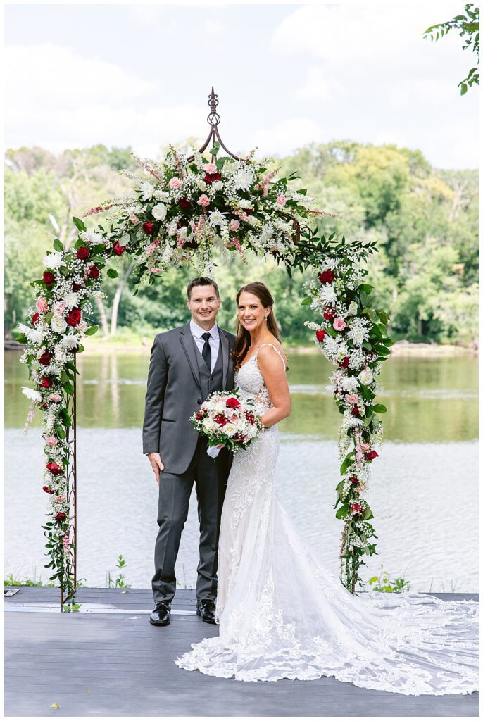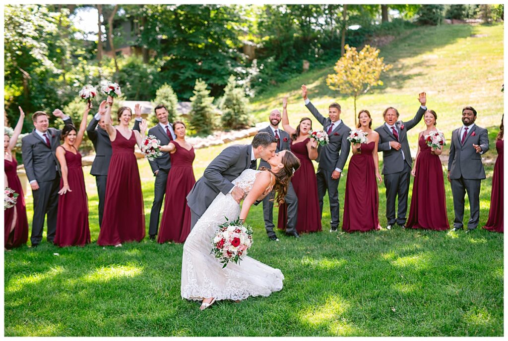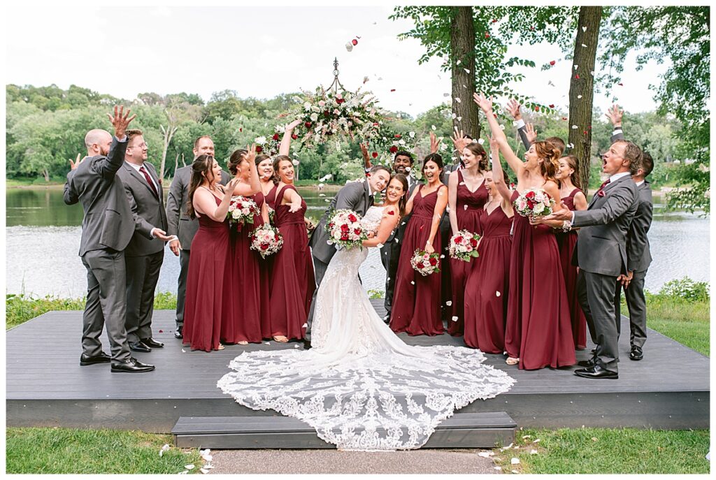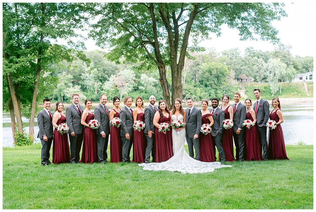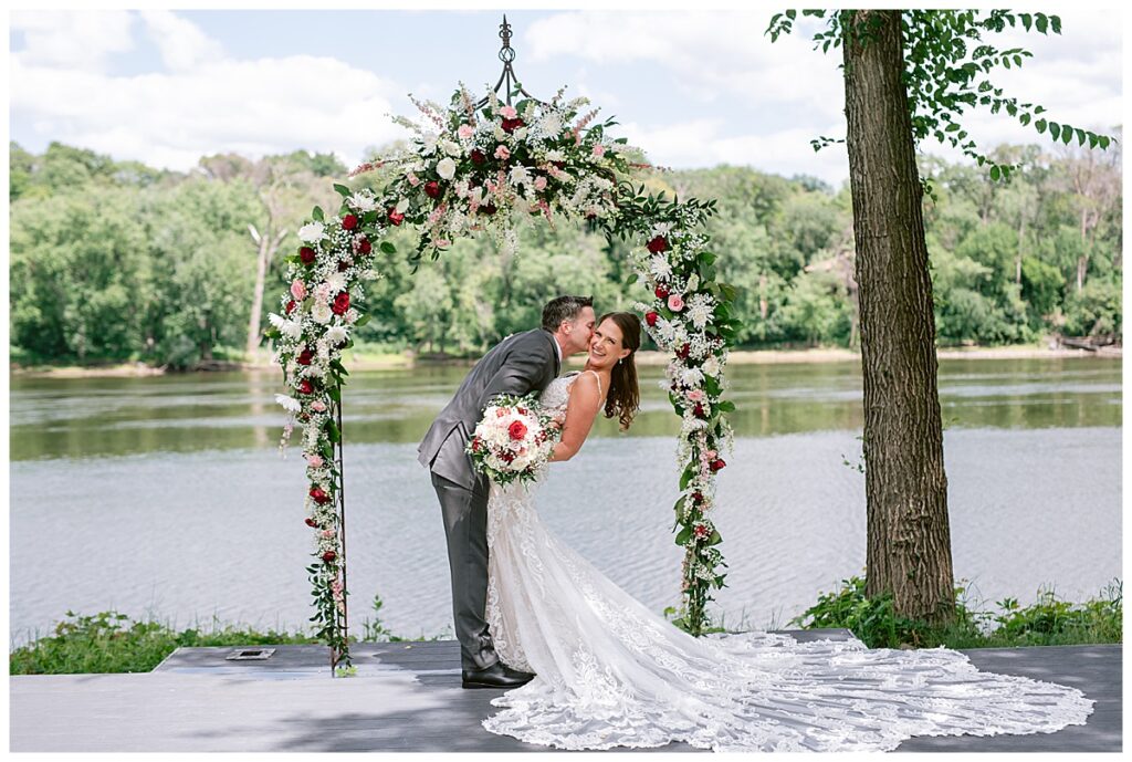 The wedding party, then joined them for photos with the bridesmaids, wearing beautiful burgundy dresses from Azazie. The groomsmen‘s looked dapper in their gray suits from Men’s Warehouse while Michelle Copeland of Custom Floral Designs, brought the look together with a beautiful array of flowers that contained burgundy, white, and babies breath. Both family’s then joined us for more photos on the beautiful property. Carrie and Steve were wed under a beautiful arbor of flowers along the Mississippi River. They exchanged rings from Wedding Day Diamonds and then were announced husband and wife in front of family and friends. Guests welcome them at their cocktail hour where signature drinks of sidecars and Mojito‘s were served along with tasty appetizers from Mintahoe Catering and Events. Carrie and Steve welcomed guess by doing their first dance as they were announced and then everyone had dinner as they listened to speeches from the best Man and maid of honor. Buttercream wedding cakes provided a beautiful cake and Alex night with Instant Request DJ got the party started and Bill from Peterson Brothers productions caught the entire day on film.