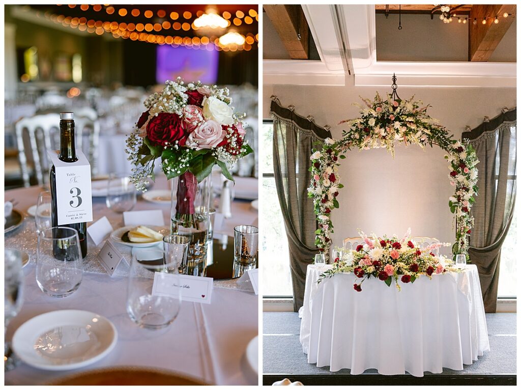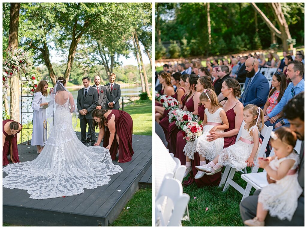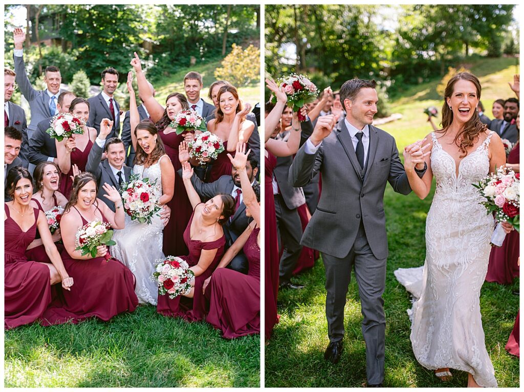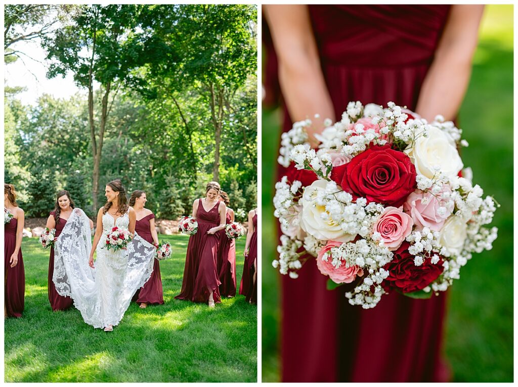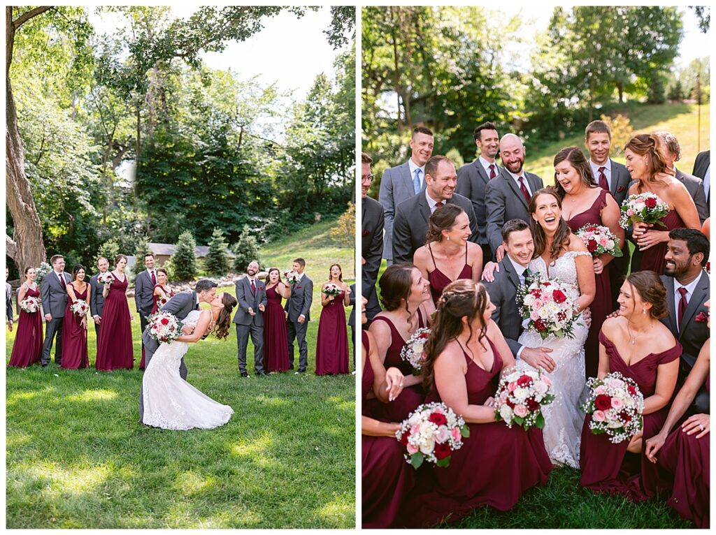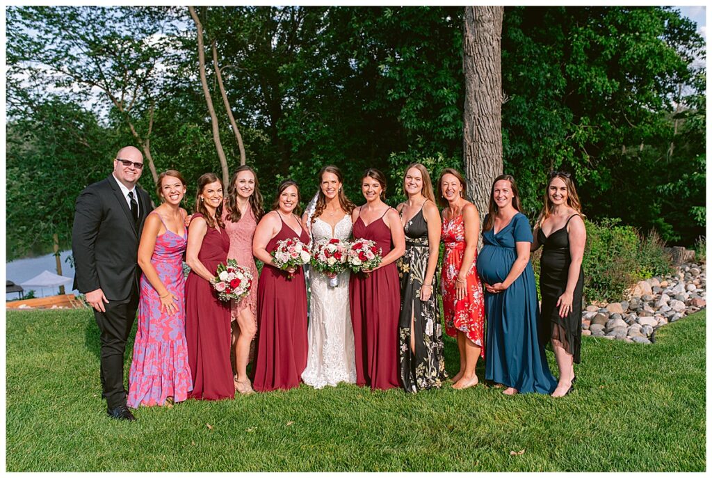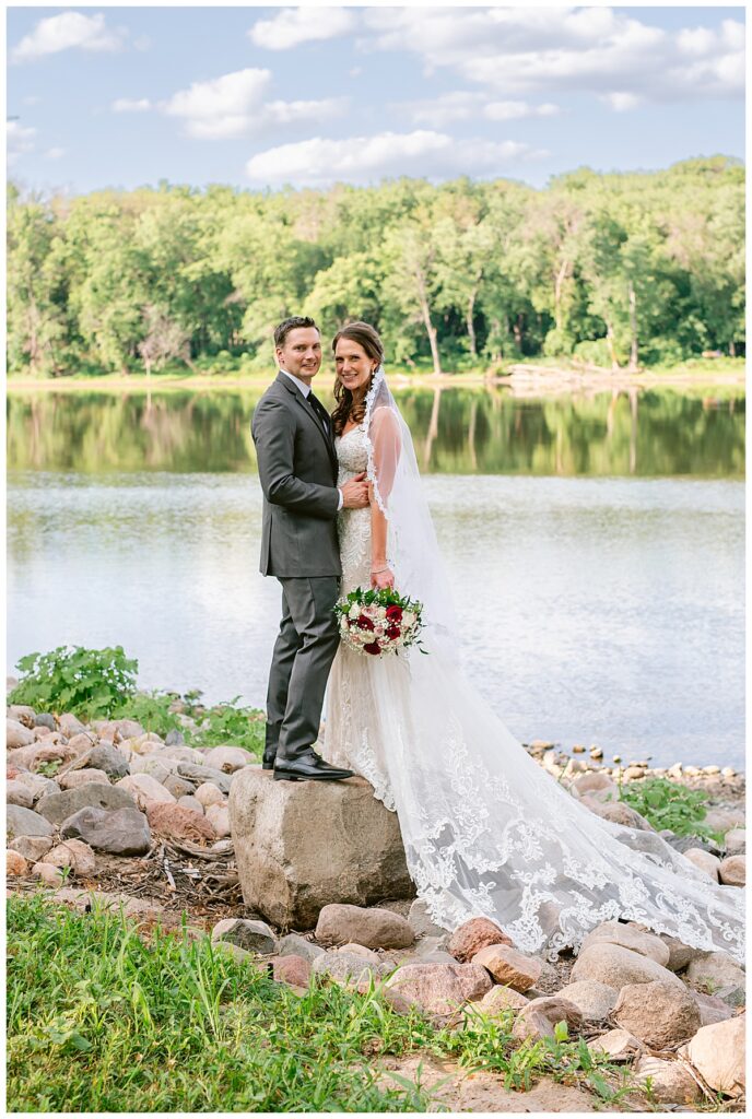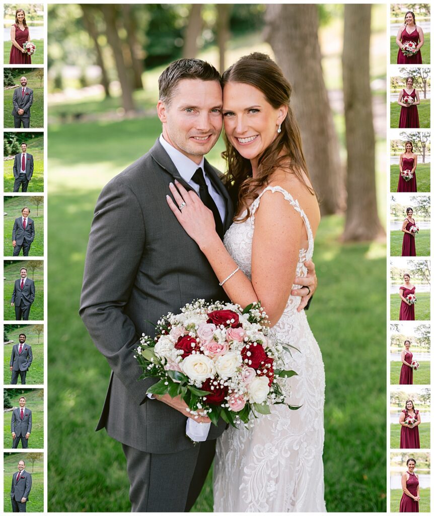 The wedding party, then joined them for photos with the bridesmaids, wearing beautiful burgundy dresses from Azazie. The groomsmen‘s looked dapper in their gray suits from Men’s Warehouse while Michelle Copeland of Custom Floral Designs, brought the look together with a beautiful array of flowers that contained burgundy, white, and babies breath. Both family’s then joined us for more photos on the beautiful property. Carrie and Steve were wed under a beautiful arbor of flowers along the Mississippi River. They exchanged rings from Wedding Day Diamonds and then were announced husband and wife in front of family and friends. Guests welcome them at their cocktail hour where signature drinks of sidecars and Mojito‘s were served along with tasty appetizers from Mintahoe Catering and Events. Carrie and Steve welcomed guess by doing their first dance as they were announced and then everyone had dinner as they listened to speeches from the best Man and maid of honor. Buttercream wedding cakes provided a beautiful cake and Alex night with Instant Request DJ got the party started and Bill from Peterson Brothers productions caught the entire day on film.