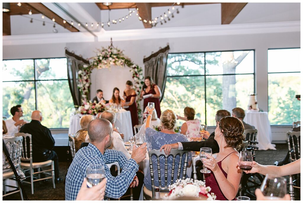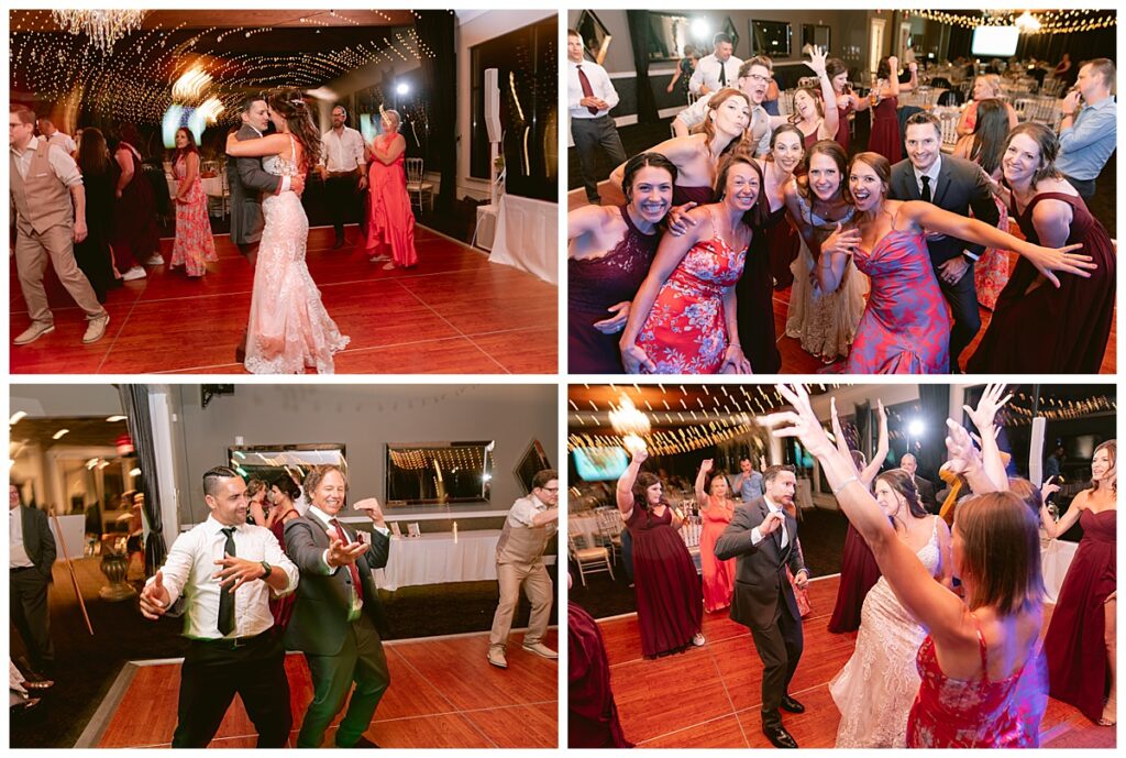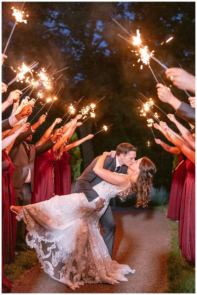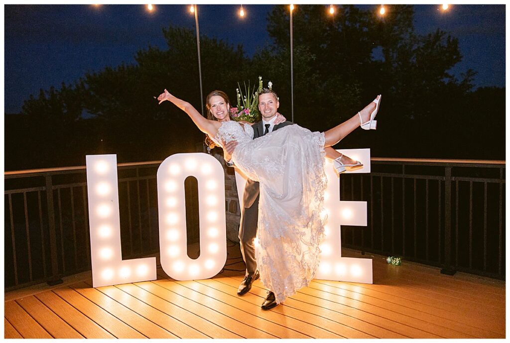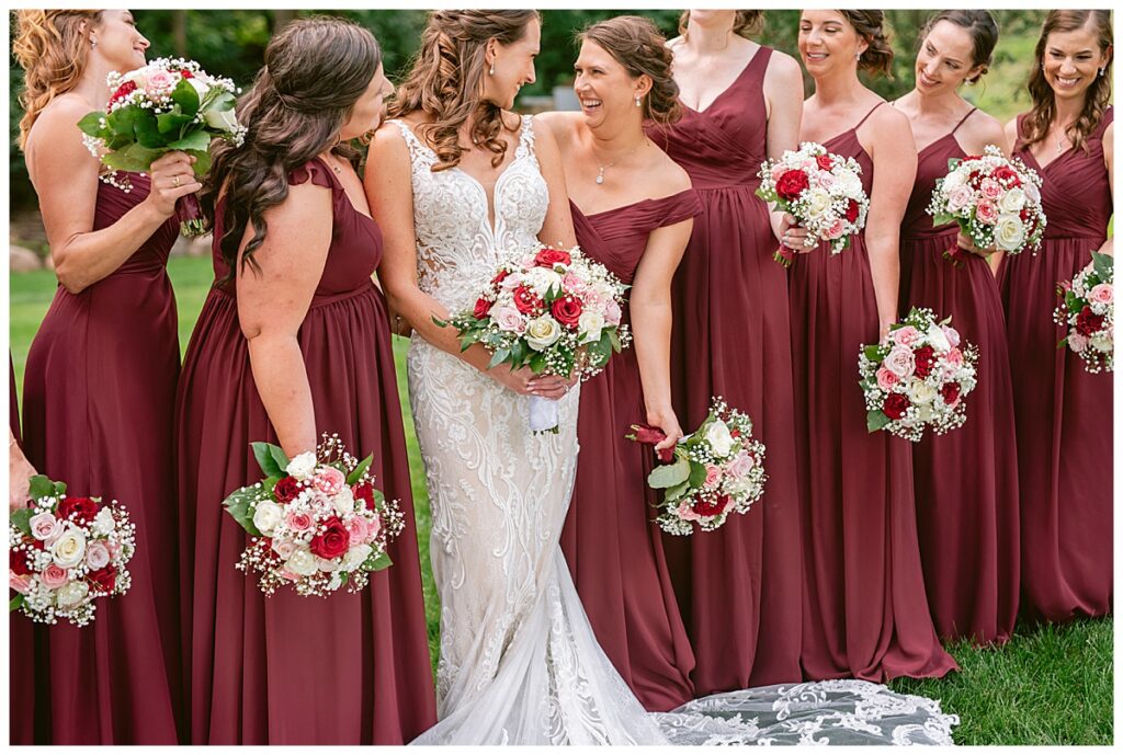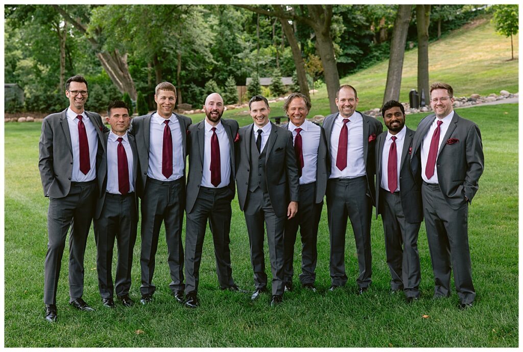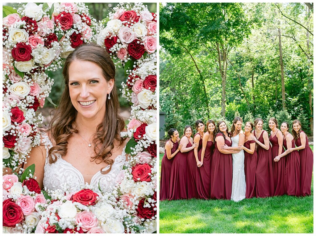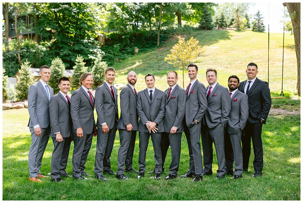 The wedding party, then joined them for photos with the bridesmaids, wearing beautiful burgundy dresses from Azazie. The groomsmen‘s looked dapper in their gray suits from Men’s Warehouse while Michelle Copeland of Custom Floral Designs, brought the look together with a beautiful array of flowers that contained burgundy, white, and babies breath. Both family’s then joined us for more photos on the beautiful property. Carrie and Steve were wed under a beautiful arbor of flowers along the Mississippi River. They exchanged rings from Wedding Day Diamonds and then were announced husband and wife in front of family and friends. Guests welcome them at their cocktail hour where signature drinks of sidecars and Mojito‘s were served along with tasty appetizers from Mintahoe Catering and Events. Carrie and Steve welcomed guess by doing their first dance as they were announced and then everyone had dinner as they listened to speeches from the best Man and maid of honor. Buttercream wedding cakes provided a beautiful cake and Alex night with Instant Request DJ got the party started and Bill from Peterson Brothers productions caught the entire day on film.