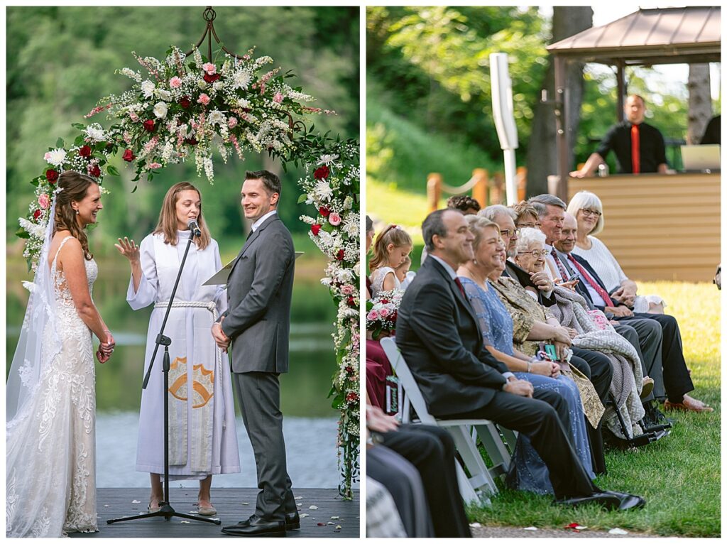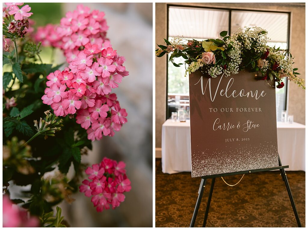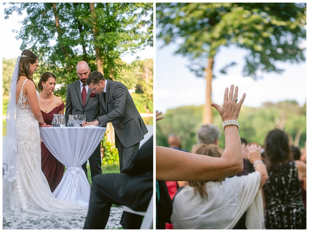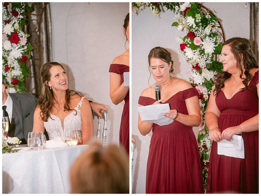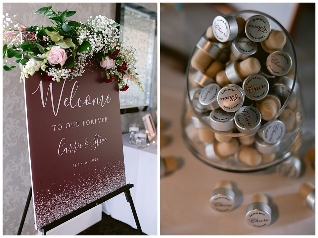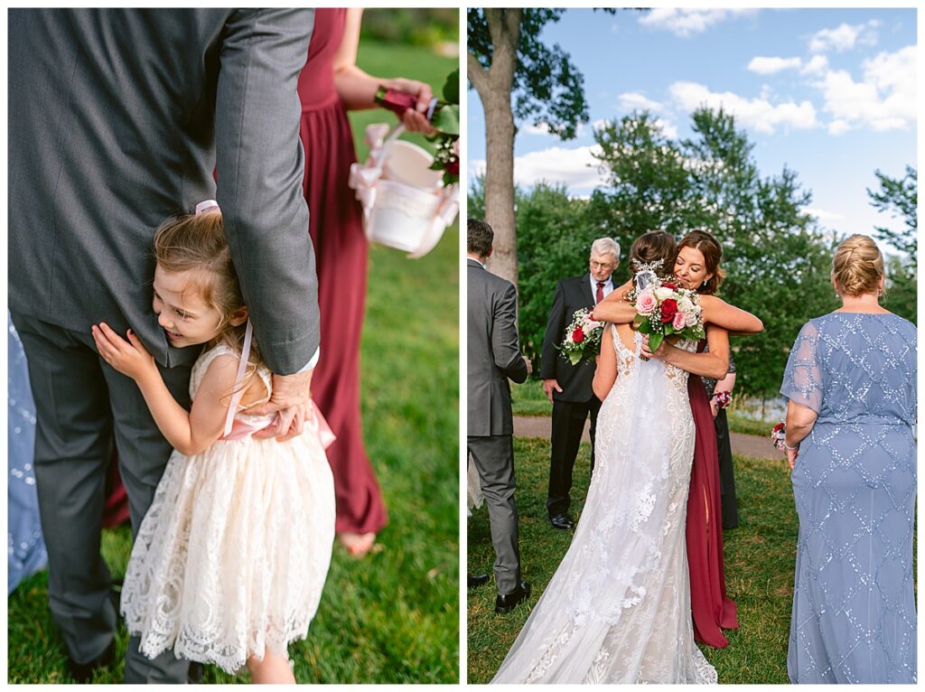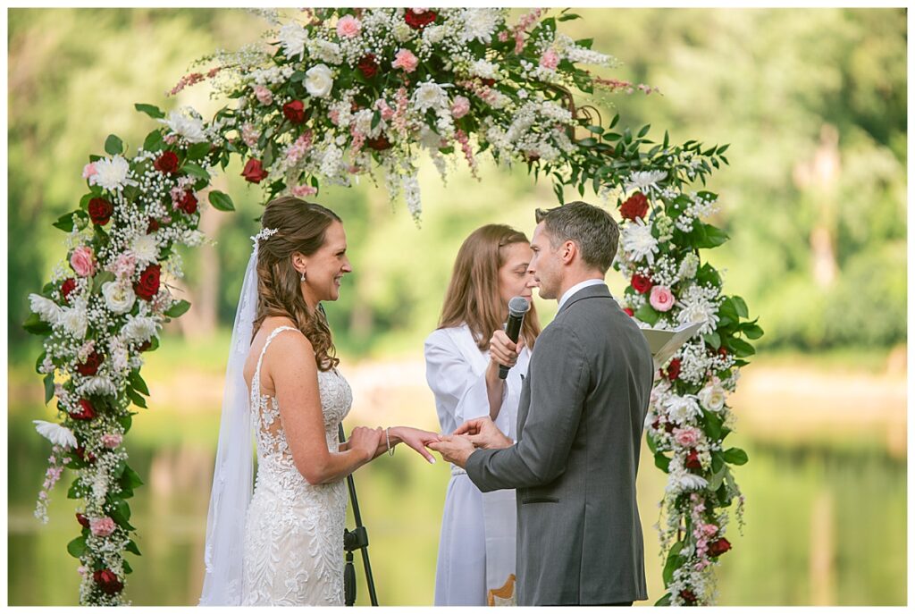 The wedding party, then joined them for photos with the bridesmaids, wearing beautiful burgundy dresses from Azazie. The groomsmen‘s looked dapper in their gray suits from Men’s Warehouse while Michelle Copeland of Custom Floral Designs, brought the look together with a beautiful array of flowers that contained burgundy, white, and babies breath. Both family’s then joined us for more photos on the beautiful property. Carrie and Steve were wed under a beautiful arbor of flowers along the Mississippi River. They exchanged rings from Wedding Day Diamonds and then were announced husband and wife in front of family and friends. Guests welcome them at their cocktail hour where signature drinks of sidecars and Mojito‘s were served along with tasty appetizers from Mintahoe Catering and Events. Carrie and Steve welcomed guess by doing their first dance as they were announced and then everyone had dinner as they listened to speeches from the best Man and maid of honor. Buttercream wedding cakes provided a beautiful cake and Alex night with Instant Request DJ got the party started and Bill from Peterson Brothers productions caught the entire day on film.