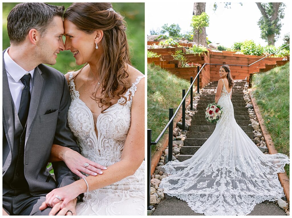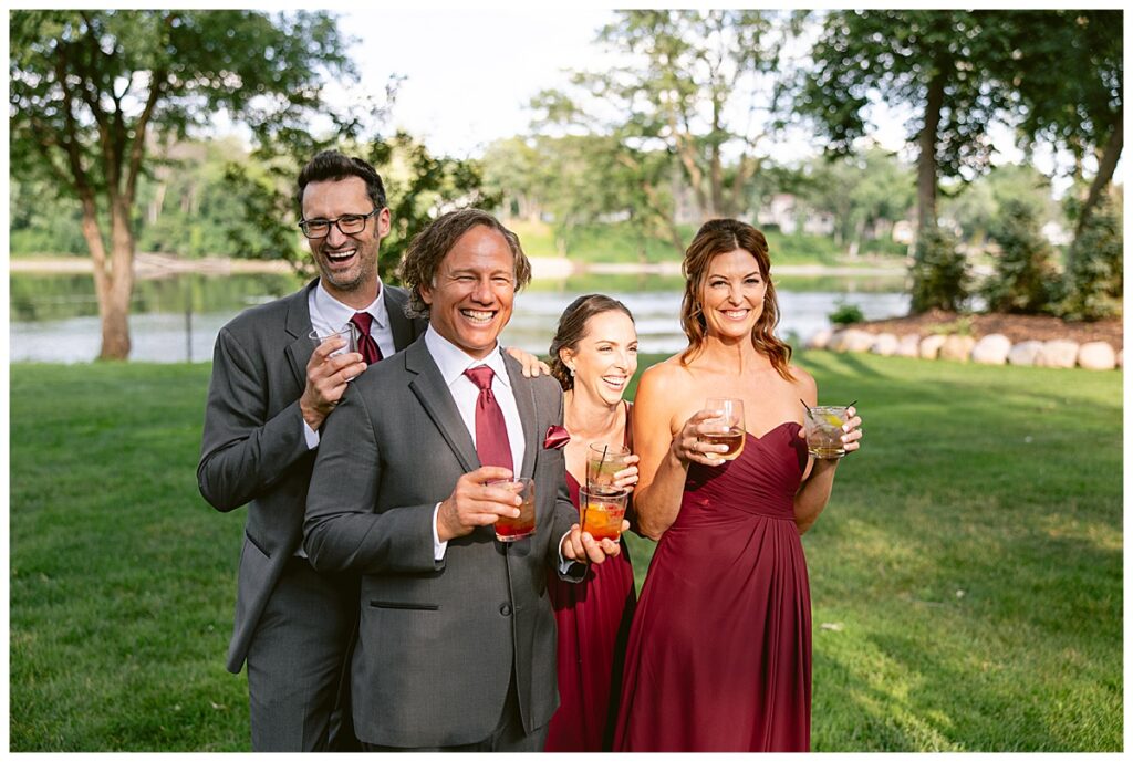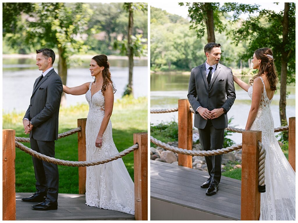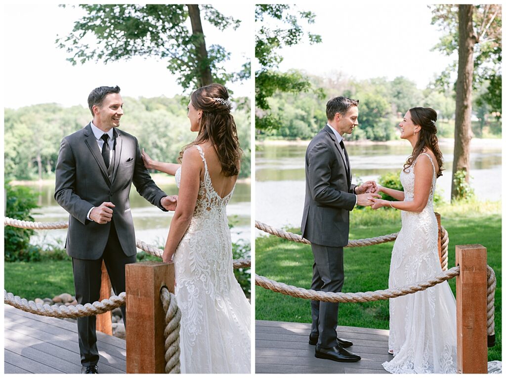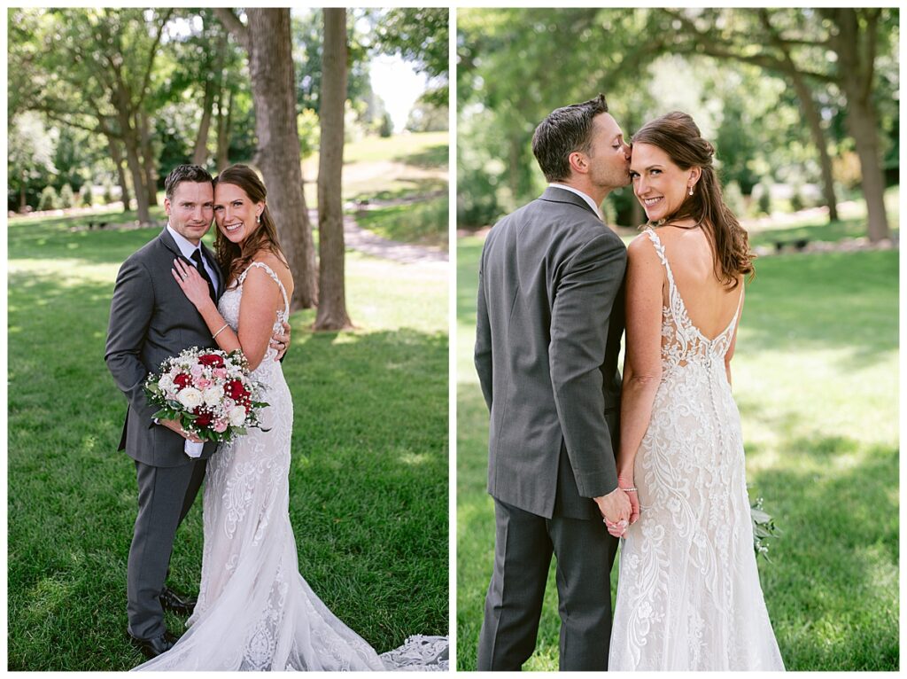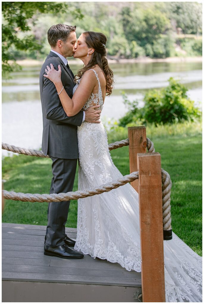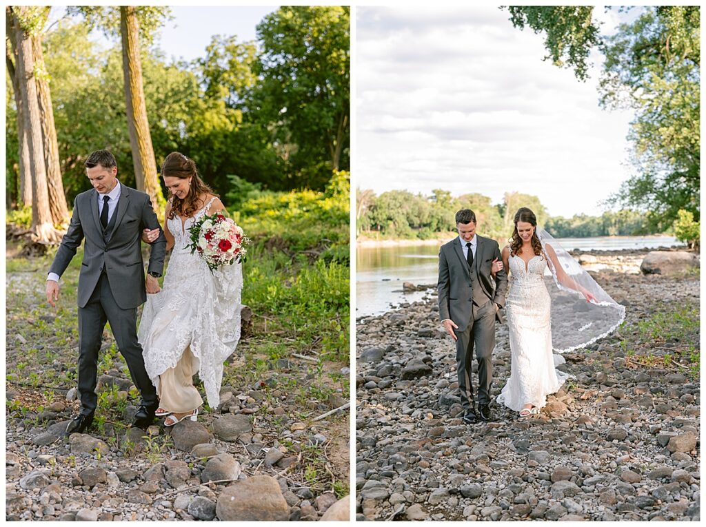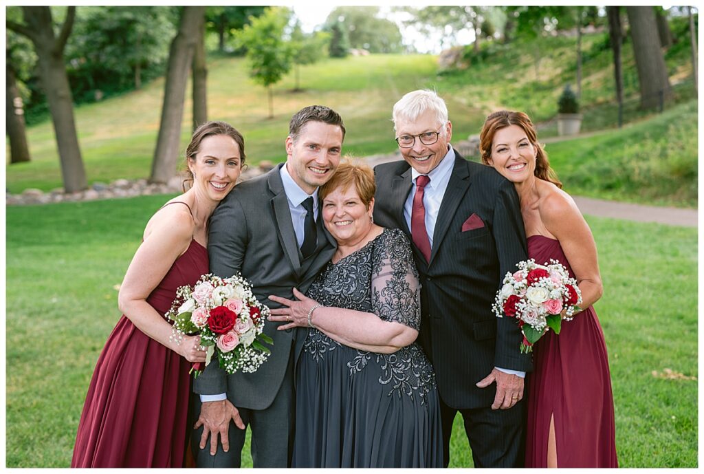 After a surprise proposal in Cabo, Mexico, Steve and Carrie began planning their July wedding. Because they both love the heat and being outdoors, they decided to host their wedding at Leopold’s Mississippi Gardens in Minneapolis. The day began with the ladies getting ready at the venue. Summer from Glamour Beauty created a beautiful updo for Carrie while Taylor from Taylor Marie Beauty provided make up for all of the bridesmaids. Carrie then got into her beautiful Martina Liana dress purchased from Raffine Bridal and then went out to meet Steve for their first look.
