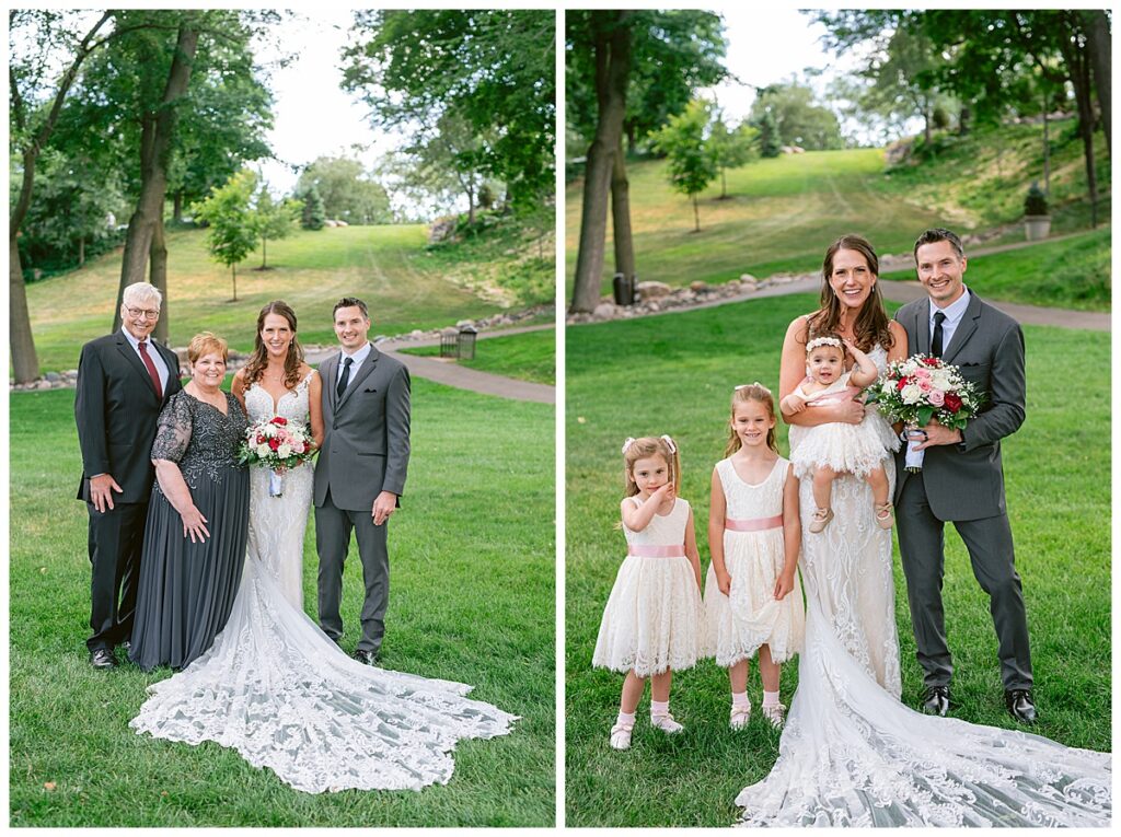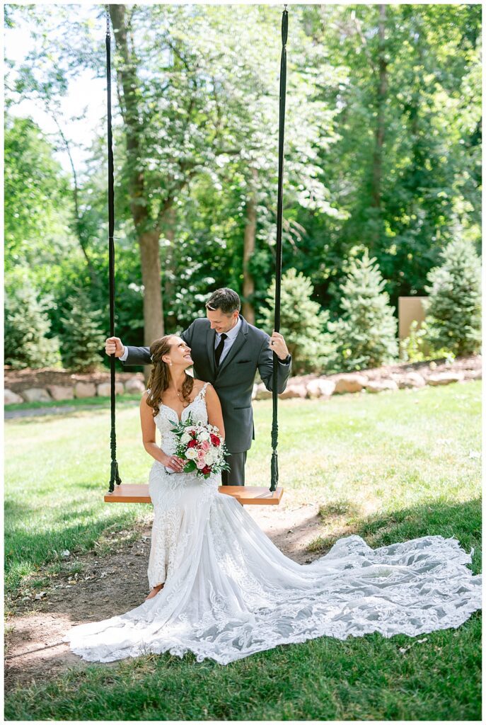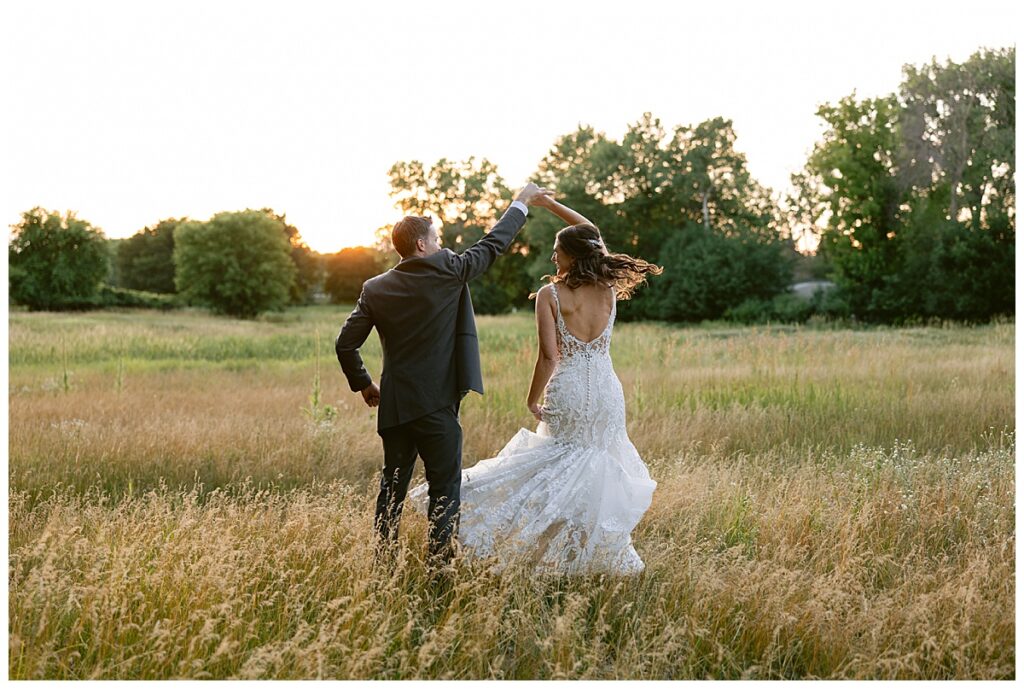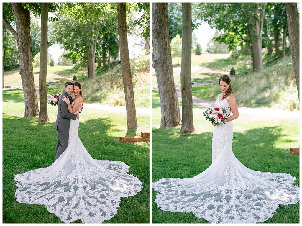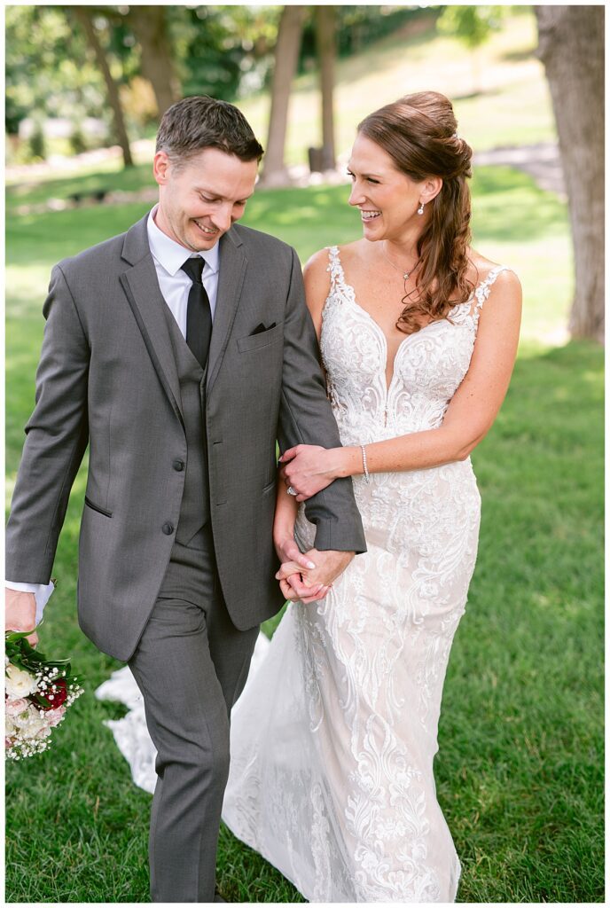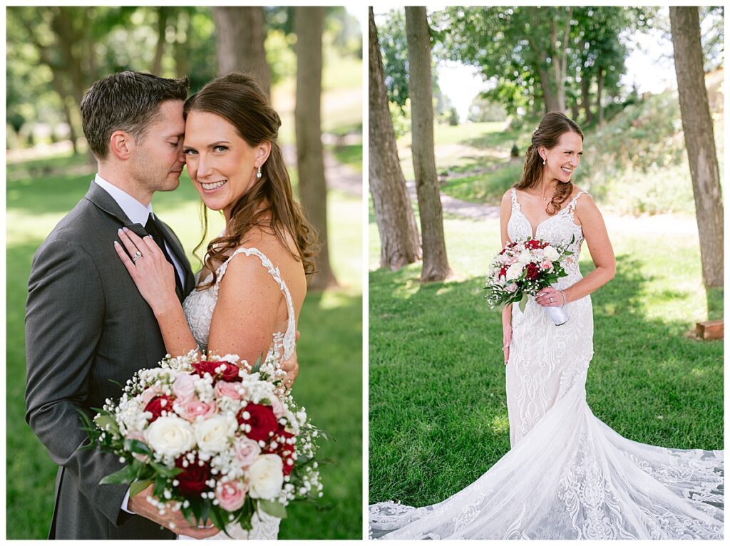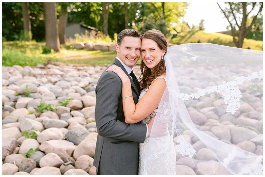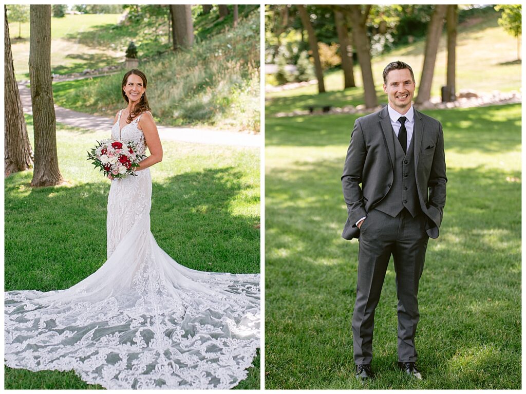 After a surprise proposal in Cabo, Mexico, Steve and Carrie began planning their July wedding. Because they both love the heat and being outdoors, they decided to host their wedding at Leopold’s Mississippi Gardens in Minneapolis. The day began with the ladies getting ready at the venue. Summer from Glamour Beauty created a beautiful updo for Carrie while Taylor from Taylor Marie Beauty provided make up for all of the bridesmaids. Carrie then got into her beautiful Martina Liana dress purchased from Raffine Bridal and then went out to meet Steve for their first look.