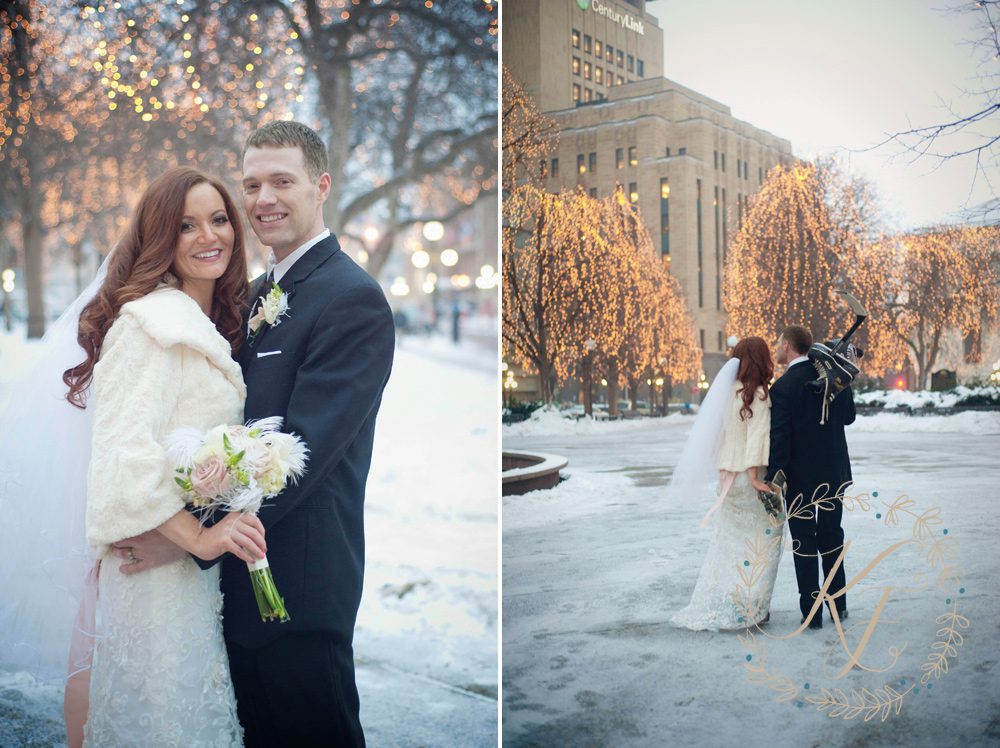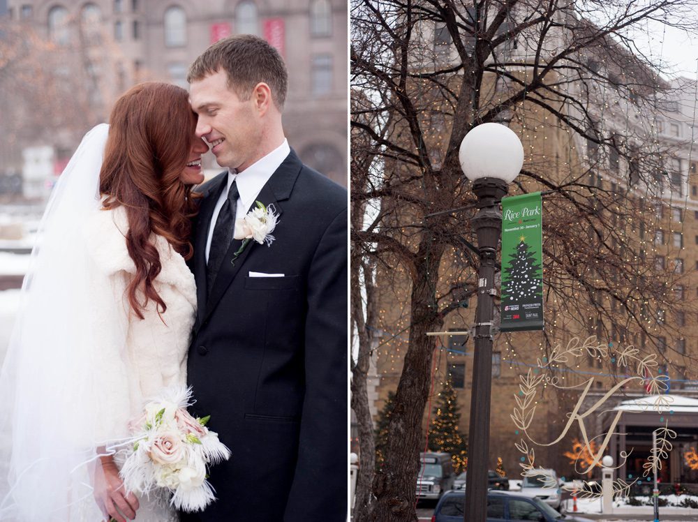 Wanting to make the wedding more about their community, the couple asked family, friends and members of their significant communities at work to participate in their wedding day. The two chose to forgo a wedding party and focused on adding high school students that Molly taught to play during the ceremony, a spoken word artist to create and read a poem about the couple, and brought in Molly’s Irish roots with an Irish Brigade band. Being that Nate grew up in St. Paul, they chose to have their photos done in Rice park. Nate pulled along his hockey equipment and the two took to the ice in Rice Park.