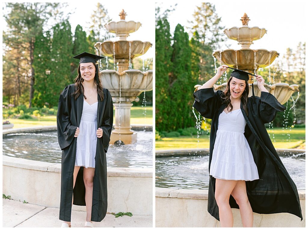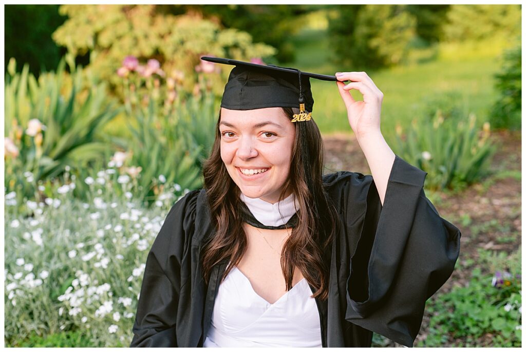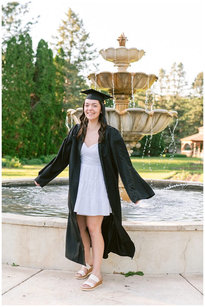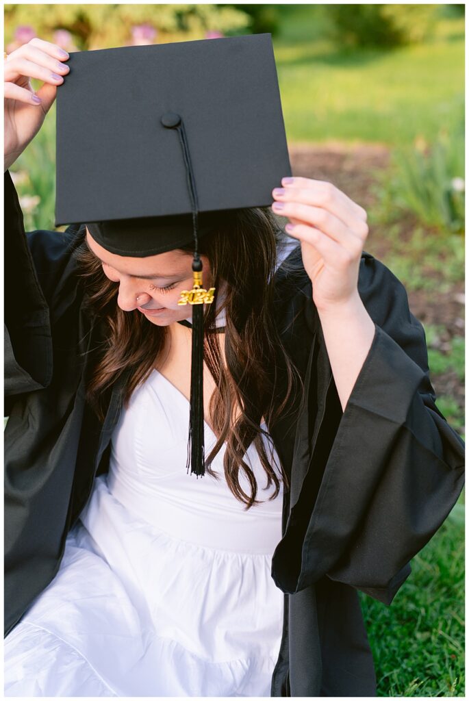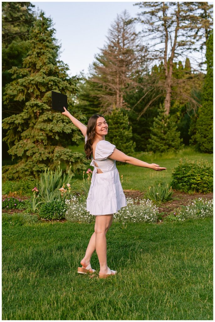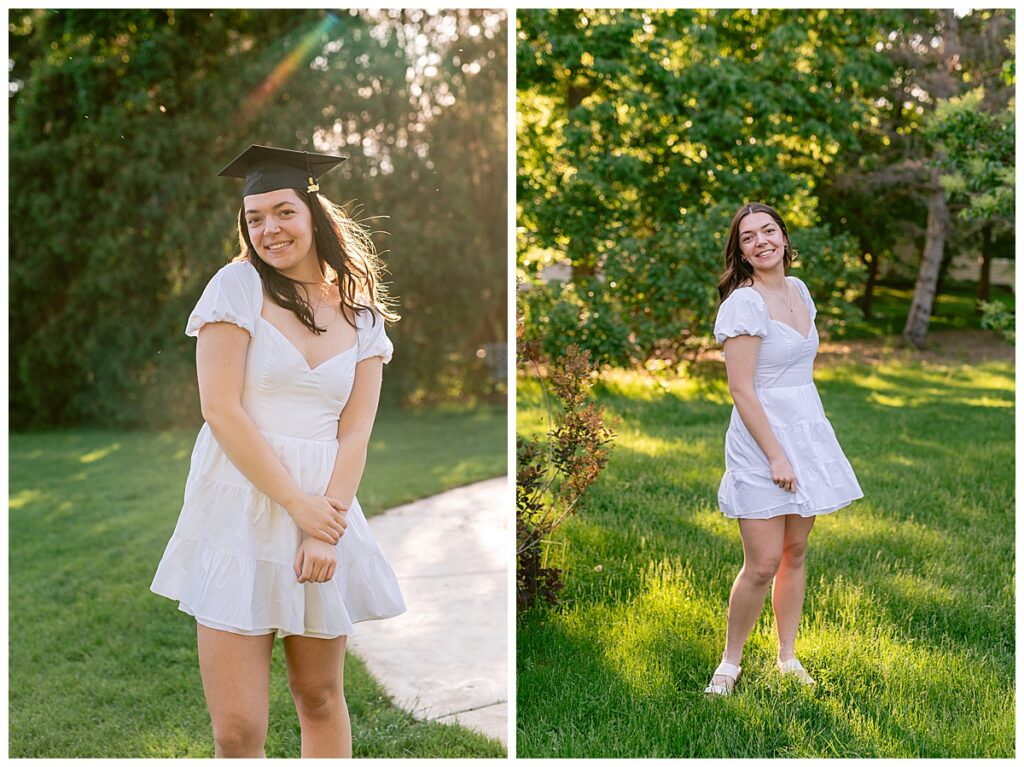 The timing of the photoshoot was everything. As the sun began to set, Arneson Acres Park was bathed in the enchanting glow of the golden hour. This magical time of day, when the sunlight is soft and warm, added a dreamy quality to the photos. The golden hues enhanced the natural beauty of the park and created a stunning contrast with Noelle’s white dress and cap and gown.