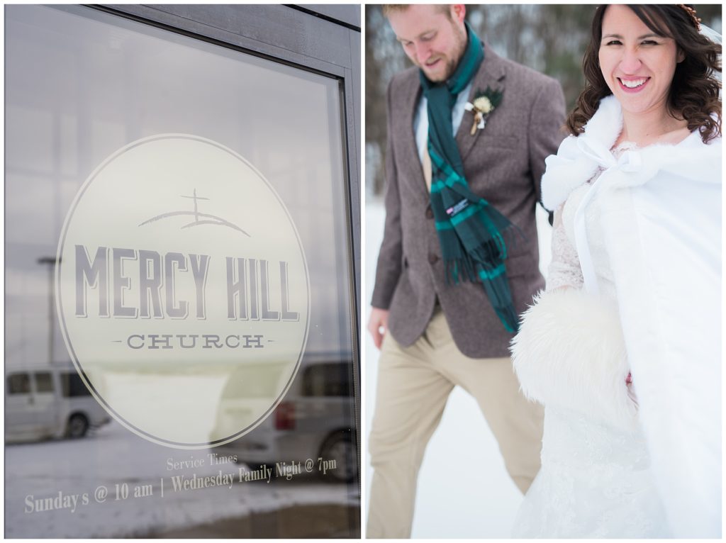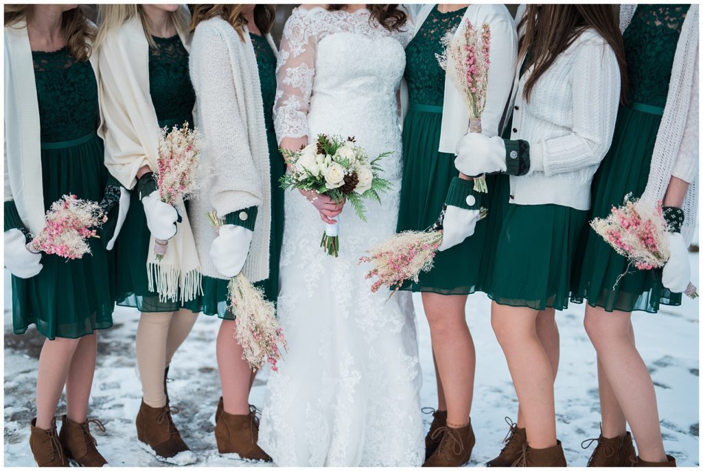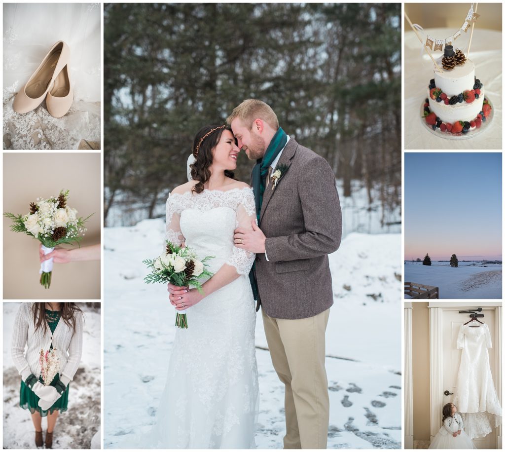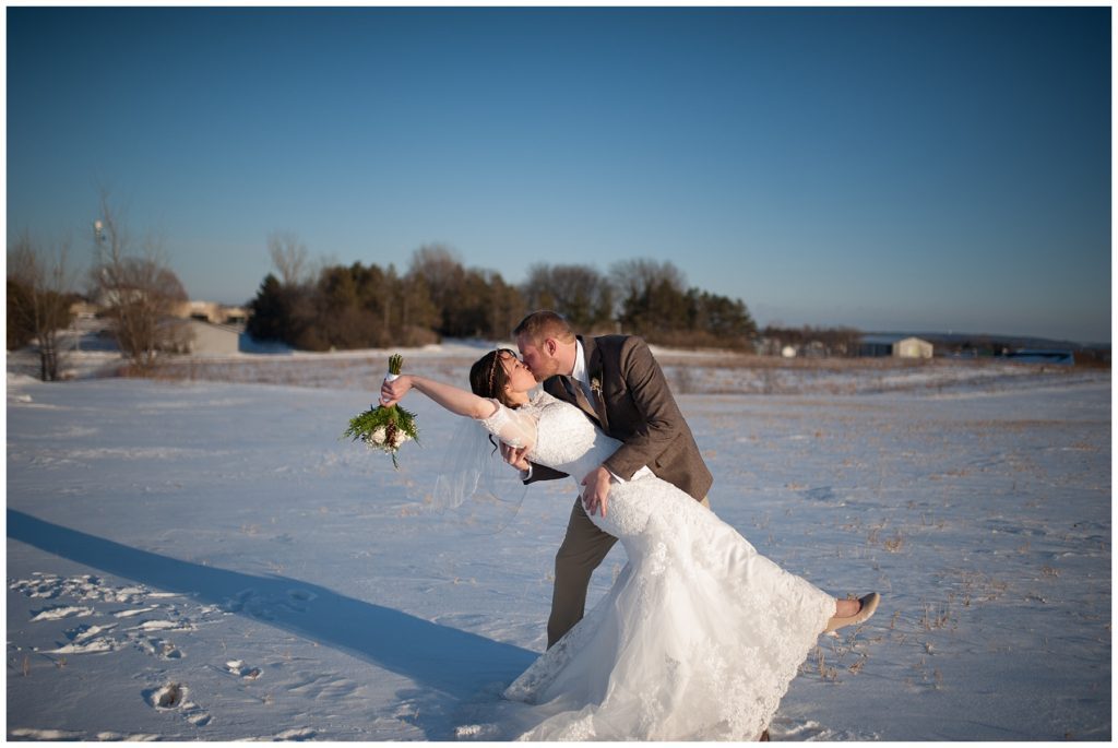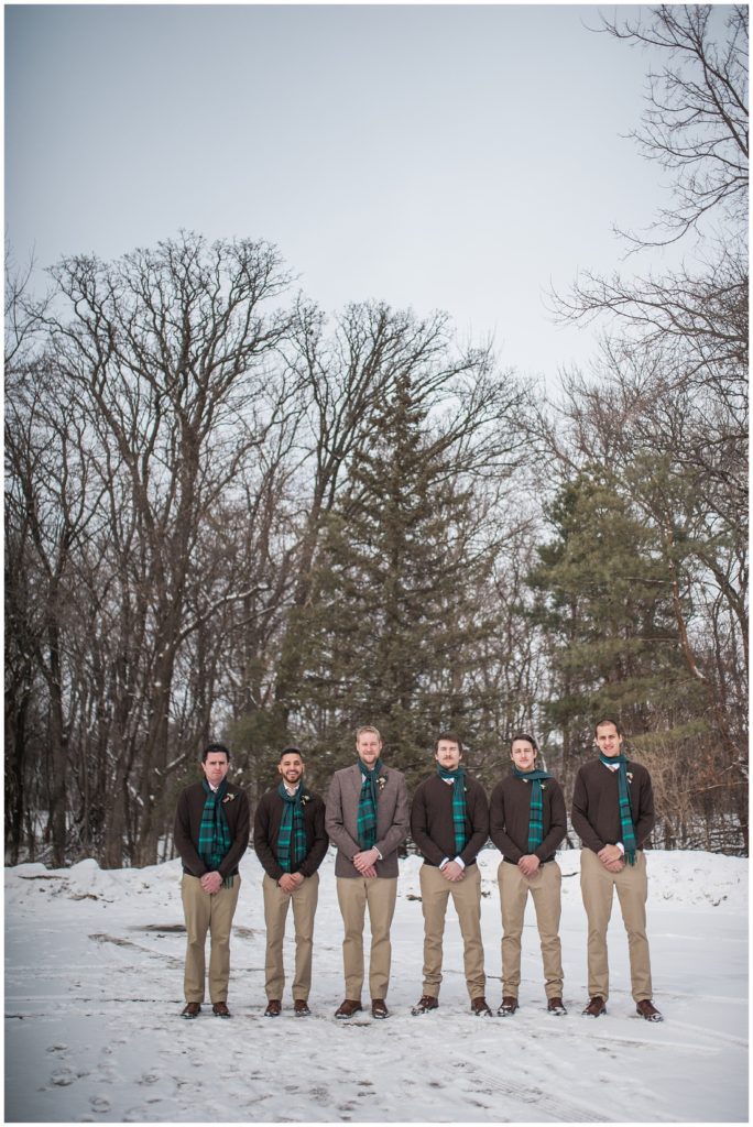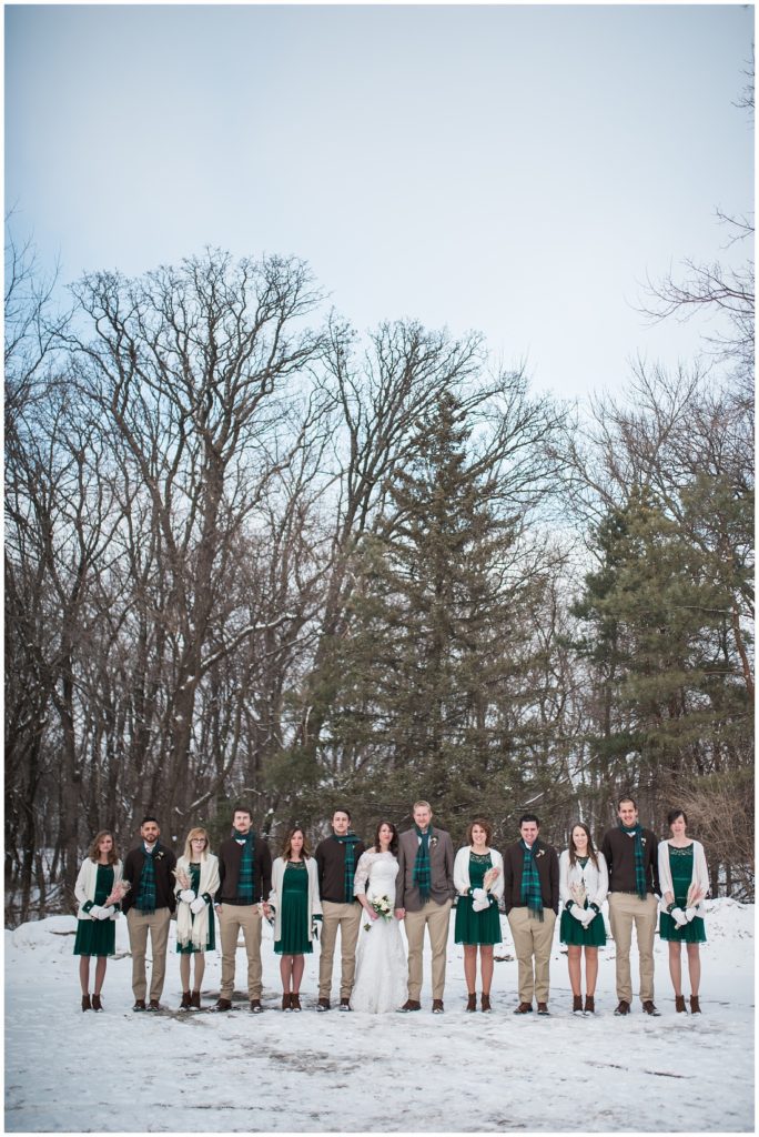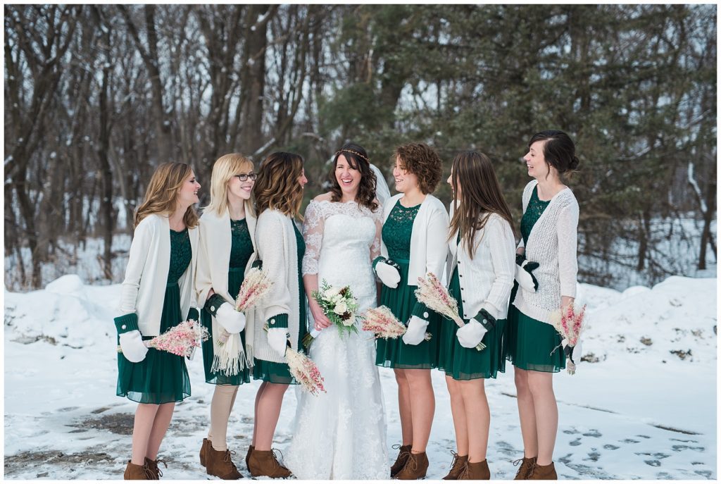 Their February wedding day was absolutely perfect. A fresh blanket of snow fell in the morning hours followed by filtered light in the afternoon to a beautiful sunset in the evening. Warming up just enough to bear the cold, we all headed to Essex Park in Rochester for outdoor photos. Laura looked incredible in her custom made Azdress white gown and hair piece from Lo & Behold while her bridesmaids stayed warm and beautiful in their emerald green dresses from David’s Bridal in Rochester. The dried florals from The Posey Shop (a brilliant idea for outdoor winter weddings in MN!) were a perfect pop of pinks against the gowns. Evin wore a tweed dark brown suit jacket from Studio Suites, perfect to stay warm in the winter weather and his groomsmen looked stunning in the brown sweaters, gold ties and plaid emerald and navy scarves. They sported their wintery boutonnieres from Which Goose. Laura and Evin created their invitations from Vista Print and held their ceremony and reception at their home church of Mercy Hill. Because the couple doesn’t care much for dancing, they decided to incorporate an improv comedy act for their guests after dinner of which many were entertained.