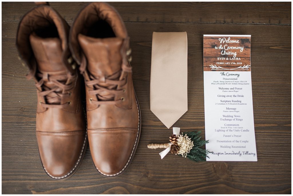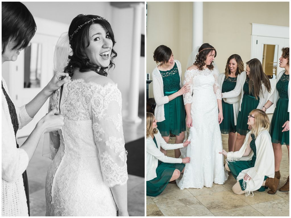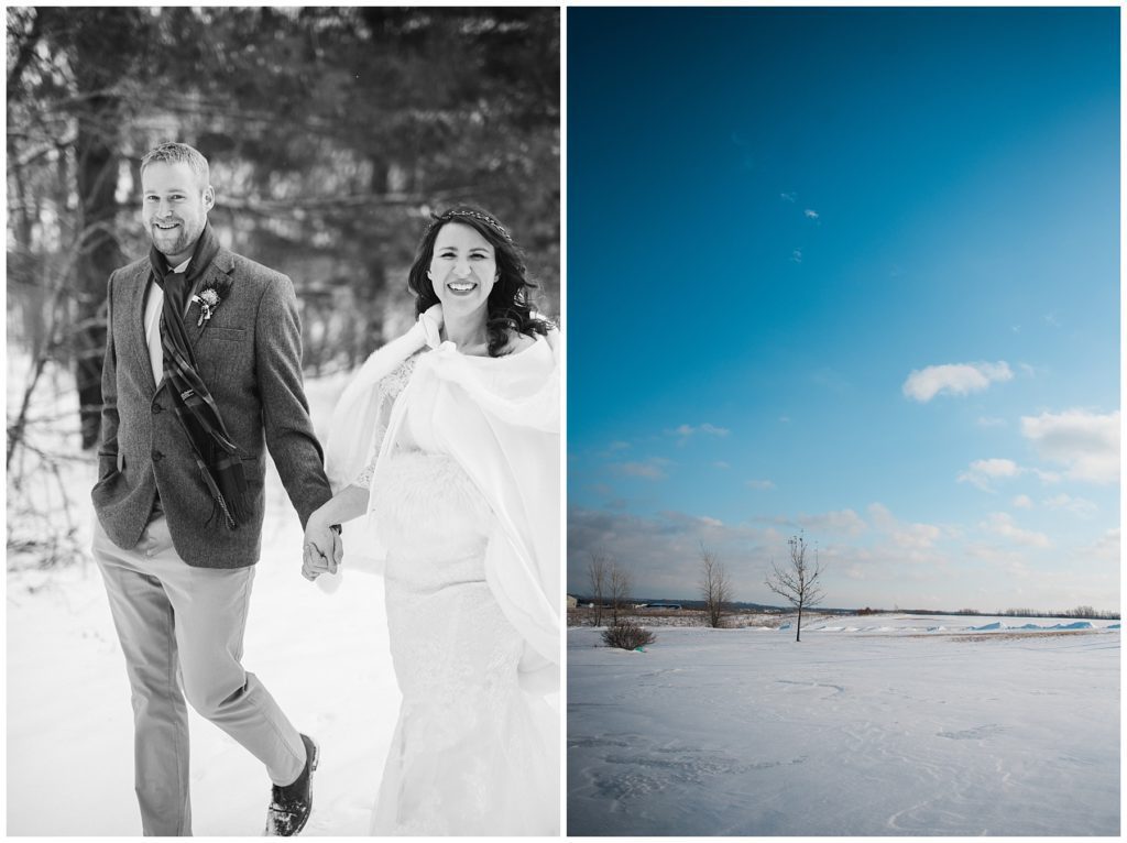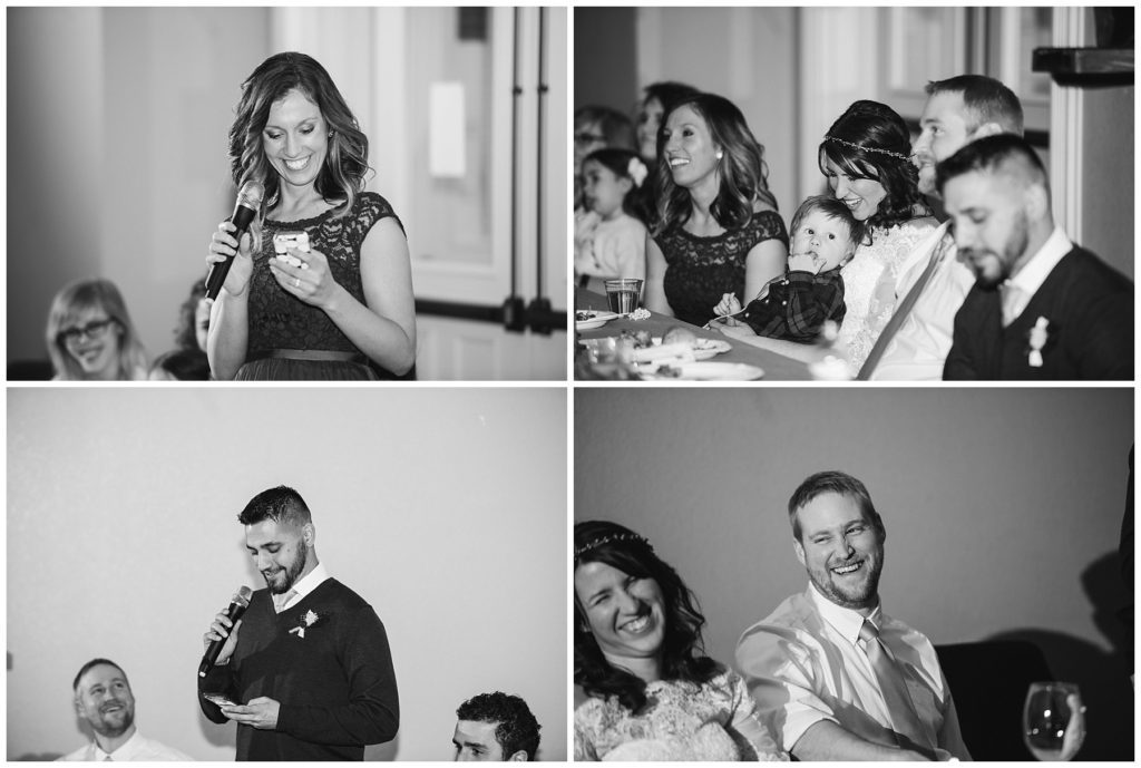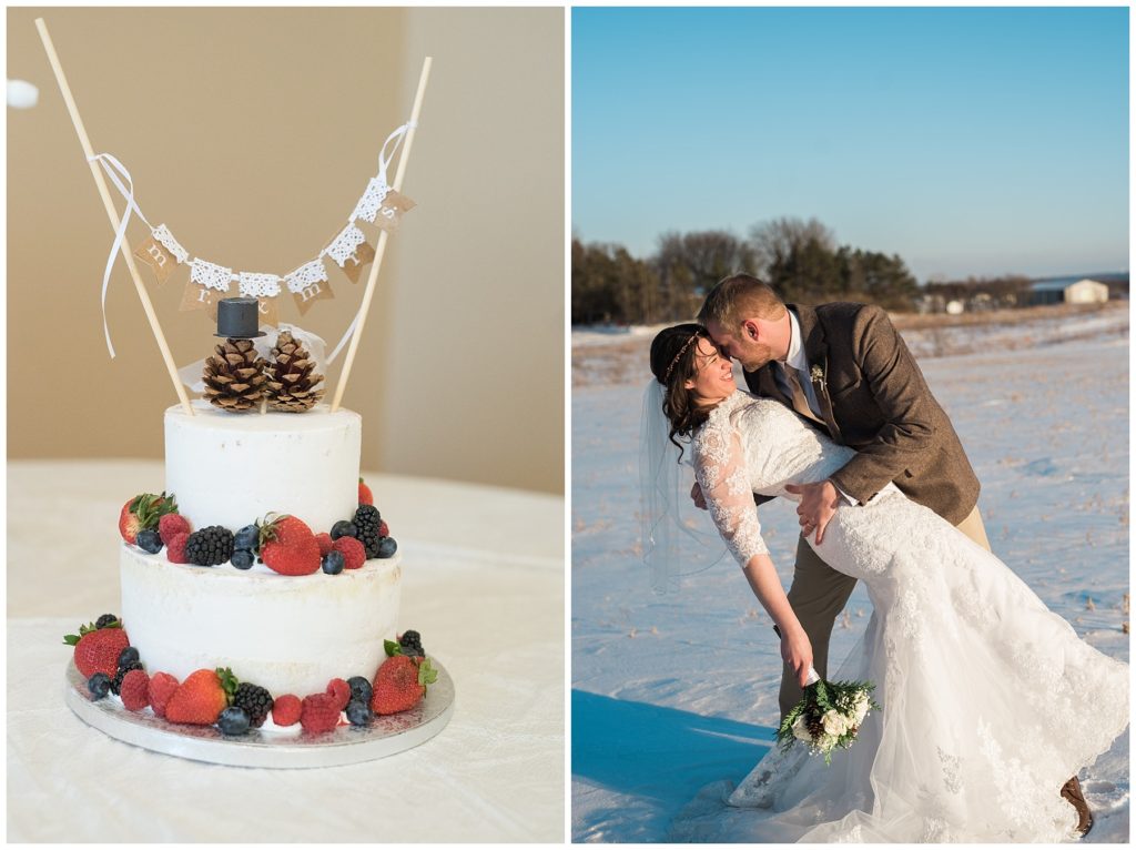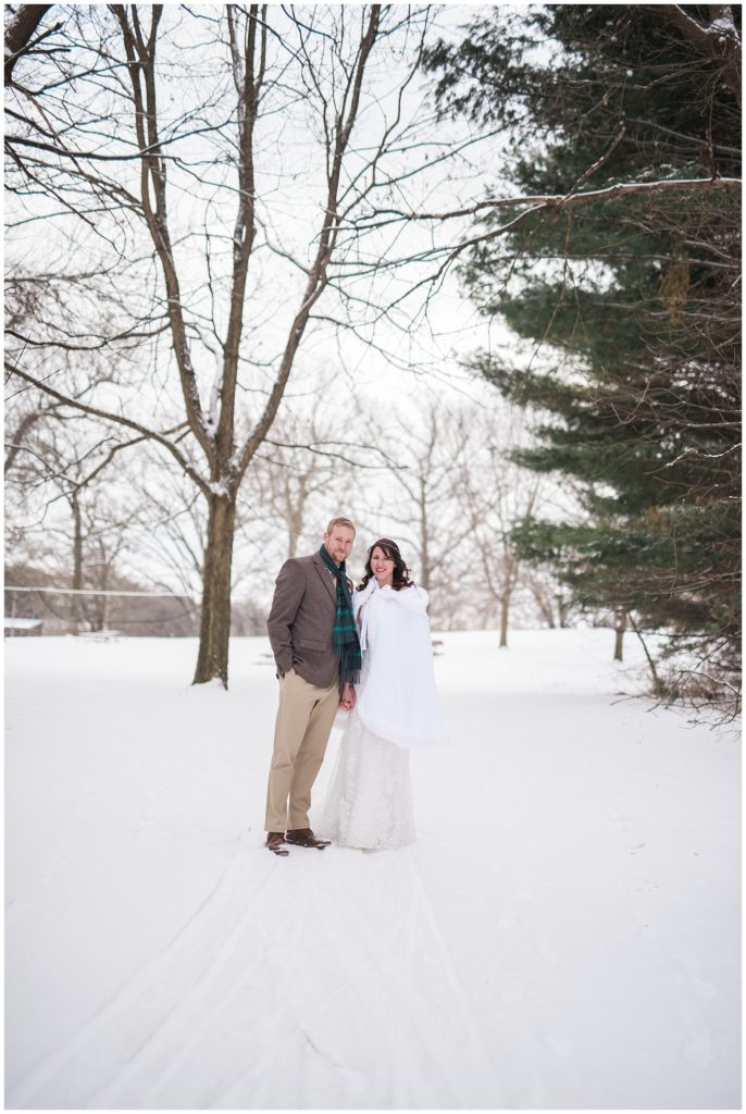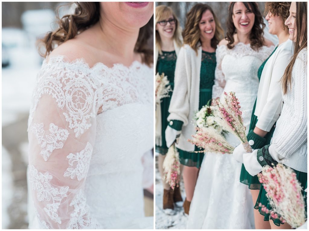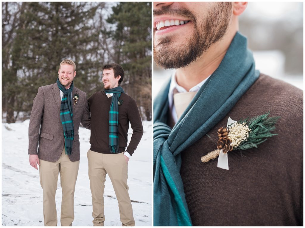 Their February wedding day was absolutely perfect. A fresh blanket of snow fell in the morning hours followed by filtered light in the afternoon to a beautiful sunset in the evening. Warming up just enough to bear the cold, we all headed to Essex Park in Rochester for outdoor photos. Laura looked incredible in her custom made Azdress white gown and hair piece from Lo & Behold while her bridesmaids stayed warm and beautiful in their emerald green dresses from David’s Bridal in Rochester. The dried florals from The Posey Shop (a brilliant idea for outdoor winter weddings in MN!) were a perfect pop of pinks against the gowns. Evin wore a tweed dark brown suit jacket from Studio Suites, perfect to stay warm in the winter weather and his groomsmen looked stunning in the brown sweaters, gold ties and plaid emerald and navy scarves. They sported their wintery boutonnieres from Which Goose. Laura and Evin created their invitations from Vista Print and held their ceremony and reception at their home church of Mercy Hill. Because the couple doesn’t care much for dancing, they decided to incorporate an improv comedy act for their guests after dinner of which many were entertained.