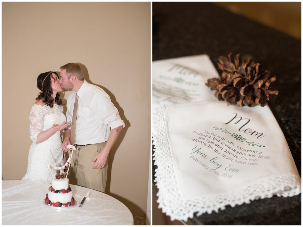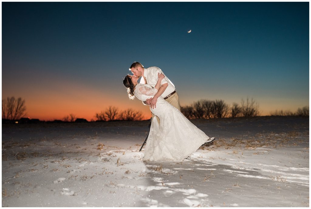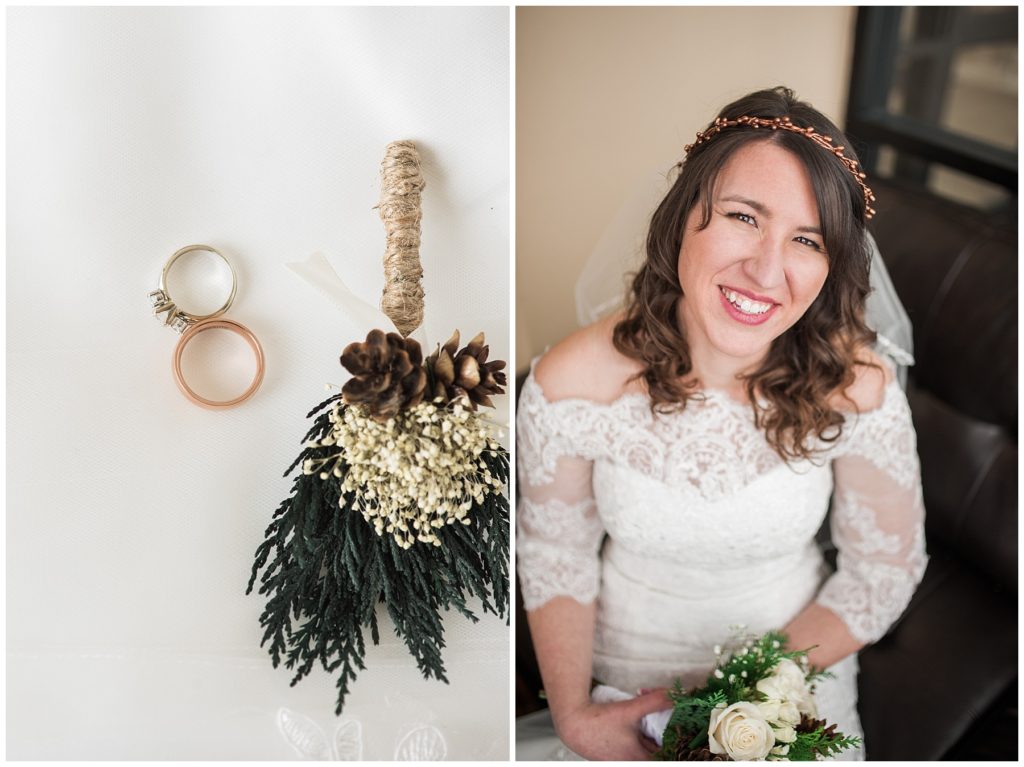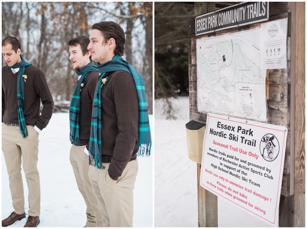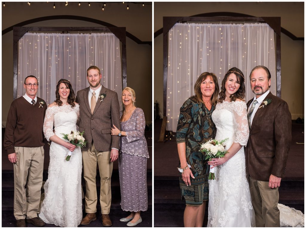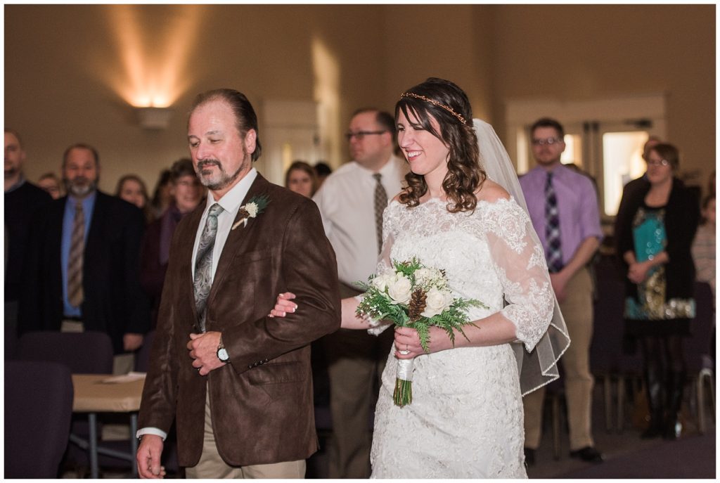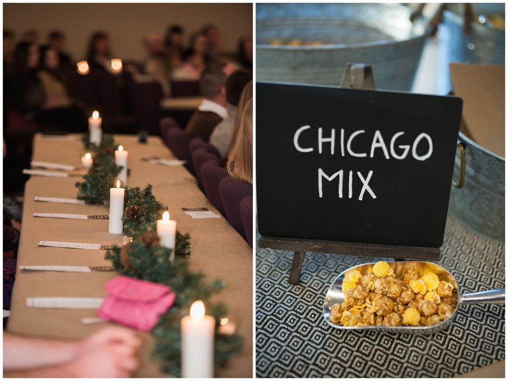 Their February wedding day was absolutely perfect. A fresh blanket of snow fell in the morning hours followed by filtered light in the afternoon to a beautiful sunset in the evening. Warming up just enough to bear the cold, we all headed to Essex Park in Rochester for outdoor photos. Laura looked incredible in her custom made Azdress white gown and hair piece from Lo & Behold while her bridesmaids stayed warm and beautiful in their emerald green dresses from David’s Bridal in Rochester. The dried florals from The Posey Shop (a brilliant idea for outdoor winter weddings in MN!) were a perfect pop of pinks against the gowns. Evin wore a tweed dark brown suit jacket from Studio Suites, perfect to stay warm in the winter weather and his groomsmen looked stunning in the brown sweaters, gold ties and plaid emerald and navy scarves. They sported their wintery boutonnieres from Which Goose. Laura and Evin created their invitations from Vista Print and held their ceremony and reception at their home church of Mercy Hill. Because the couple doesn’t care much for dancing, they decided to incorporate an improv comedy act for their guests after dinner of which many were entertained.