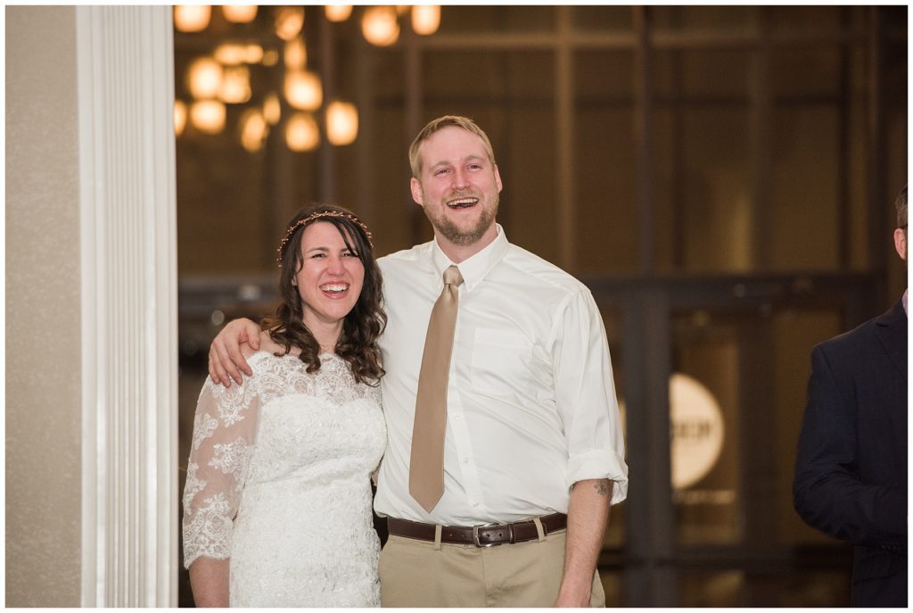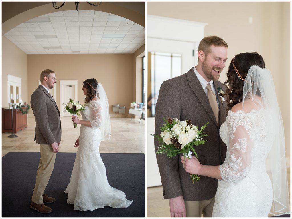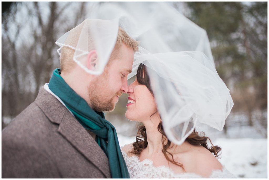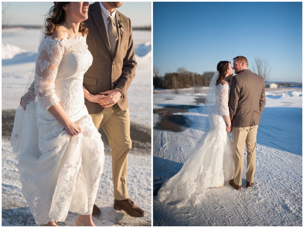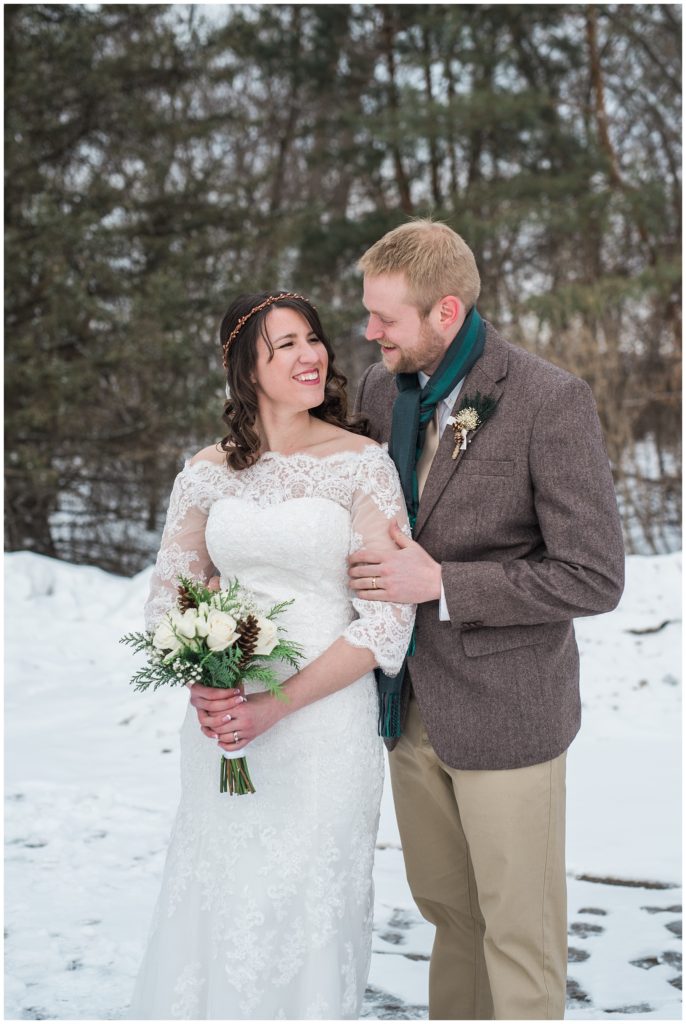 Get married on a beach or in the middle of winter in Rochester? Laura and Evin chose the latter, and it is a game that this sweet couple played when they first started dating and still play when they need a good laugh! The two met at Crossroads College in Rochester while Laura was working in the housing space on campus and Evin showed up as a renter and noticed the pretty brunette right away. She knew he was a great renter, but wasn’t after a relationship. Two years later Evin finally gathered his nerve when the two were paired for a work project and he finally asked her out!
