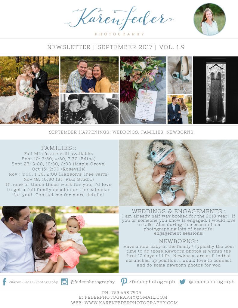 Fall is back and I can not wait to see so many of you! Take a look at some of the mini session dates, schedule a newborn session, or chat with me about your wedding day! I still have availability and would love to connect with you!