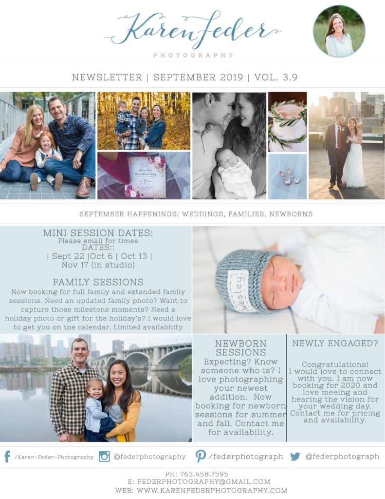 September is here! Cue the pumpkins, changing leaves, cooler weather, and of course family photos! If you are looking to update that family photo, get photos for your holiday cards, or just capture those milestones, I would love to connect! Sometimes I do not always get e-mails attached to this newsletter, so please feel free to e-mail me directly! I can’t wait to hear from you!