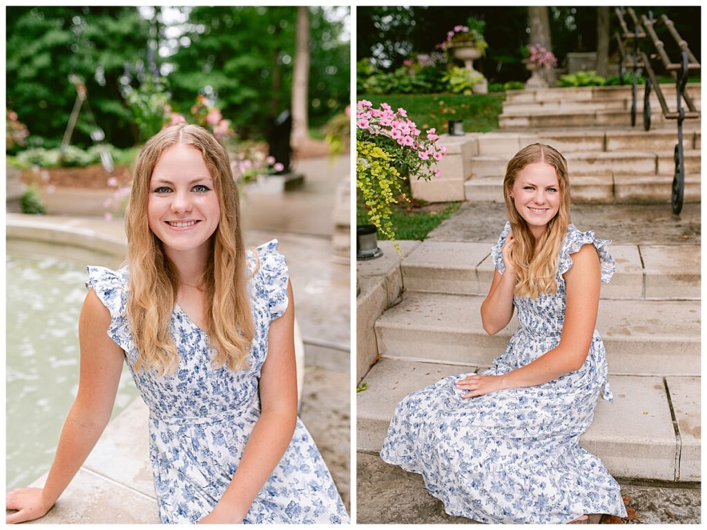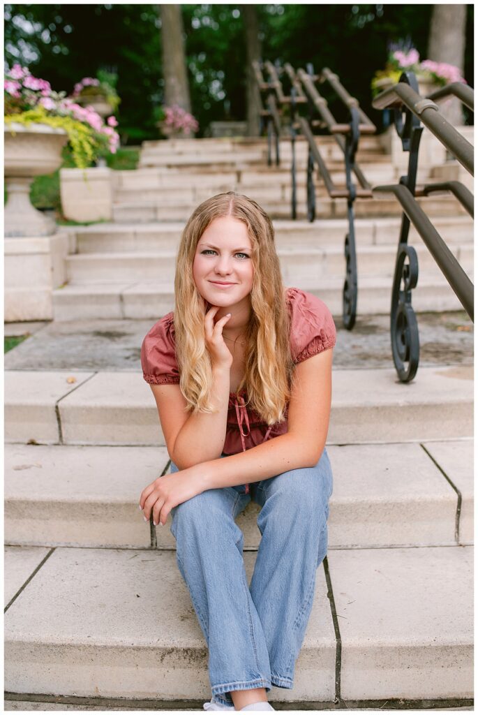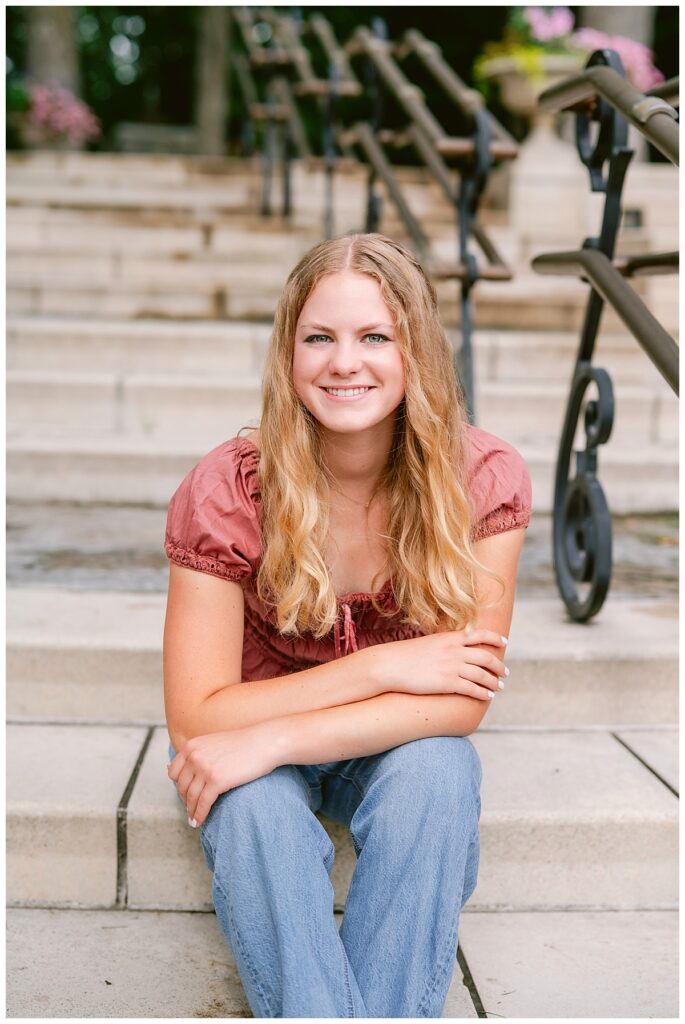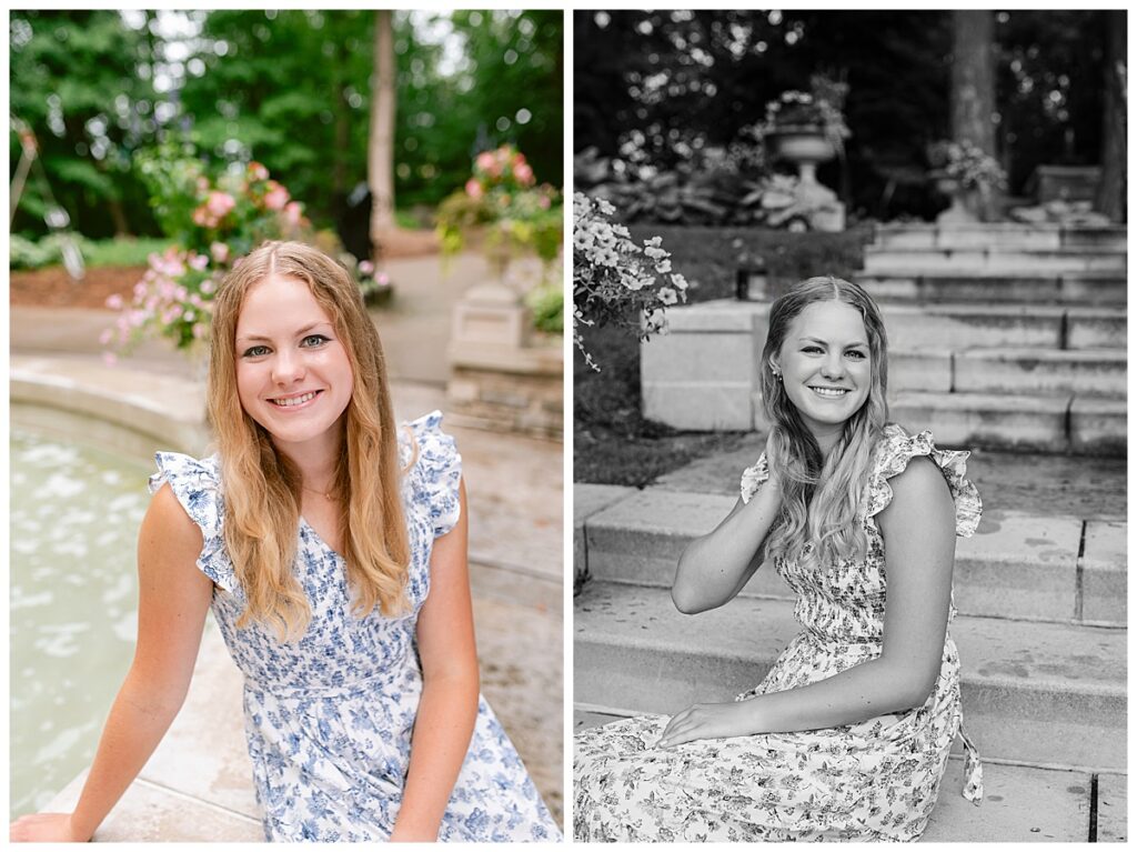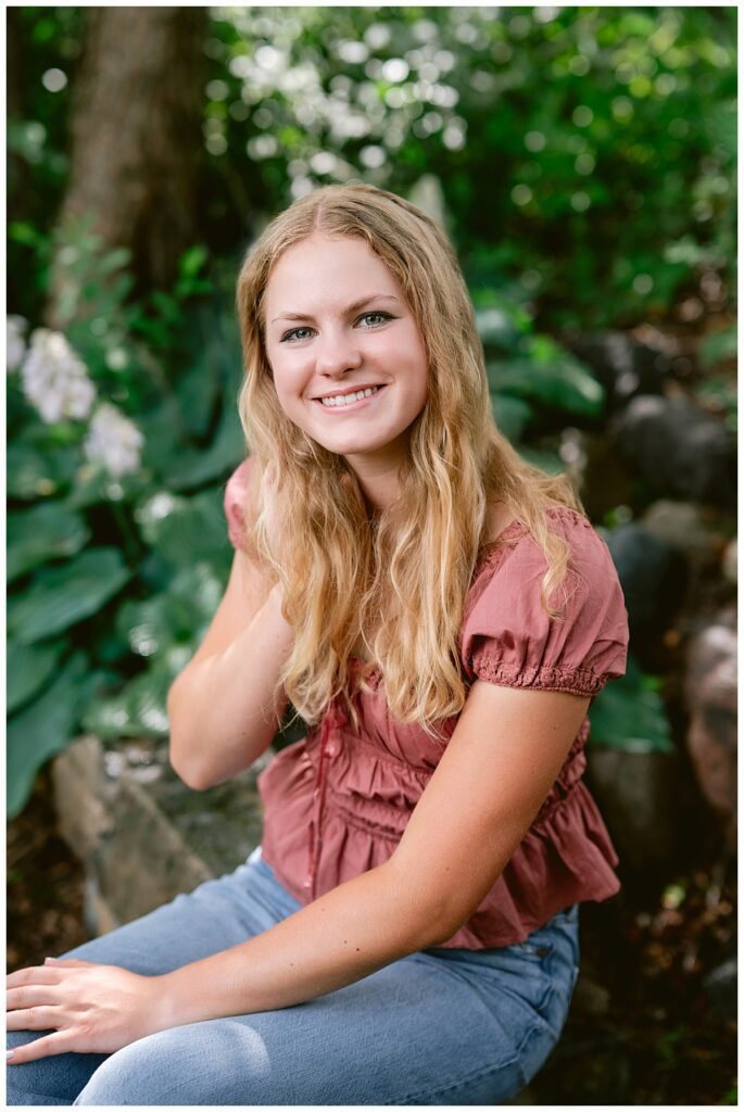 We chose Millennium Gardens in Plymouth, Minnesota as the location for her senior session, and it was the perfect backdrop. With its beautifully maintained flower beds, stone paths, fountains, and peaceful corners, Millennium Gardens feels like a hidden gem. The lush greenery and vibrant blooms provided a natural elegance that complemented Nora’s personality so well.