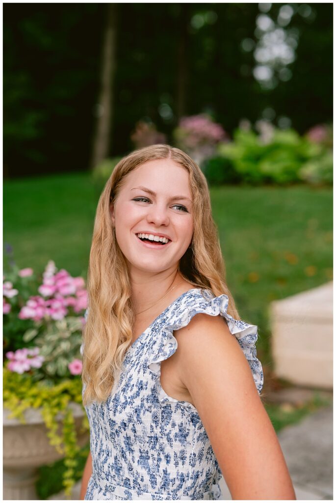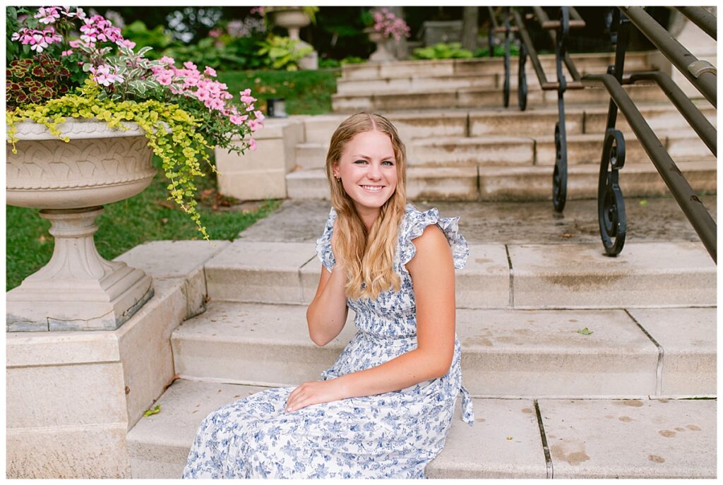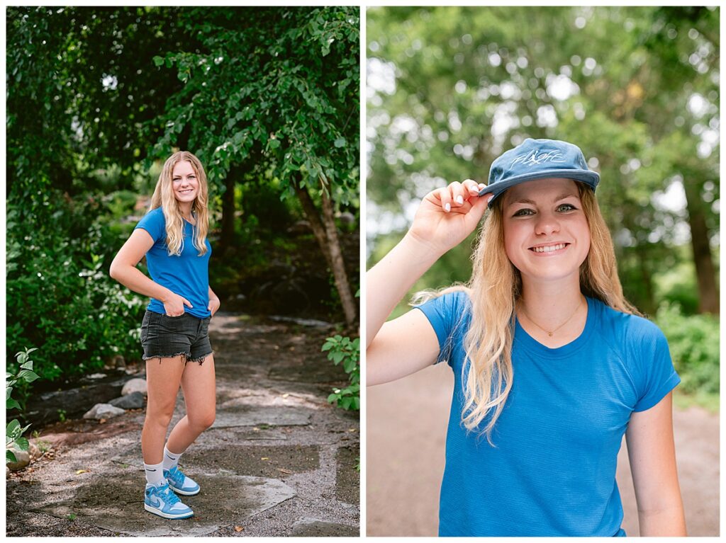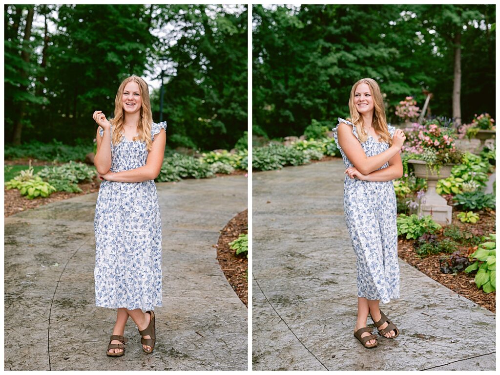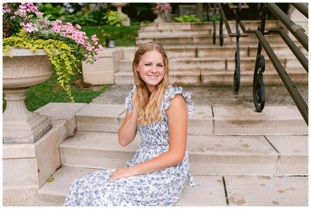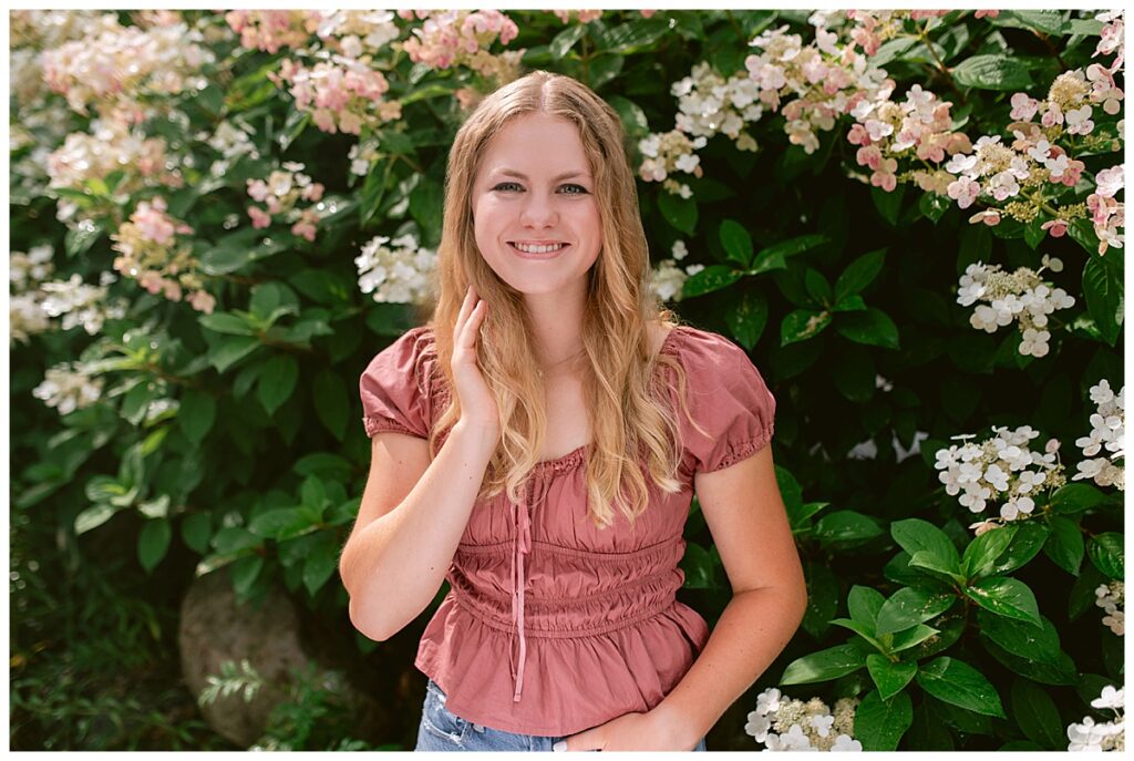 We chose Millennium Gardens in Plymouth, Minnesota as the location for her senior session, and it was the perfect backdrop. With its beautifully maintained flower beds, stone paths, fountains, and peaceful corners, Millennium Gardens feels like a hidden gem. The lush greenery and vibrant blooms provided a natural elegance that complemented Nora’s personality so well.