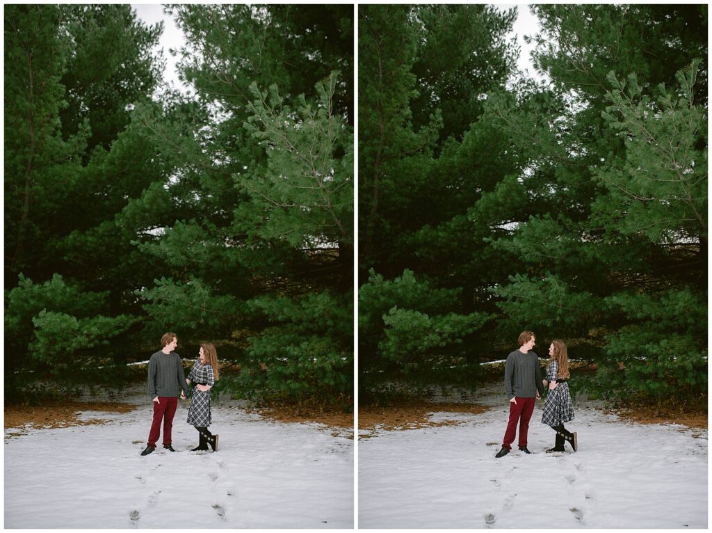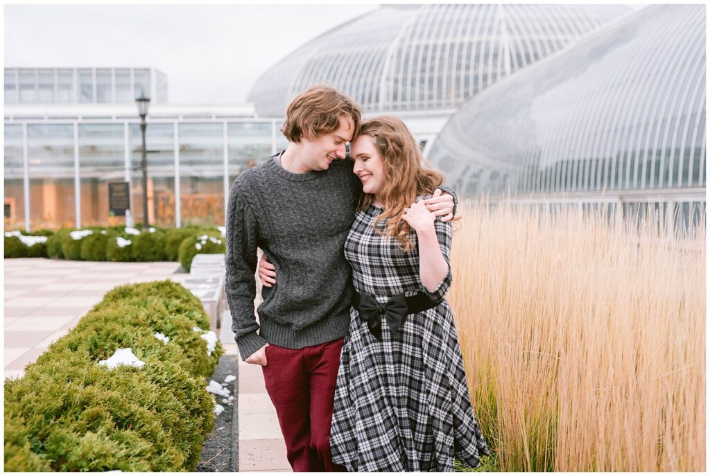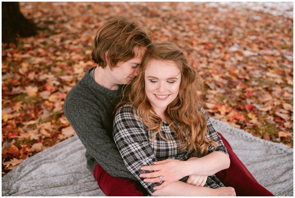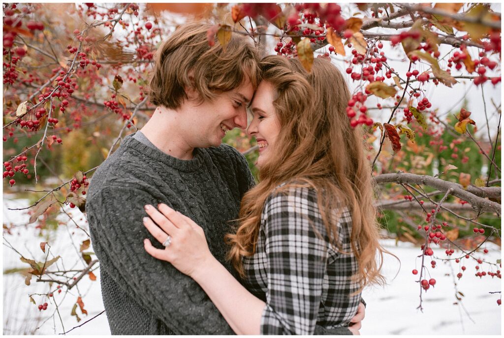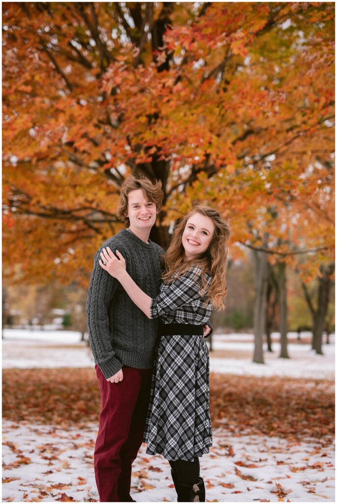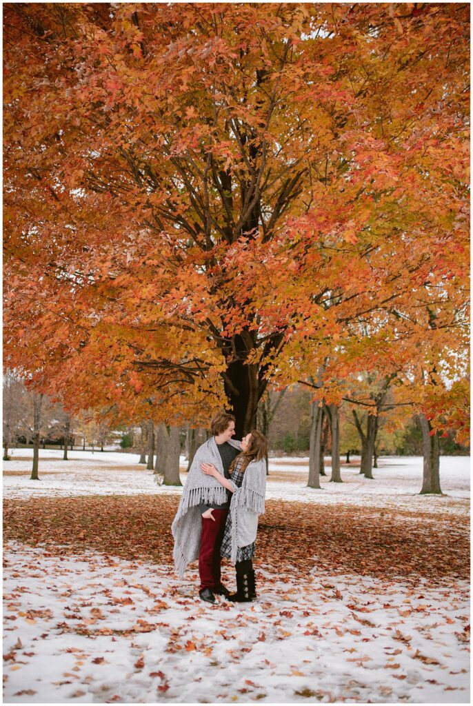 Natalie and Jonathan met in high school and over the years have remained together through thick and thin. When Jonathan proposed, it was an easy yes for Natalie as Jonathan has been her best friend. We did their engagement session on a late fall day at Como Park. We never expected snow, but it came and we just went with it combining both seasons together and making one beautiful session of both fresh snow and glorious leaves!