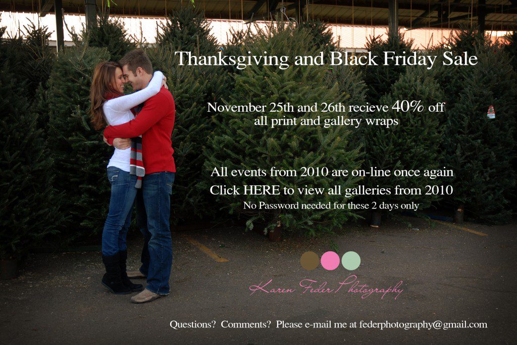 Thanksgiving and Black Friday SaleThursday, November 25, 2010Tired of eating? Go shopping! Check out the 40% off sale going on today and tomorrow! Happy turkey day… gobble gobble! Show Hide 1 comment Comment Your email is never published or shared. Required fields are marked * Post Comment Δ My love/ hate relationship with Black Friday » Karen Feder Photography BlogNovember 25, 2010 - 12:19 am[…] don’t forget about the Thanksgiving/ Black Friday sale that I have going on now, see yesterday’s post for more details! Tags: […]