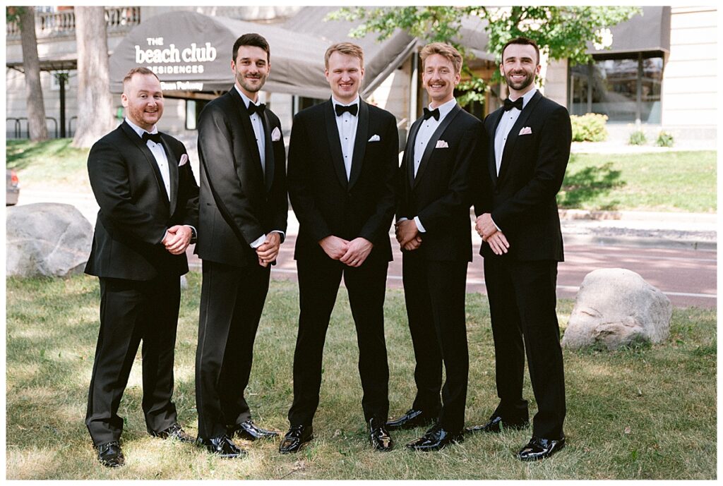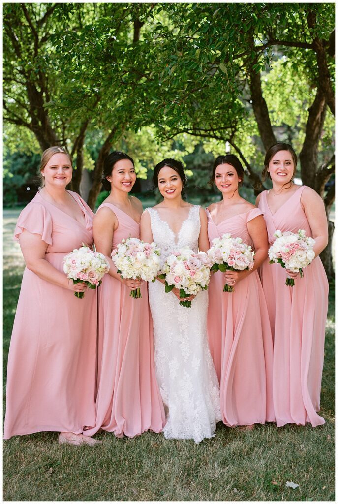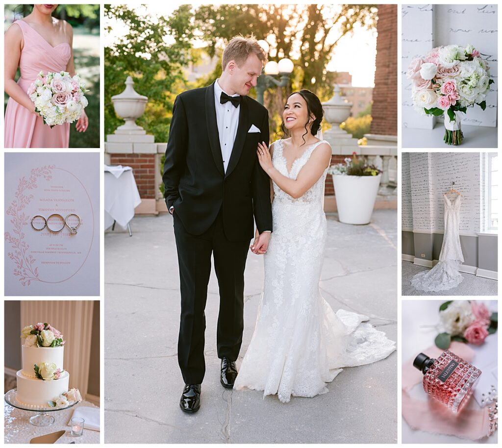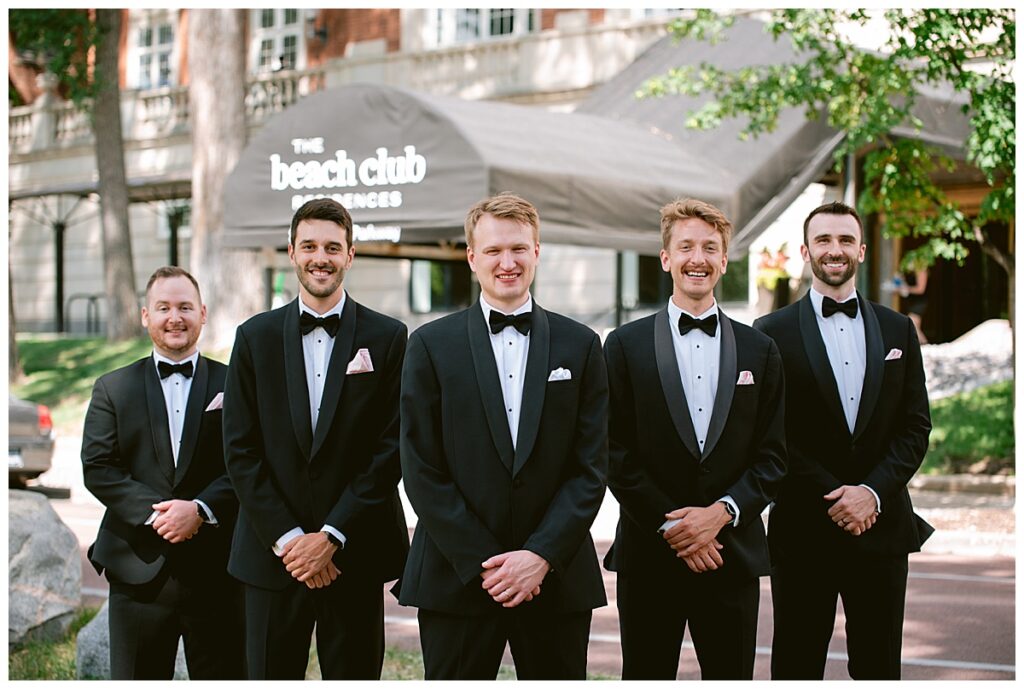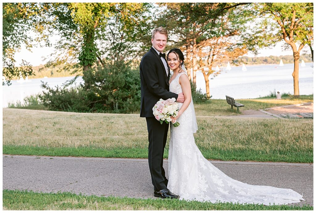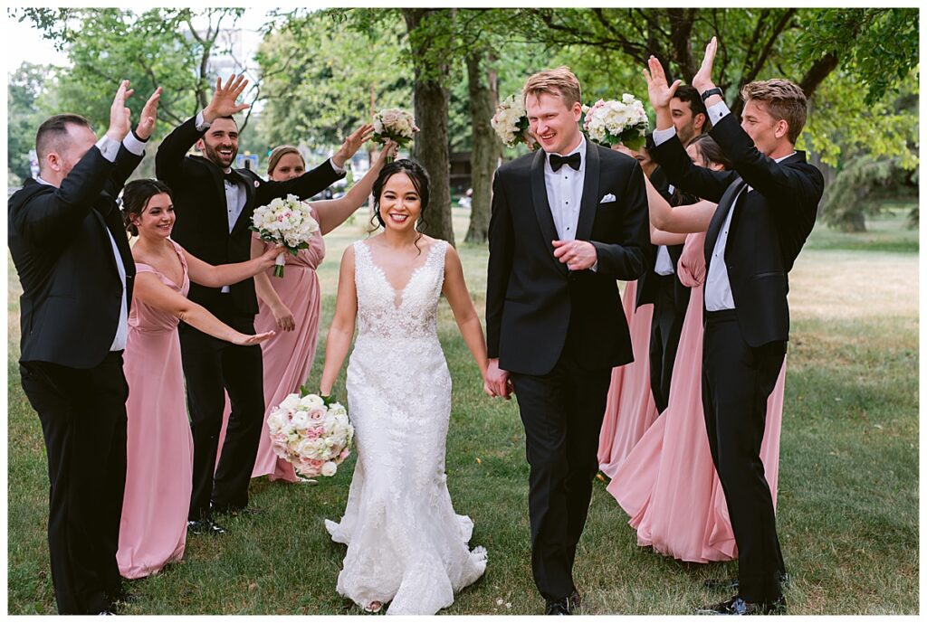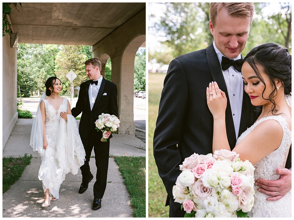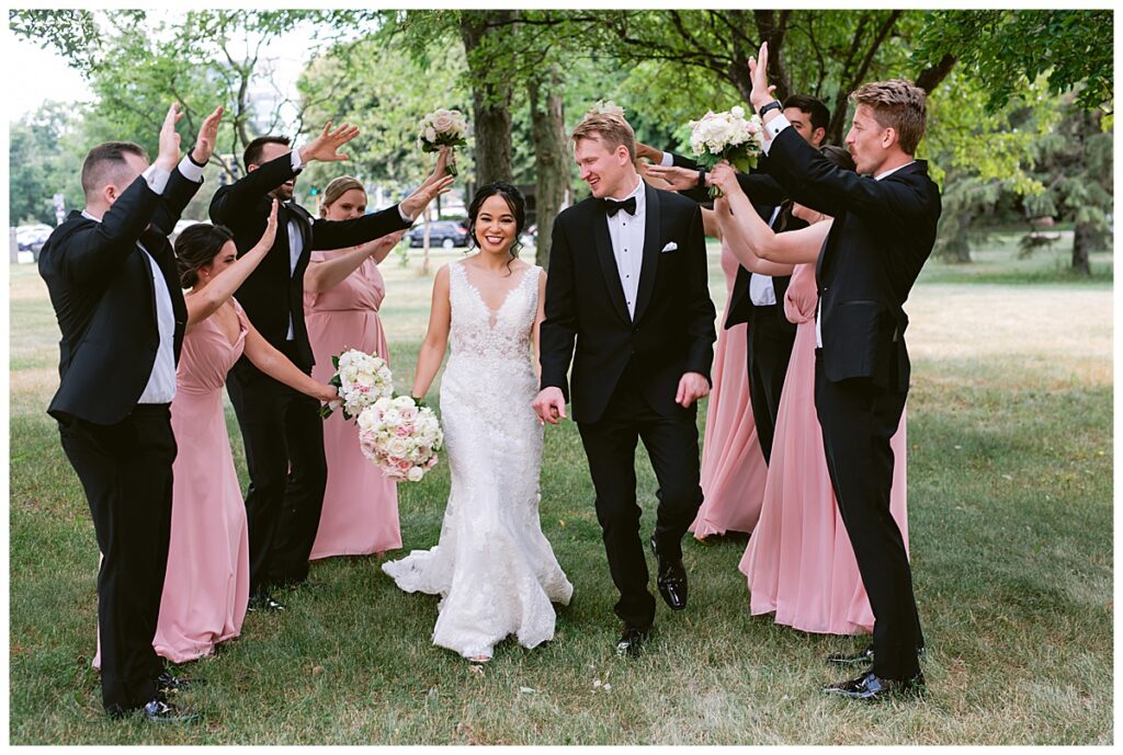 Tim and Milada chose to host their wedding at The Beach Club in Minneapolis. Located right off the Bde Maka Ska shoreline, the club is known for it’s class and elegance and provides the perfect backdrop for a beautiful urban wedding. Milada and her ladies began their morning getting ready with Sandy Xiong who did hair and make-up. They arrived at The Beach Club and got ready in the beautiful bridal suite where Milada mother helped her into her stunning dress from Vera’s House of Bridals. She and Tim chose to do their first look on the winding staircase, and then headed outdoors for photos on the streets in front of the club. The wedding party soon joined them with the ladies wearing blush colored dresses from David’s Bridal.The bouquets of garden roses and hydrangea from Richfiled Florals were the perfect accents when placed against the dresses and the classic black suits Tim and his groomsmen wore. We then headed to the green space near the club with the wedding party and had such a blast together with the men posing with croquet sticks (Tim’s favorite outdoor game!) and the women enjoying their time together.