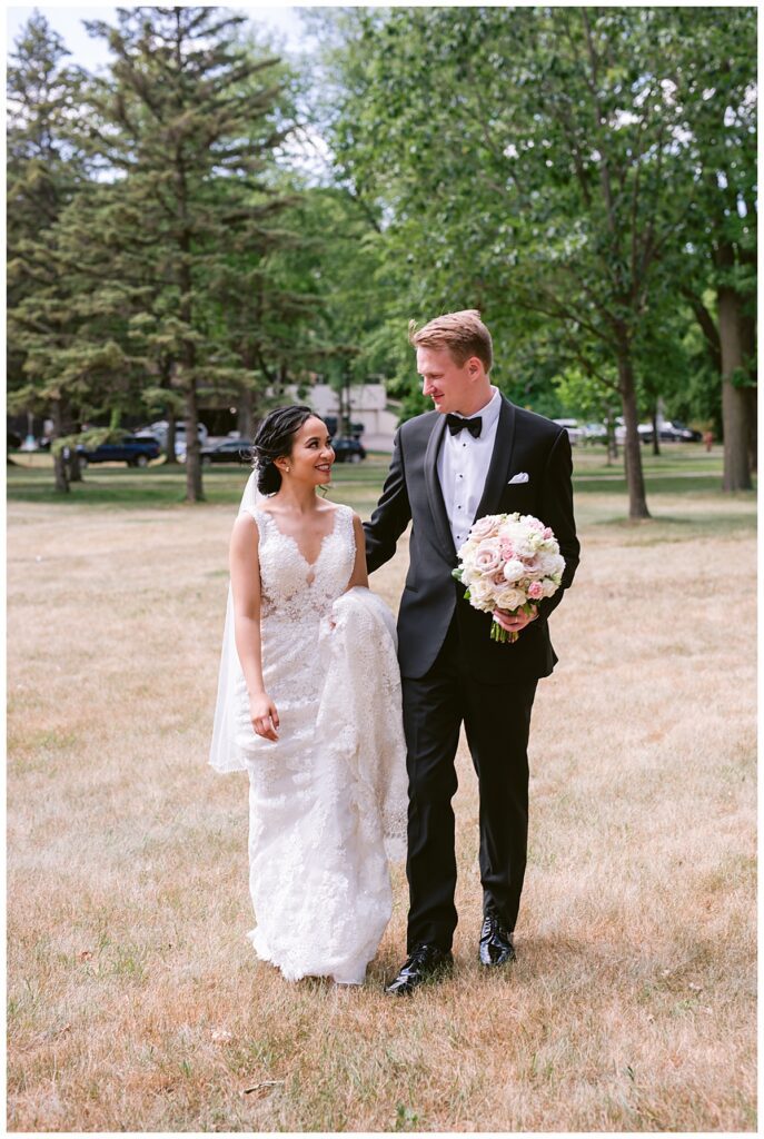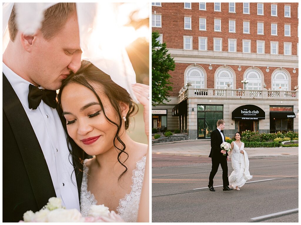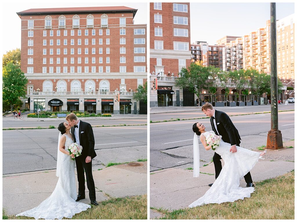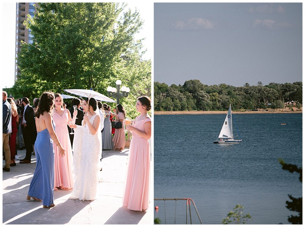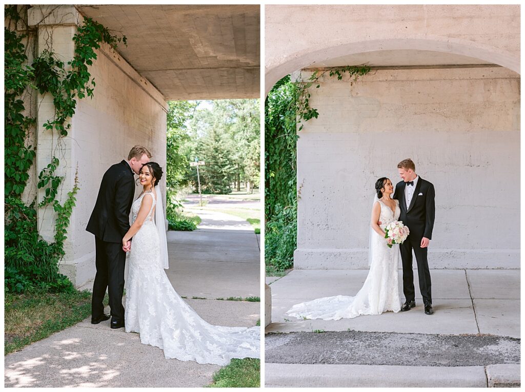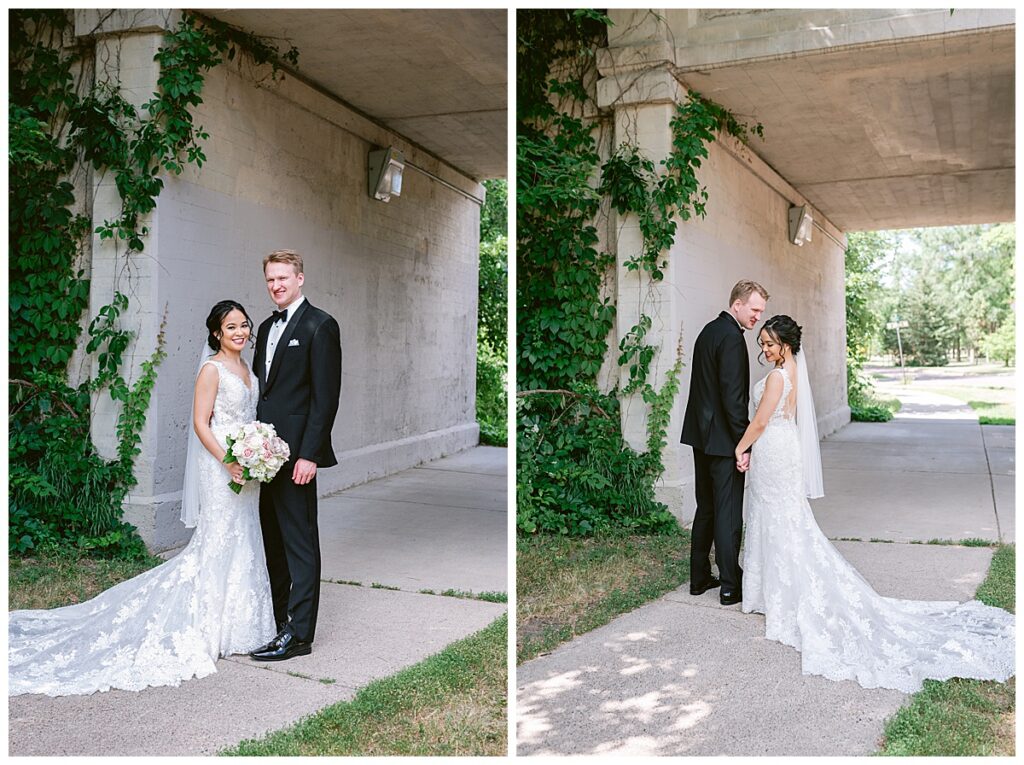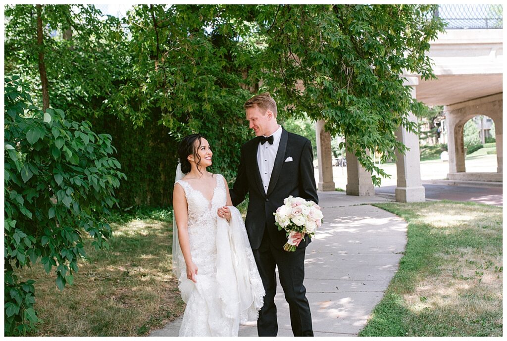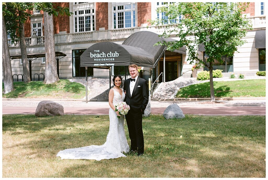 Tim and Milada chose to host their wedding at The Beach Club in Minneapolis. Located right off the Bde Maka Ska shoreline, the club is known for it’s class and elegance and provides the perfect backdrop for a beautiful urban wedding. Milada and her ladies began their morning getting ready with Sandy Xiong who did hair and make-up. They arrived at The Beach Club and got ready in the beautiful bridal suite where Milada mother helped her into her stunning dress from Vera’s House of Bridals. She and Tim chose to do their first look on the winding staircase, and then headed outdoors for photos on the streets in front of the club. The wedding party soon joined them with the ladies wearing blush colored dresses from David’s Bridal.The bouquets of garden roses and hydrangea from Richfiled Florals were the perfect accents when placed against the dresses and the classic black suits Tim and his groomsmen wore. We then headed to the green space near the club with the wedding party and had such a blast together with the men posing with croquet sticks (Tim’s favorite outdoor game!) and the women enjoying their time together.