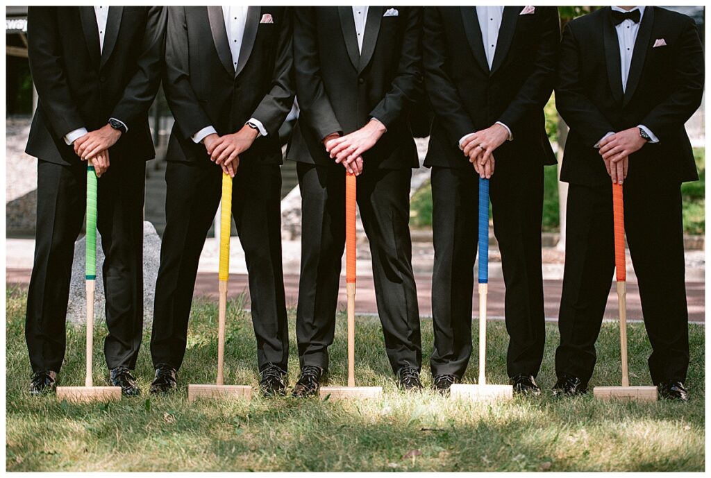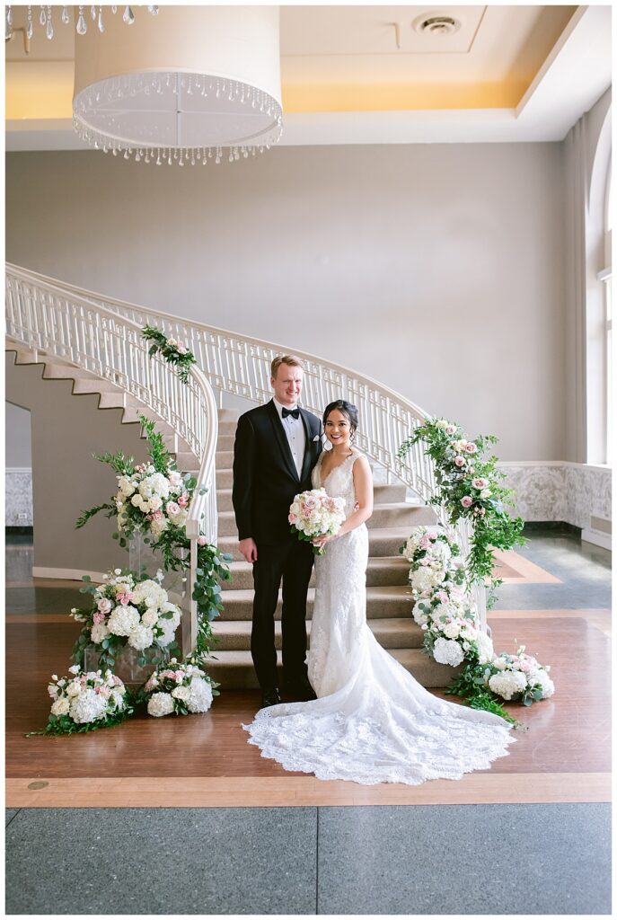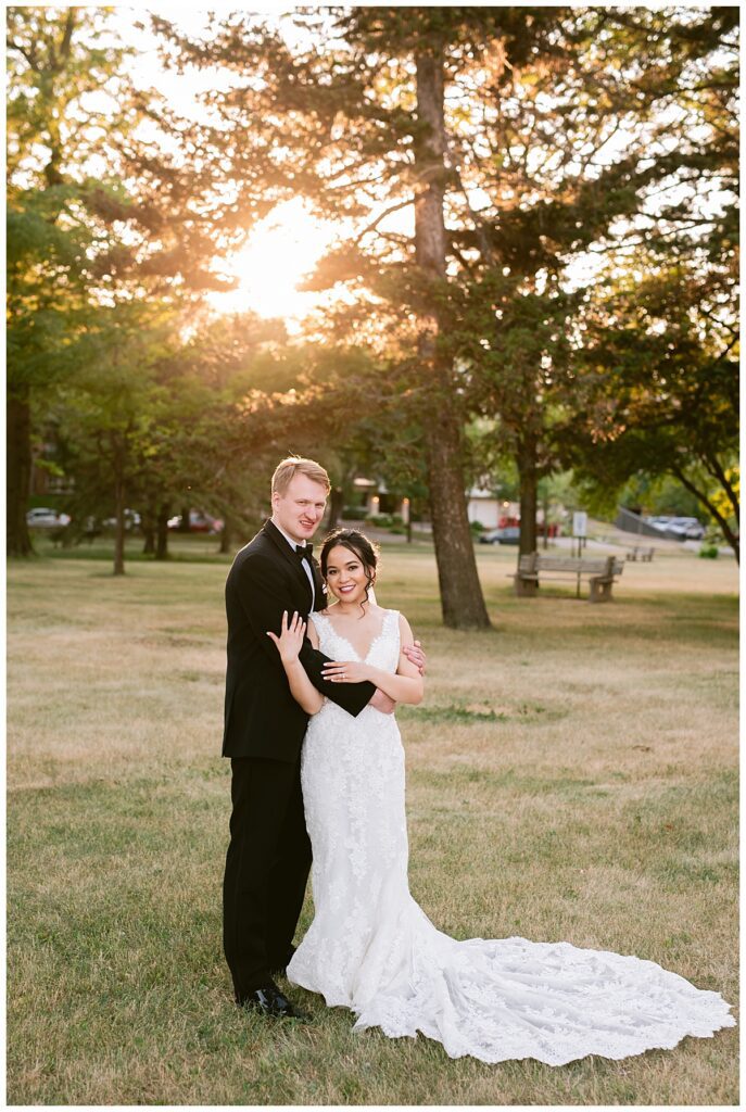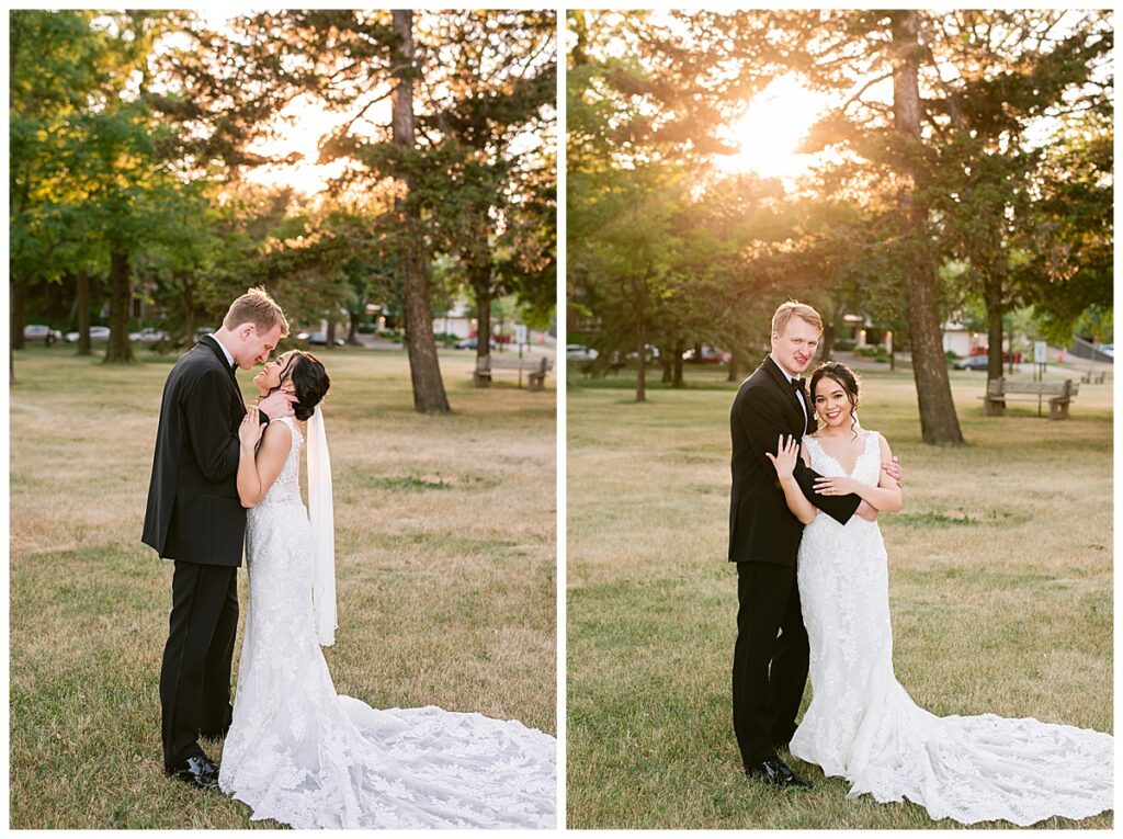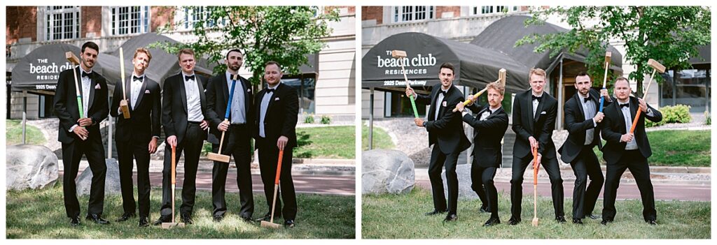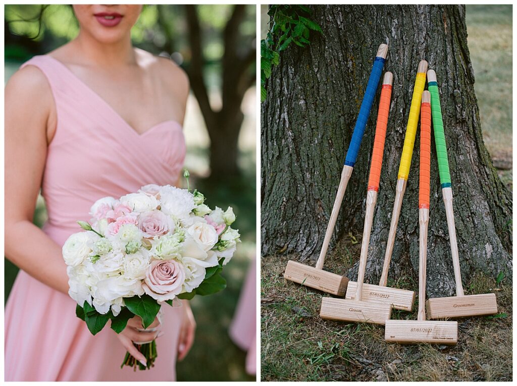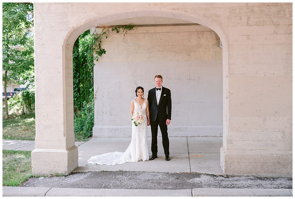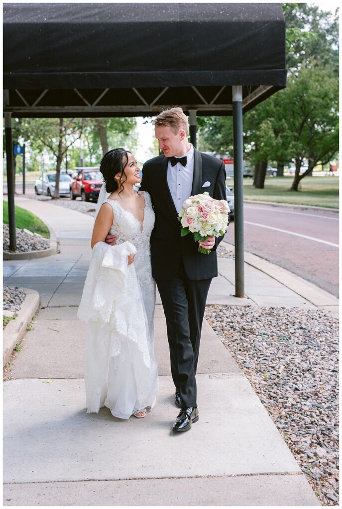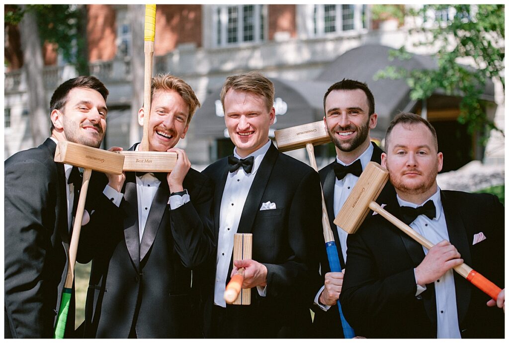 Tim and Milada chose to host their wedding at The Beach Club in Minneapolis. Located right off the Bde Maka Ska shoreline, the club is known for it’s class and elegance and provides the perfect backdrop for a beautiful urban wedding. Milada and her ladies began their morning getting ready with Sandy Xiong who did hair and make-up. They arrived at The Beach Club and got ready in the beautiful bridal suite where Milada mother helped her into her stunning dress from Vera’s House of Bridals. She and Tim chose to do their first look on the winding staircase, and then headed outdoors for photos on the streets in front of the club. The wedding party soon joined them with the ladies wearing blush colored dresses from David’s Bridal.The bouquets of garden roses and hydrangea from Richfiled Florals were the perfect accents when placed against the dresses and the classic black suits Tim and his groomsmen wore. We then headed to the green space near the club with the wedding party and had such a blast together with the men posing with croquet sticks (Tim’s favorite outdoor game!) and the women enjoying their time together.