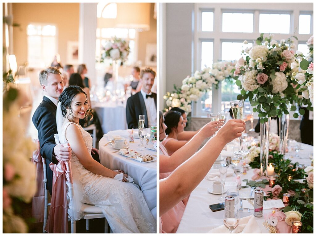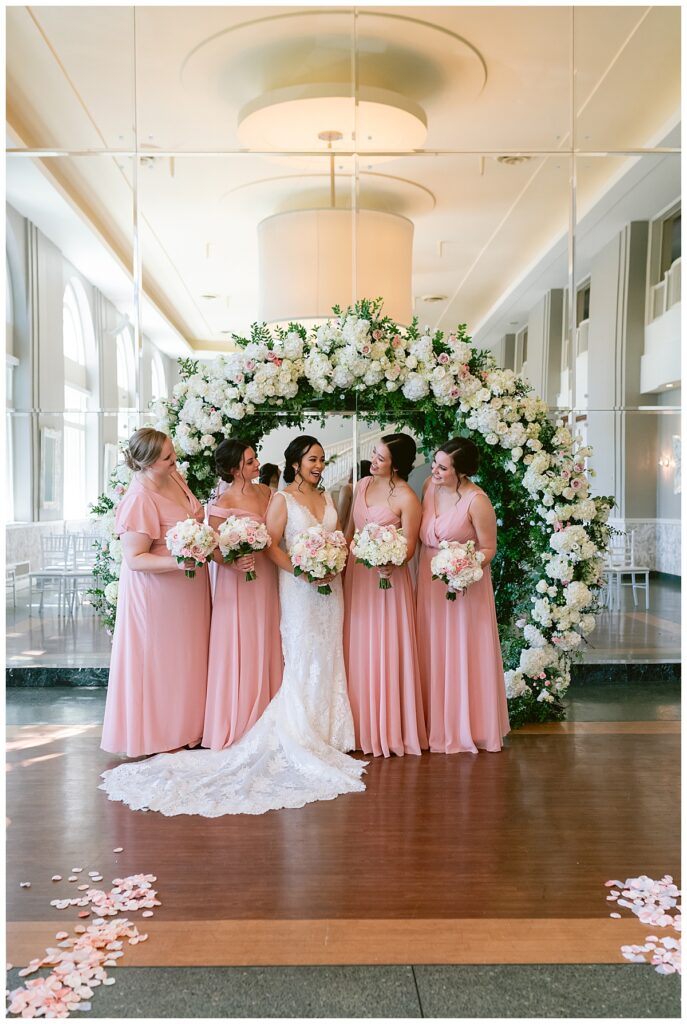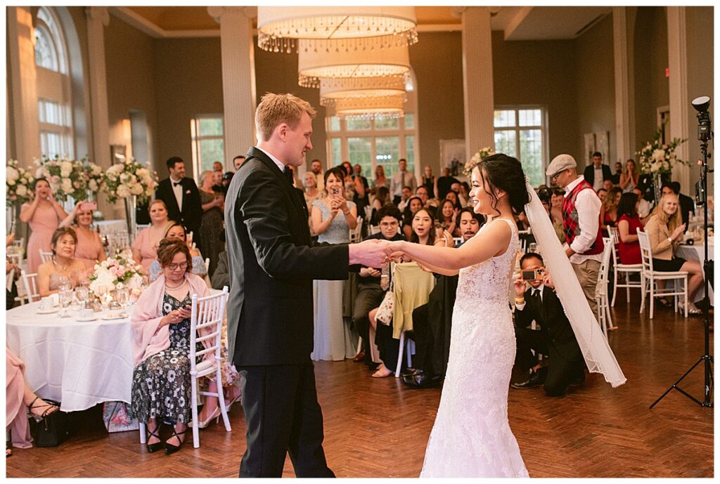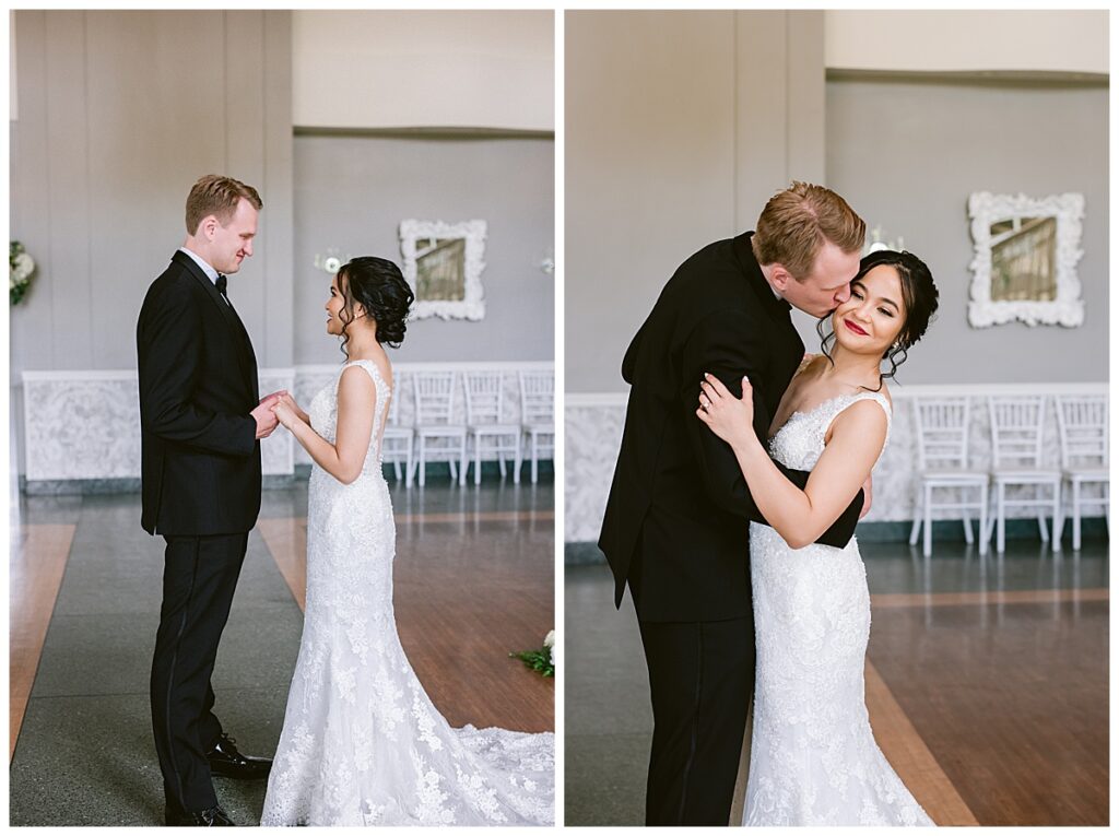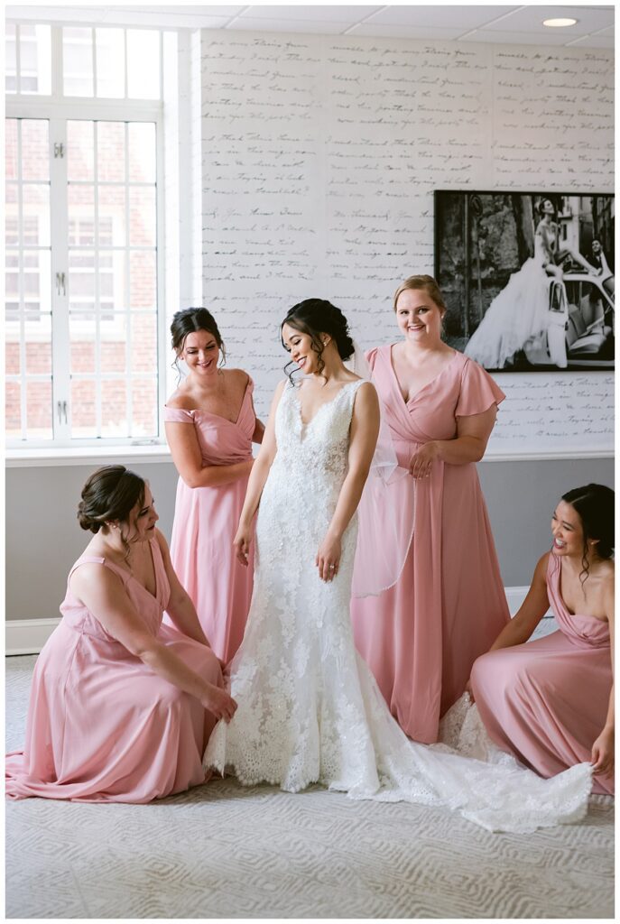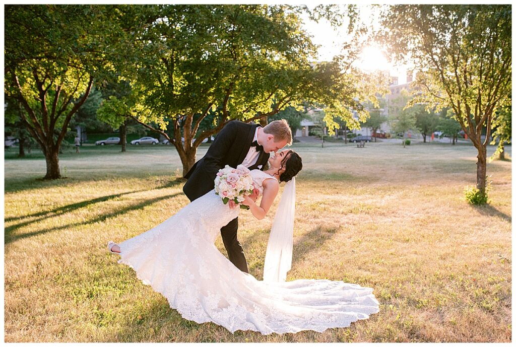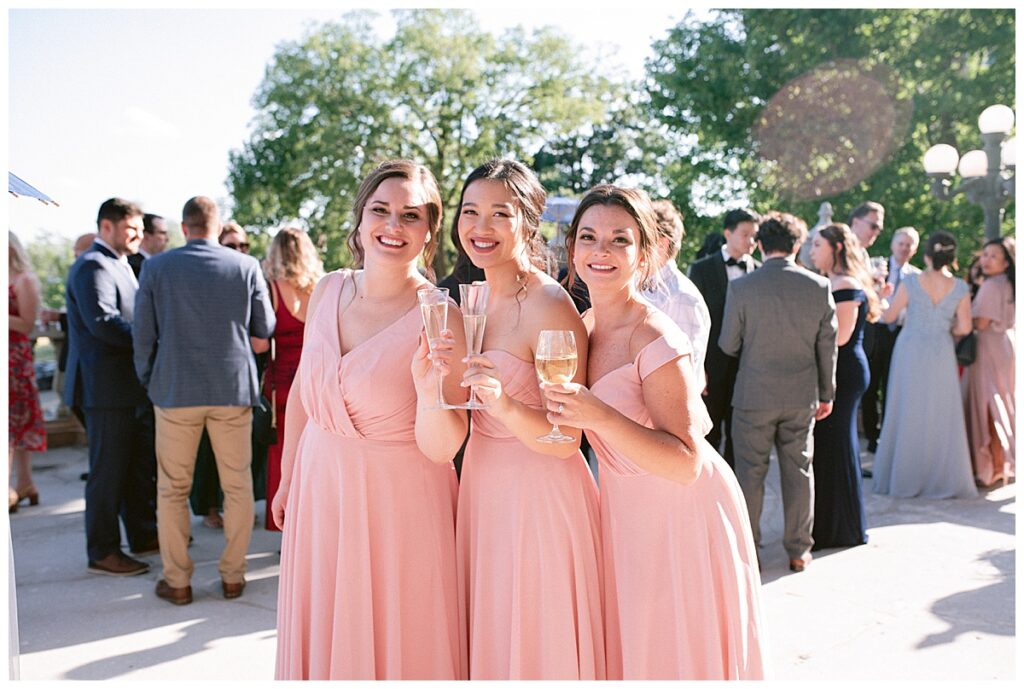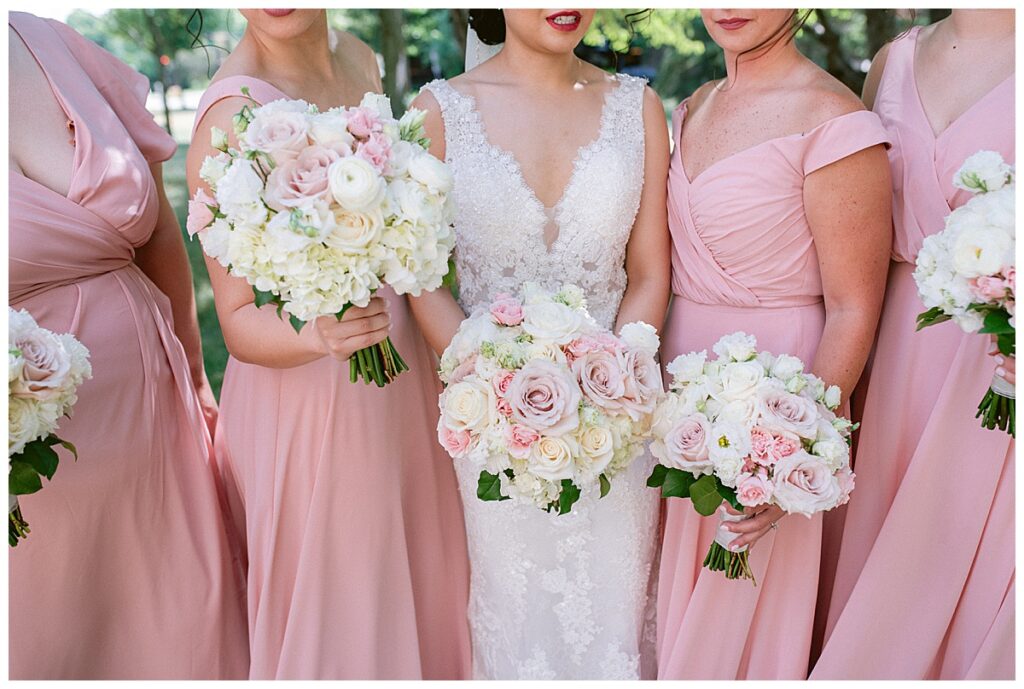 Tim and Milada chose to host their wedding at The Beach Club in Minneapolis. Located right off the Bde Maka Ska shoreline, the club is known for it’s class and elegance and provides the perfect backdrop for a beautiful urban wedding. Milada and her ladies began their morning getting ready with Sandy Xiong who did hair and make-up. They arrived at The Beach Club and got ready in the beautiful bridal suite where Milada mother helped her into her stunning dress from Vera’s House of Bridals. She and Tim chose to do their first look on the winding staircase, and then headed outdoors for photos on the streets in front of the club. The wedding party soon joined them with the ladies wearing blush colored dresses from David’s Bridal.The bouquets of garden roses and hydrangea from Richfiled Florals were the perfect accents when placed against the dresses and the classic black suits Tim and his groomsmen wore. We then headed to the green space near the club with the wedding party and had such a blast together with the men posing with croquet sticks (Tim’s favorite outdoor game!) and the women enjoying their time together.