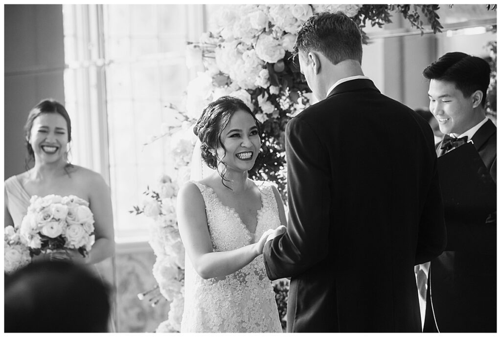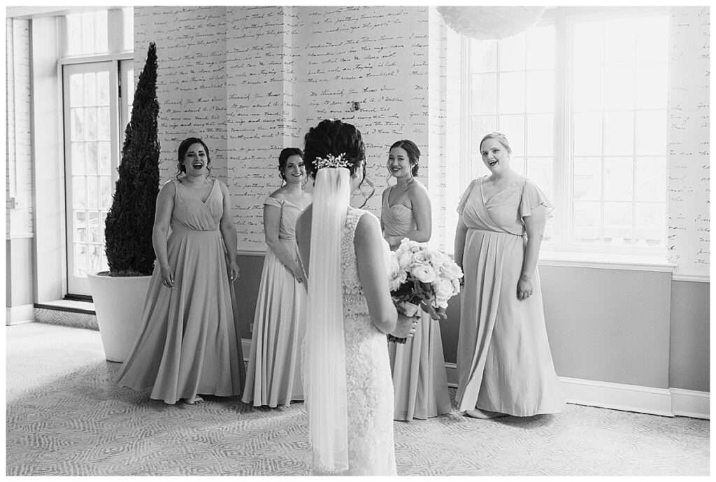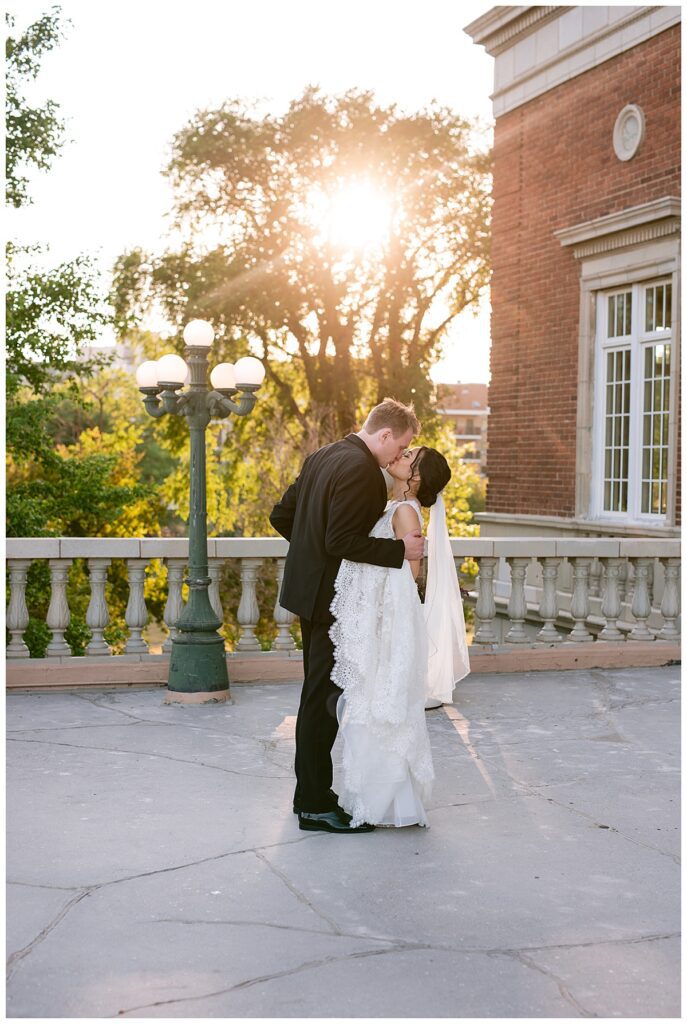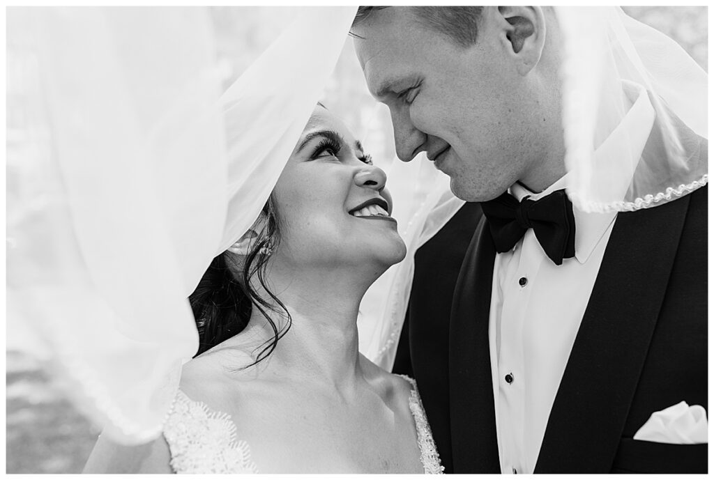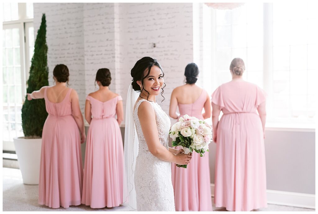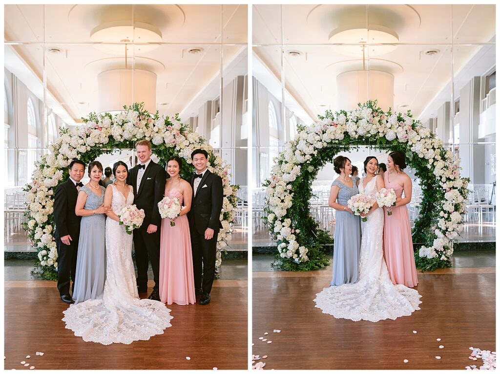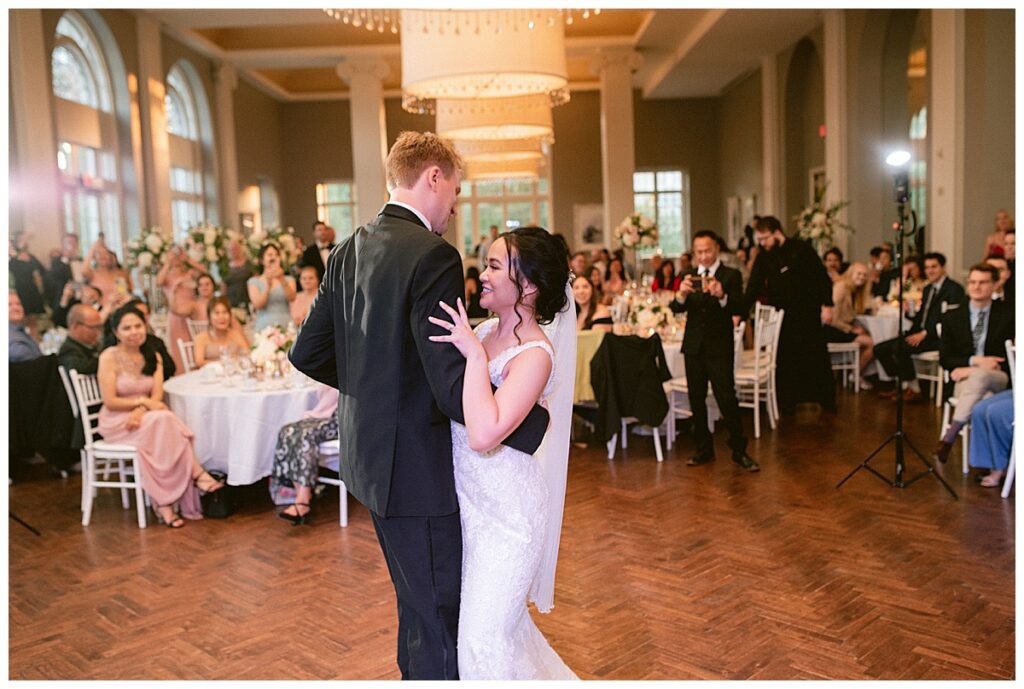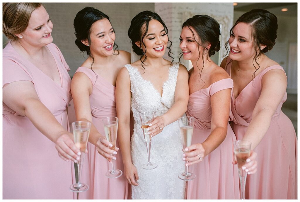 Tim and Milada chose to host their wedding at The Beach Club in Minneapolis. Located right off the Bde Maka Ska shoreline, the club is known for it’s class and elegance and provides the perfect backdrop for a beautiful urban wedding. Milada and her ladies began their morning getting ready with Sandy Xiong who did hair and make-up. They arrived at The Beach Club and got ready in the beautiful bridal suite where Milada mother helped her into her stunning dress from Vera’s House of Bridals. She and Tim chose to do their first look on the winding staircase, and then headed outdoors for photos on the streets in front of the club. The wedding party soon joined them with the ladies wearing blush colored dresses from David’s Bridal.The bouquets of garden roses and hydrangea from Richfiled Florals were the perfect accents when placed against the dresses and the classic black suits Tim and his groomsmen wore. We then headed to the green space near the club with the wedding party and had such a blast together with the men posing with croquet sticks (Tim’s favorite outdoor game!) and the women enjoying their time together.