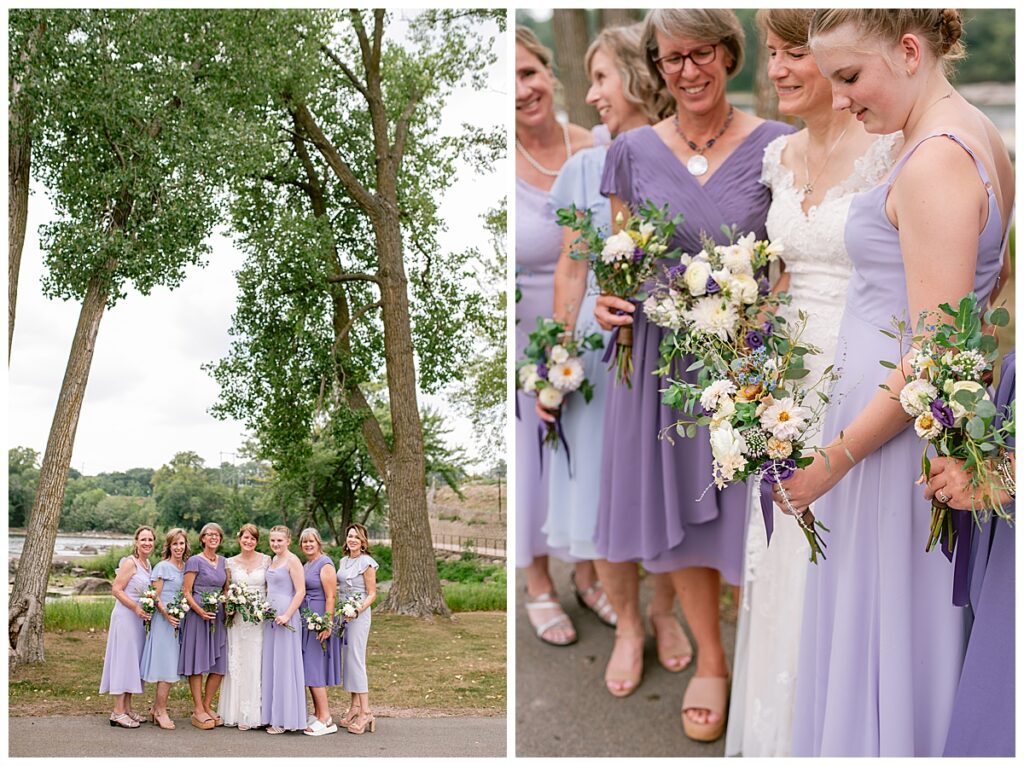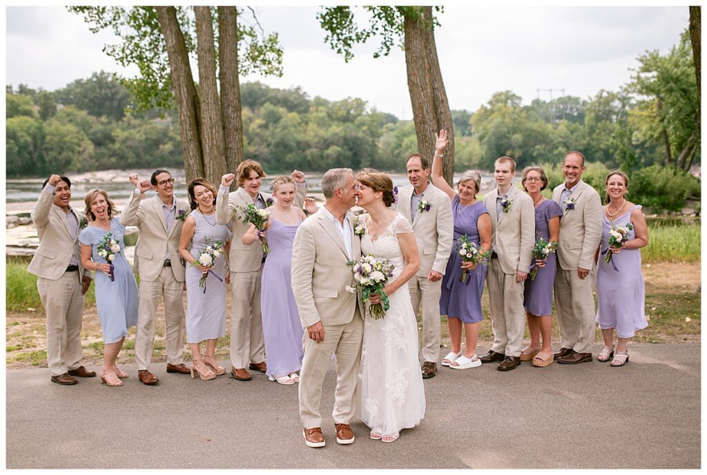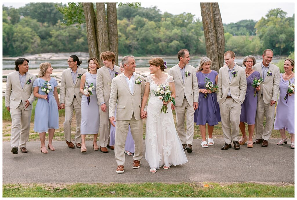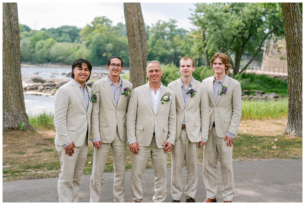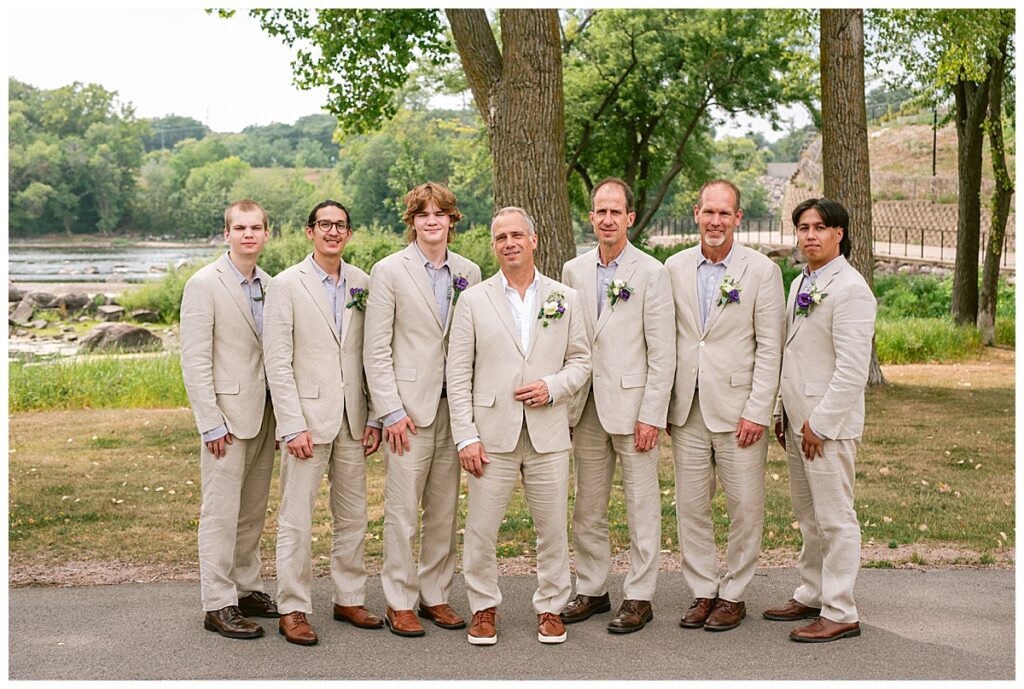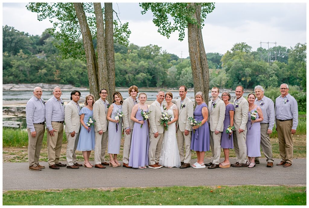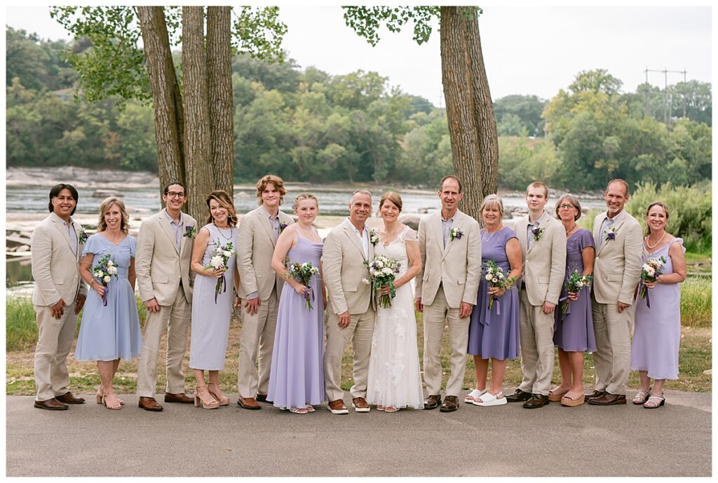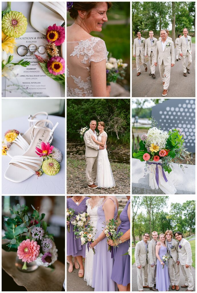 Jonathan and Dana chose to be married at The Clearing at Riverside Terrace, a beautiful event space along the banks of the Mississippi River in Sauk Rapids, Minnesota. The couple wanted to be in an outdoor space that emanated their love for nature and the outdoors, and the space was perfect. Wildflowers, water, rocks, and trees gave a serene, feel to all who joined them for their wedding day. Dana and her bridesmaids began the day by getting ready together for hair and makeup. Mitsu Yang from Liv and Reed Salon did Dana‘s hair in a beautiful up-do. Trisha Power grew and then created, a beautiful array of zinnias, dahlias, and wildflowers for the bouquets, boutonnieres, and table arrangements to display on their wedding day. The florals paired perfectly with the lavender Azazie dresses that each bridesmaid chose. The men looked dapper and their Ralph Lauren and Banana Republic tan linen suits while Dana wore a Sincerity Bridal dress purchased at Brides of France in Edina, Minnesota. Classic and elegant, it was a perfect dress for her.