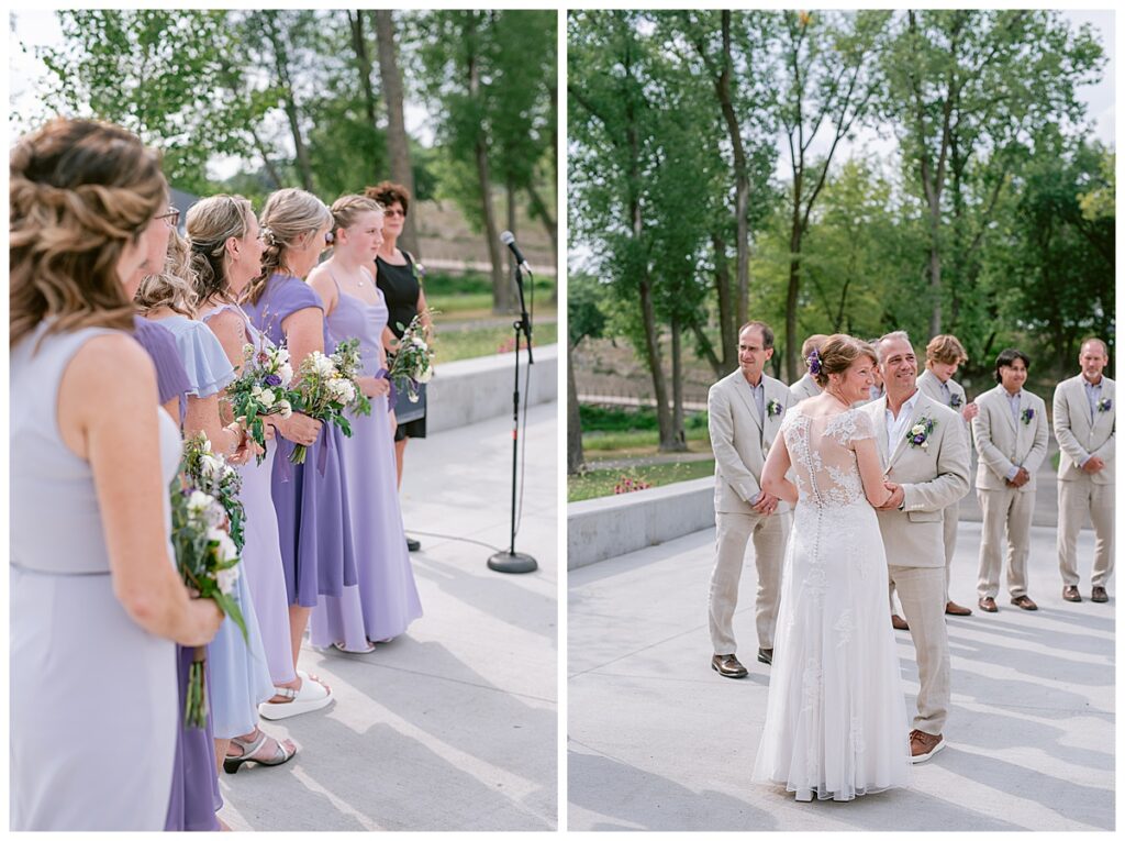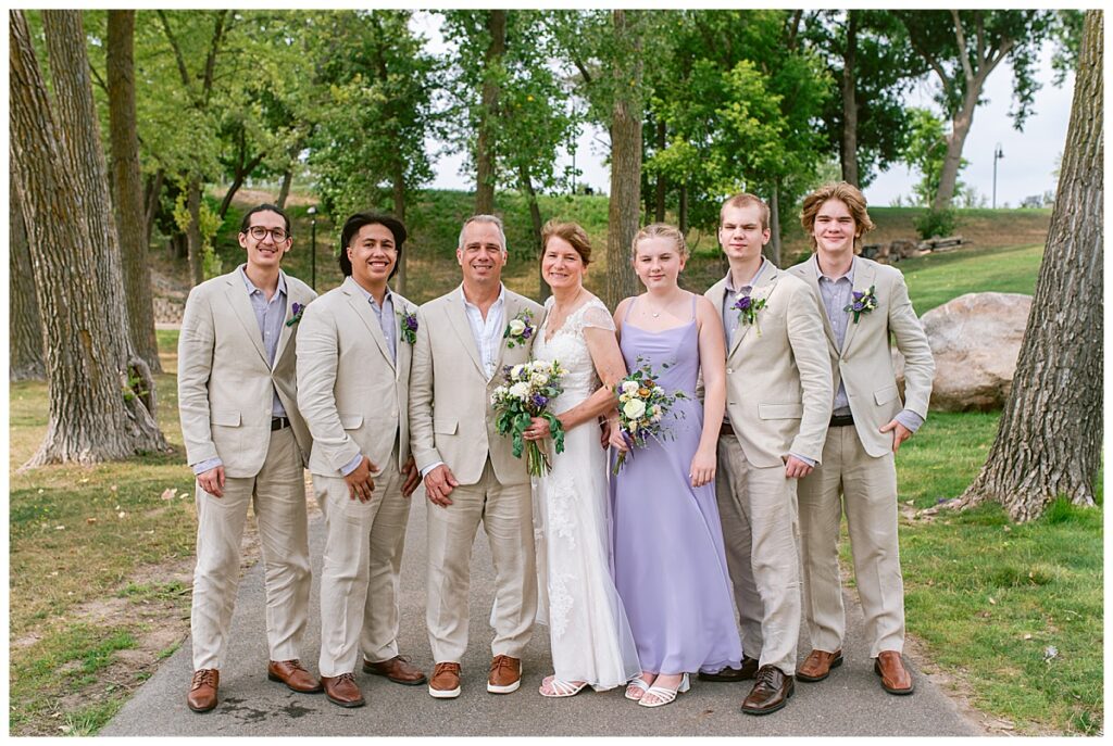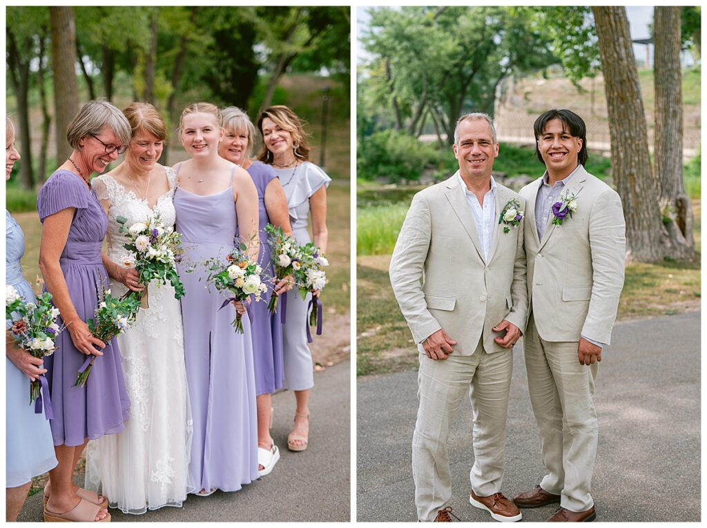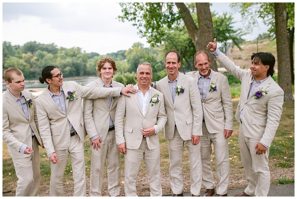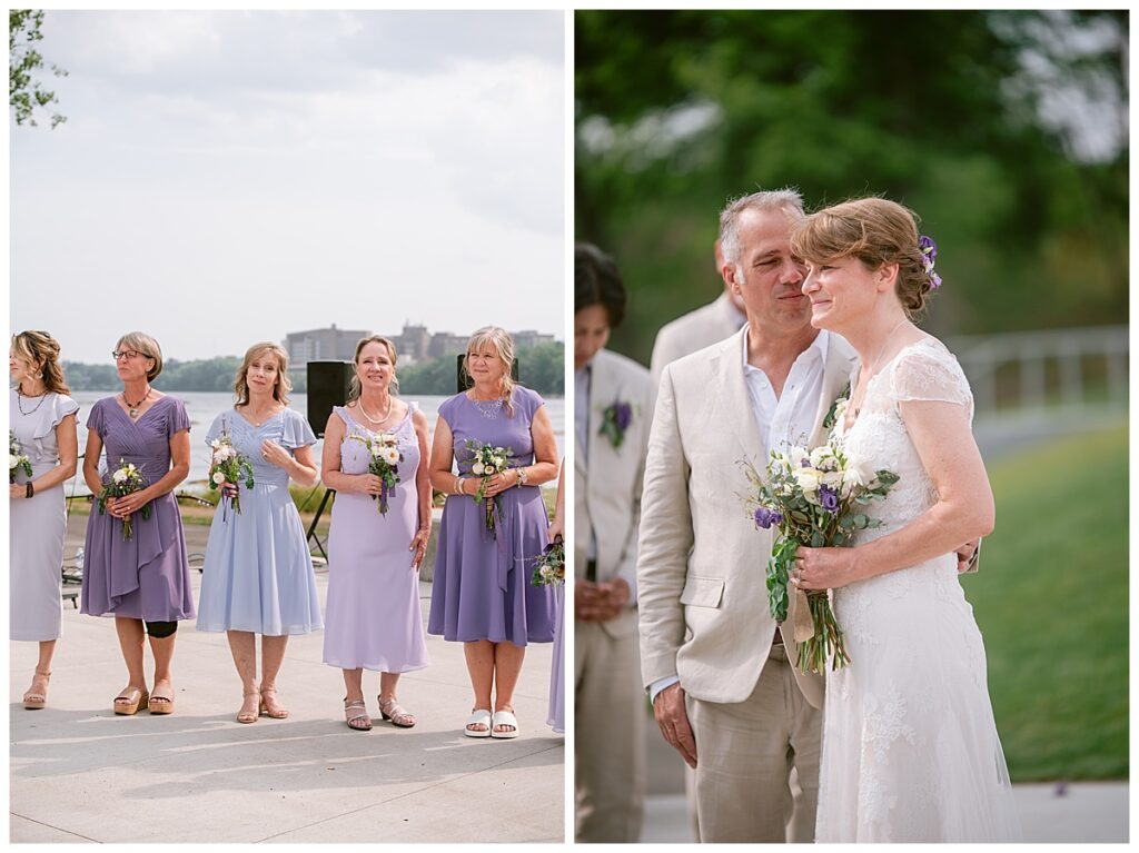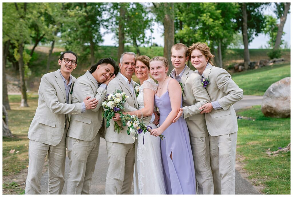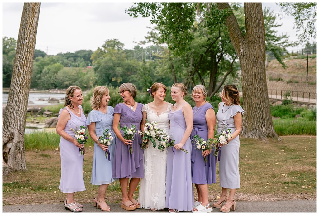 Jonathan and Dana chose to be married at The Clearing at Riverside Terrace, a beautiful event space along the banks of the Mississippi River in Sauk Rapids, Minnesota. The couple wanted to be in an outdoor space that emanated their love for nature and the outdoors, and the space was perfect. Wildflowers, water, rocks, and trees gave a serene, feel to all who joined them for their wedding day. Dana and her bridesmaids began the day by getting ready together for hair and makeup. Mitsu Yang from Liv and Reed Salon did Dana‘s hair in a beautiful up-do. Trisha Power grew and then created, a beautiful array of zinnias, dahlias, and wildflowers for the bouquets, boutonnieres, and table arrangements to display on their wedding day. The florals paired perfectly with the lavender Azazie dresses that each bridesmaid chose. The men looked dapper and their Ralph Lauren and Banana Republic tan linen suits while Dana wore a Sincerity Bridal dress purchased at Brides of France in Edina, Minnesota. Classic and elegant, it was a perfect dress for her.