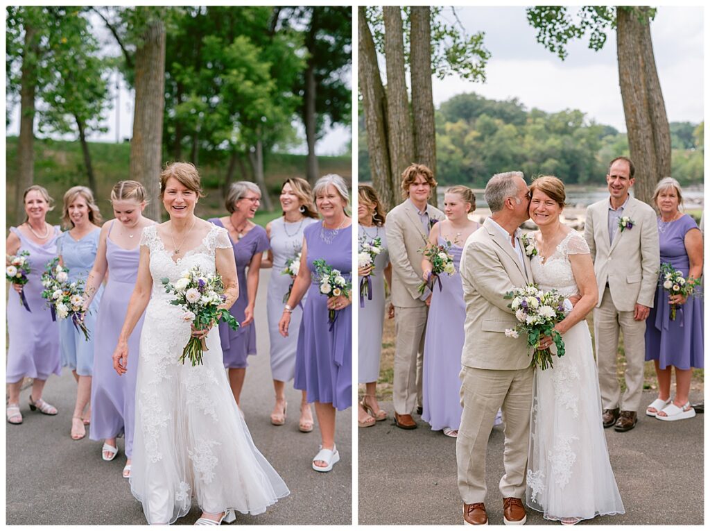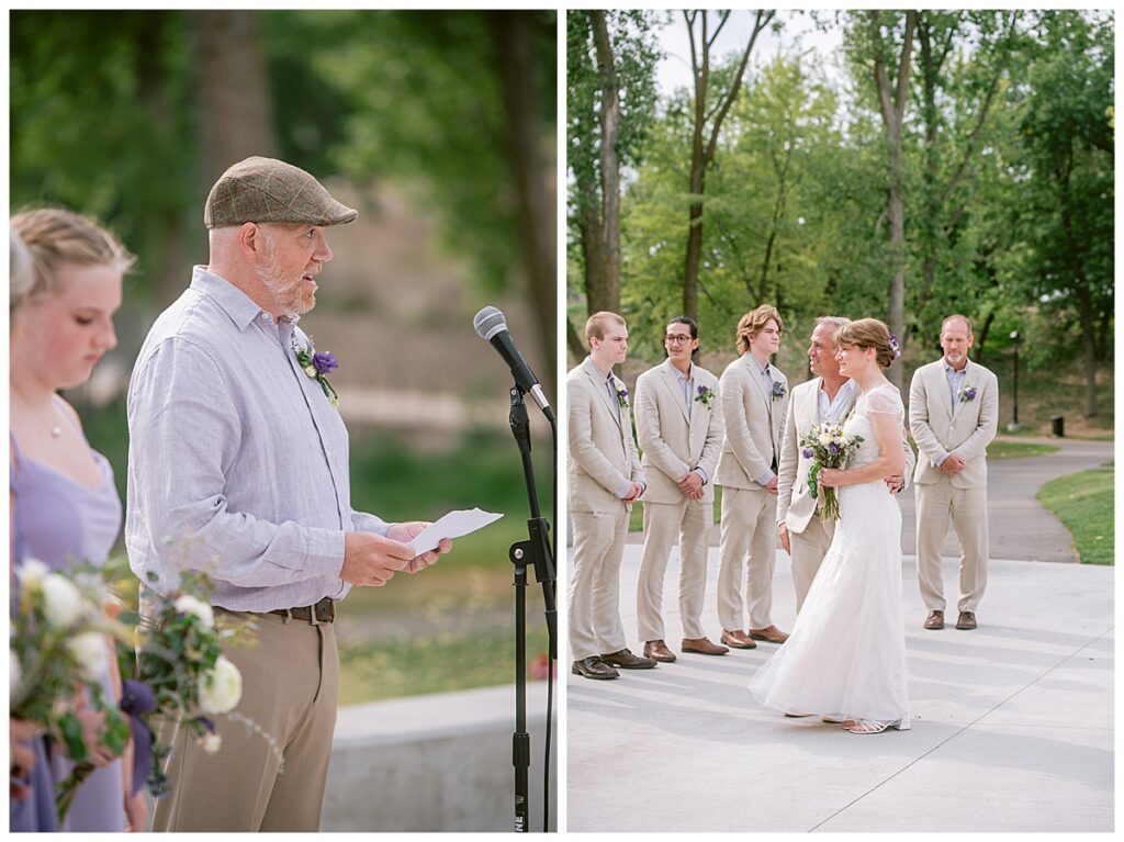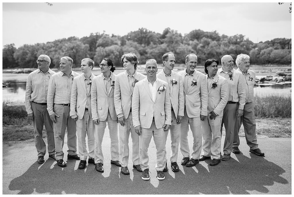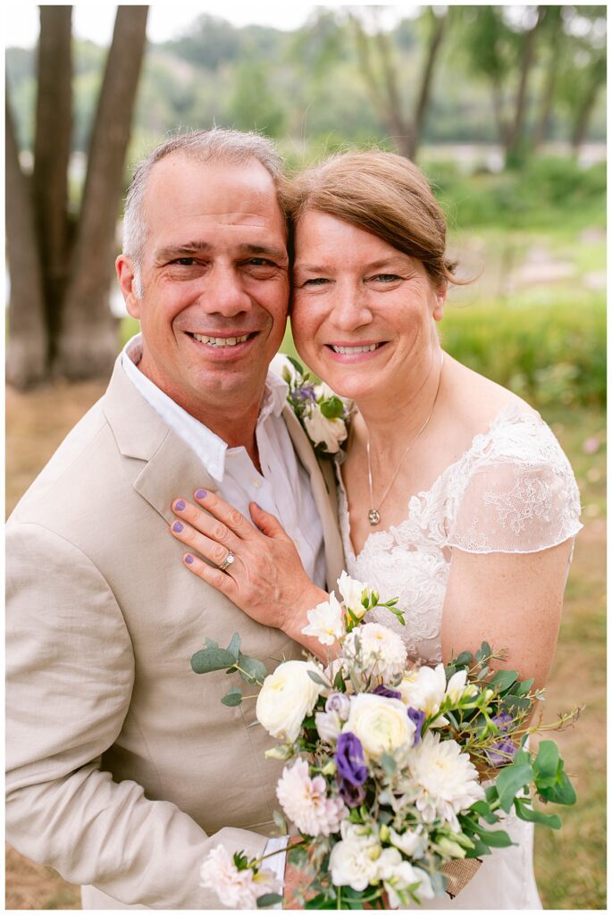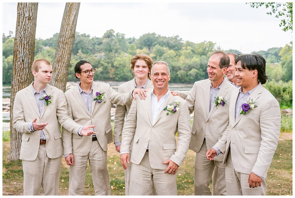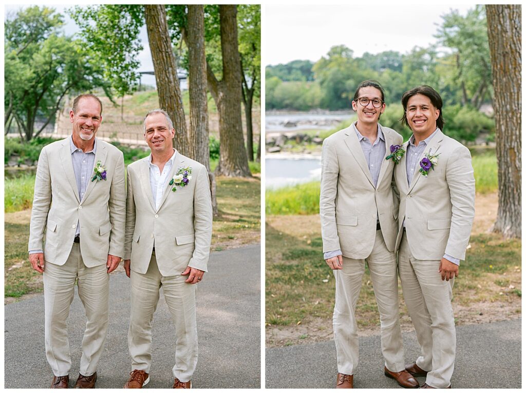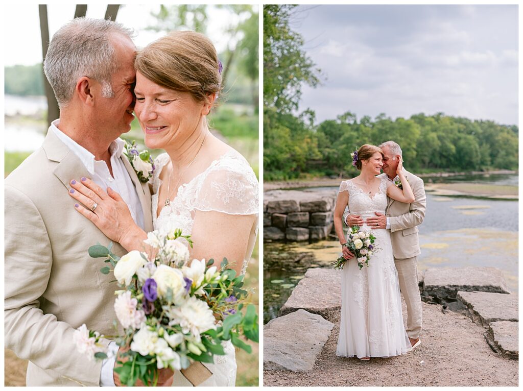 Jonathan and Dana chose to be married at The Clearing at Riverside Terrace, a beautiful event space along the banks of the Mississippi River in Sauk Rapids, Minnesota. The couple wanted to be in an outdoor space that emanated their love for nature and the outdoors, and the space was perfect. Wildflowers, water, rocks, and trees gave a serene, feel to all who joined them for their wedding day. Dana and her bridesmaids began the day by getting ready together for hair and makeup. Mitsu Yang from Liv and Reed Salon did Dana‘s hair in a beautiful up-do. Trisha Power grew and then created, a beautiful array of zinnias, dahlias, and wildflowers for the bouquets, boutonnieres, and table arrangements to display on their wedding day. The florals paired perfectly with the lavender Azazie dresses that each bridesmaid chose. The men looked dapper and their Ralph Lauren and Banana Republic tan linen suits while Dana wore a Sincerity Bridal dress purchased at Brides of France in Edina, Minnesota. Classic and elegant, it was a perfect dress for her.