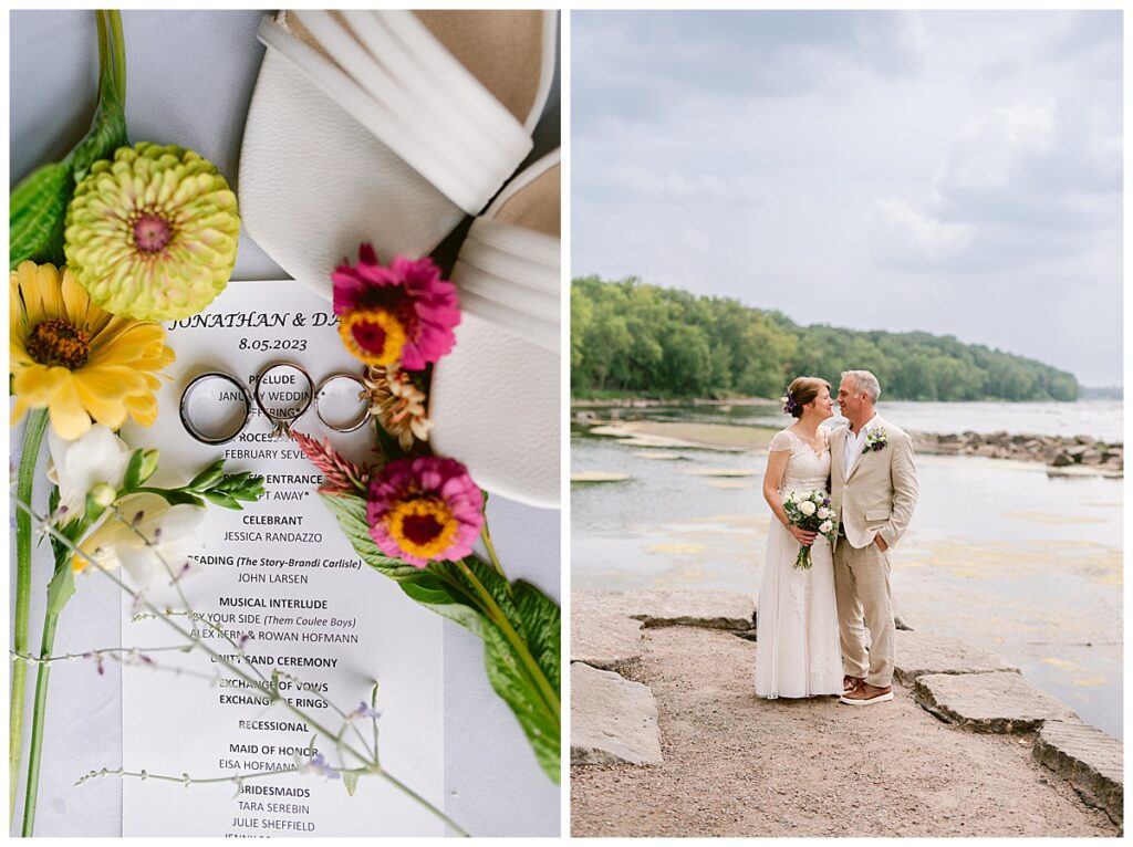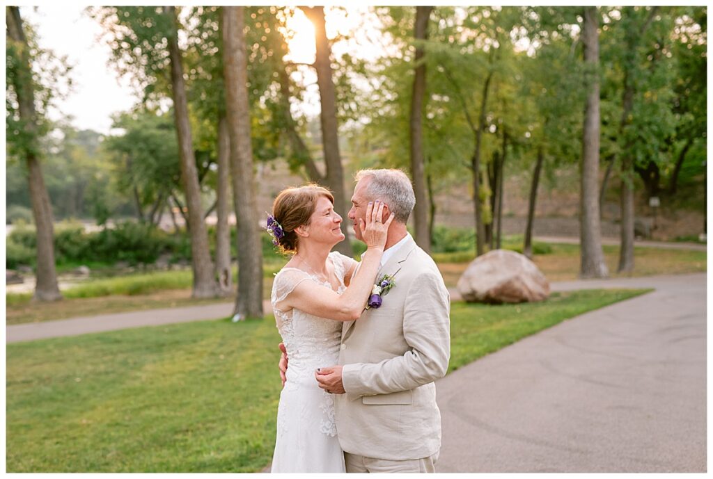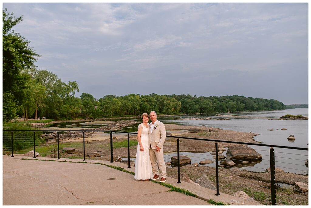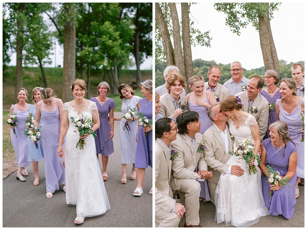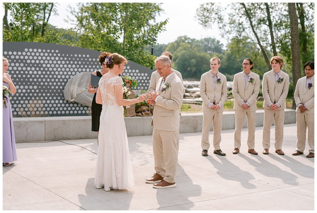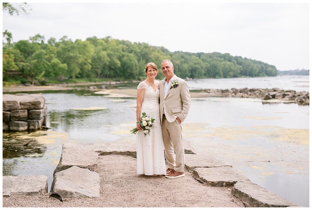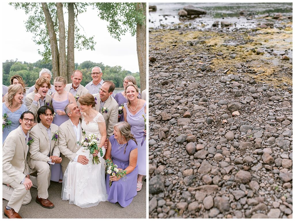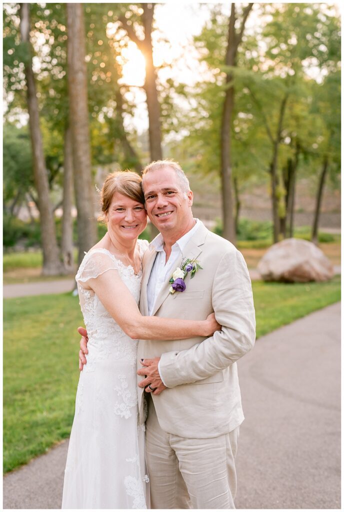 Jonathan and Dana chose to be married at The Clearing at Riverside Terrace, a beautiful event space along the banks of the Mississippi River in Sauk Rapids, Minnesota. The couple wanted to be in an outdoor space that emanated their love for nature and the outdoors, and the space was perfect. Wildflowers, water, rocks, and trees gave a serene, feel to all who joined them for their wedding day. Dana and her bridesmaids began the day by getting ready together for hair and makeup. Mitsu Yang from Liv and Reed Salon did Dana‘s hair in a beautiful up-do. Trisha Power grew and then created, a beautiful array of zinnias, dahlias, and wildflowers for the bouquets, boutonnieres, and table arrangements to display on their wedding day. The florals paired perfectly with the lavender Azazie dresses that each bridesmaid chose. The men looked dapper and their Ralph Lauren and Banana Republic tan linen suits while Dana wore a Sincerity Bridal dress purchased at Brides of France in Edina, Minnesota. Classic and elegant, it was a perfect dress for her.