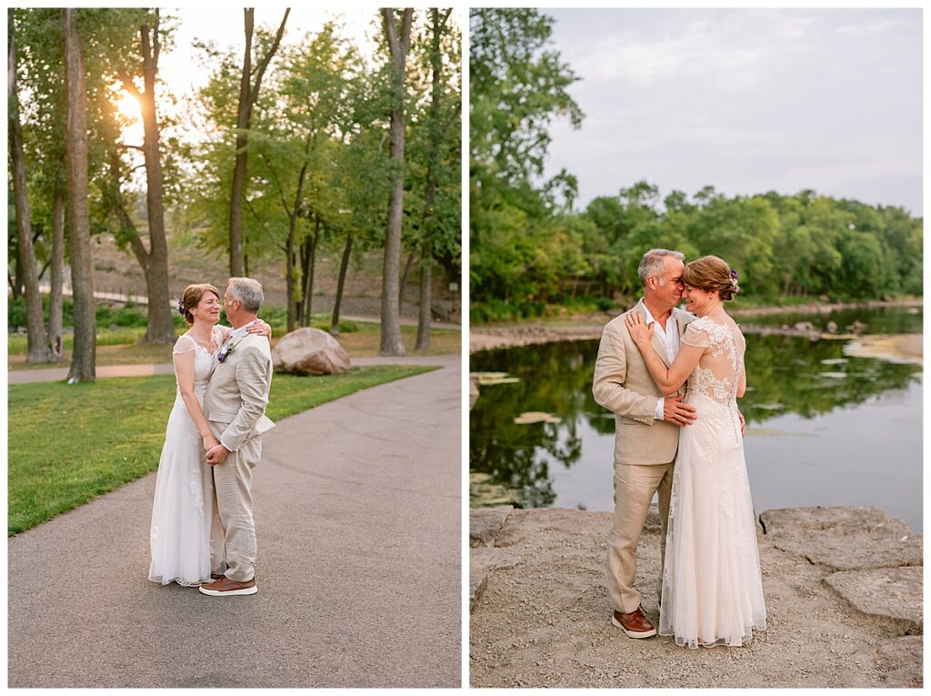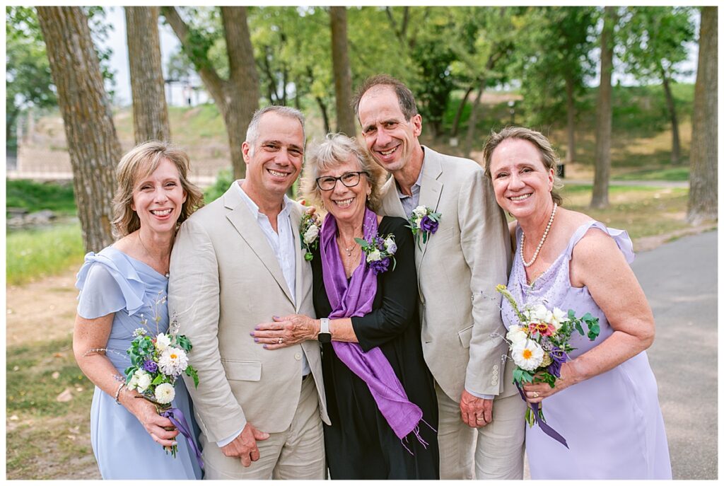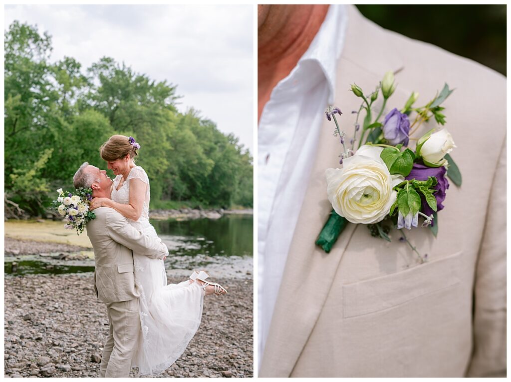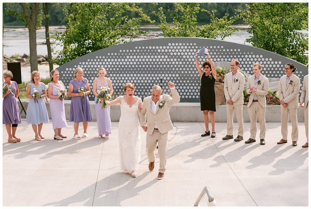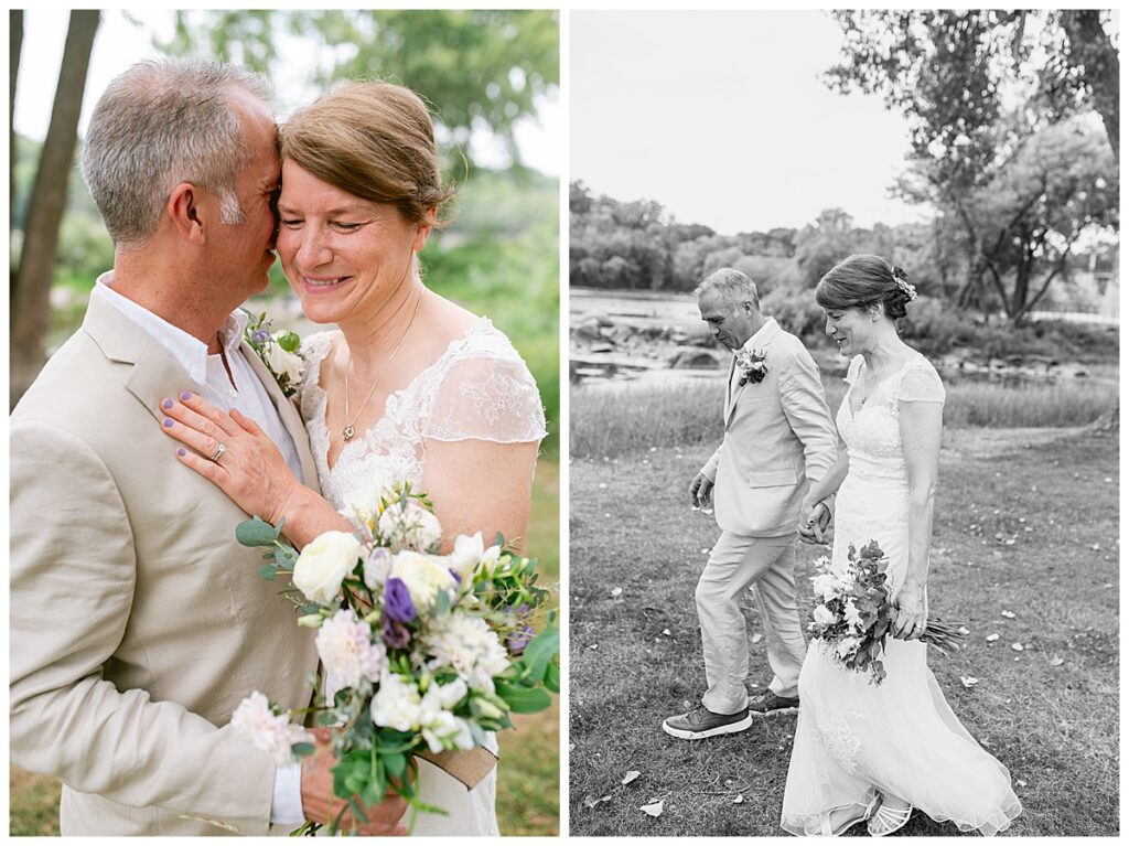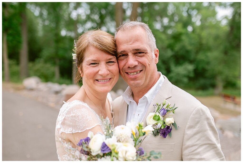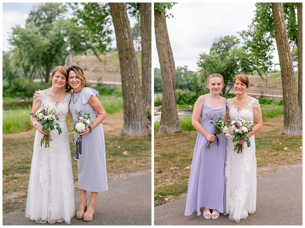 Jonathan and Dana chose to be married at The Clearing at Riverside Terrace, a beautiful event space along the banks of the Mississippi River in Sauk Rapids, Minnesota. The couple wanted to be in an outdoor space that emanated their love for nature and the outdoors, and the space was perfect. Wildflowers, water, rocks, and trees gave a serene, feel to all who joined them for their wedding day. Dana and her bridesmaids began the day by getting ready together for hair and makeup. Mitsu Yang from Liv and Reed Salon did Dana‘s hair in a beautiful up-do. Trisha Power grew and then created, a beautiful array of zinnias, dahlias, and wildflowers for the bouquets, boutonnieres, and table arrangements to display on their wedding day. The florals paired perfectly with the lavender Azazie dresses that each bridesmaid chose. The men looked dapper and their Ralph Lauren and Banana Republic tan linen suits while Dana wore a Sincerity Bridal dress purchased at Brides of France in Edina, Minnesota. Classic and elegant, it was a perfect dress for her.