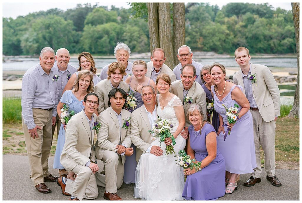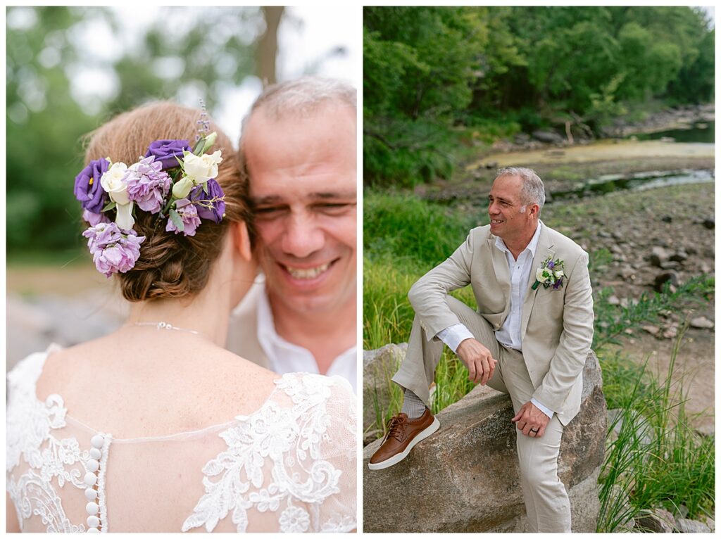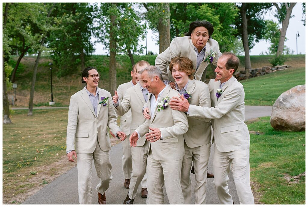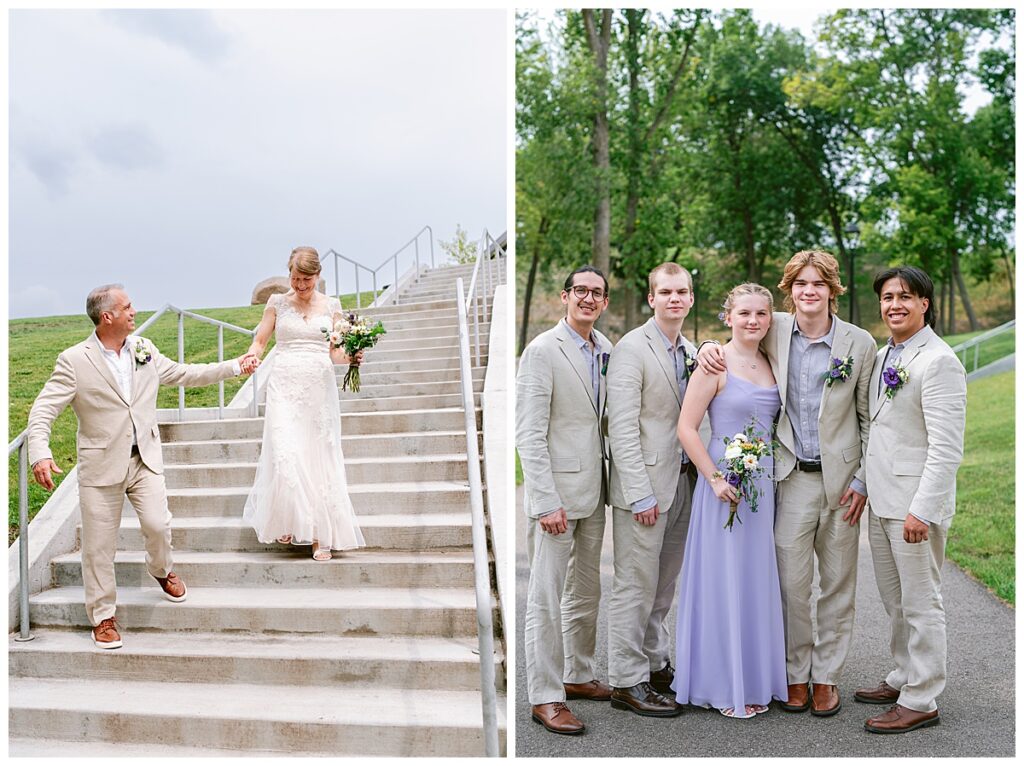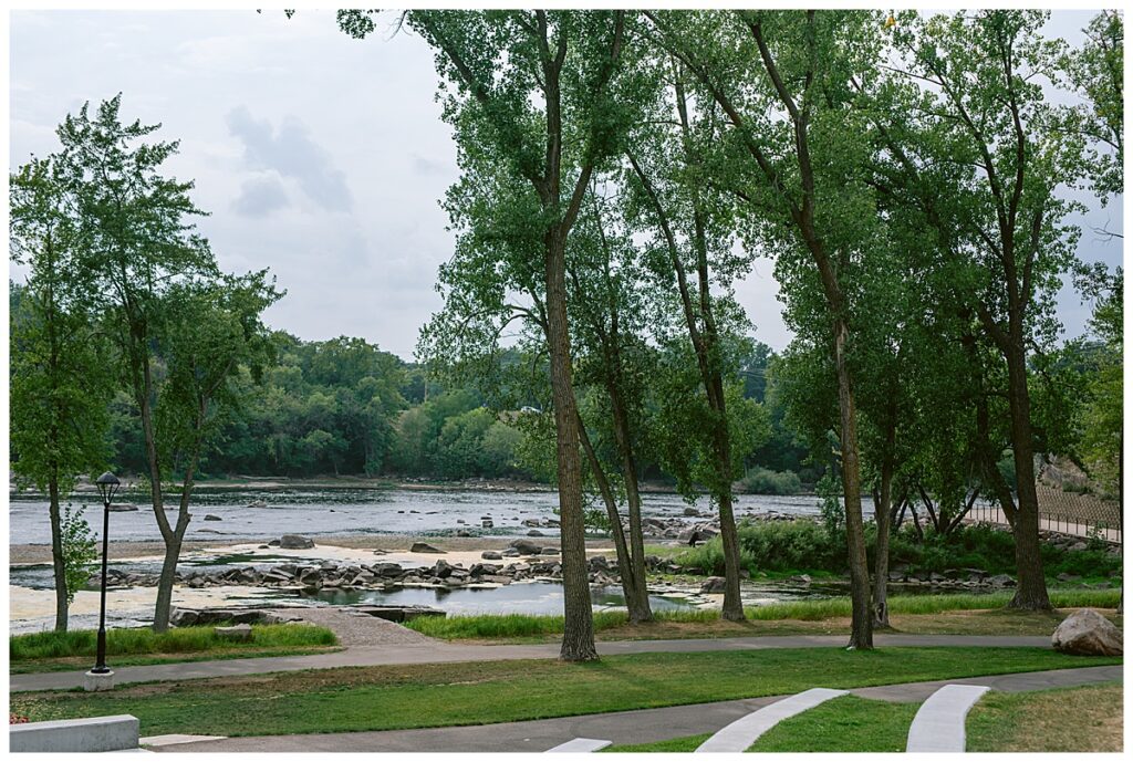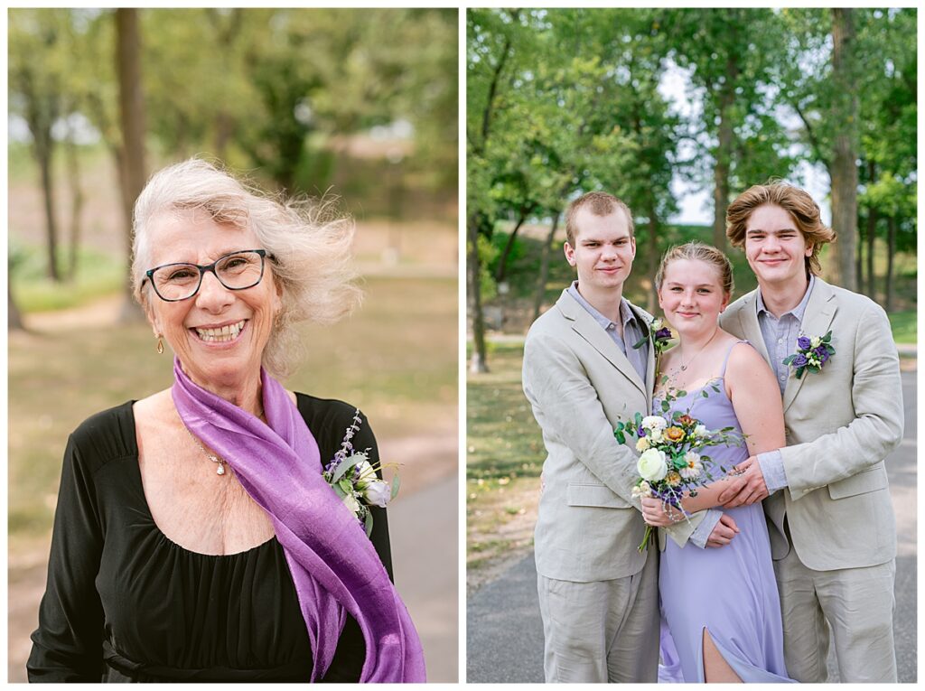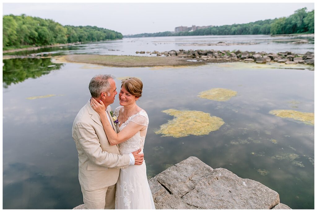 Jonathan and Dana chose to be married at The Clearing at Riverside Terrace, a beautiful event space along the banks of the Mississippi River in Sauk Rapids, Minnesota. The couple wanted to be in an outdoor space that emanated their love for nature and the outdoors, and the space was perfect. Wildflowers, water, rocks, and trees gave a serene, feel to all who joined them for their wedding day. Dana and her bridesmaids began the day by getting ready together for hair and makeup. Mitsu Yang from Liv and Reed Salon did Dana‘s hair in a beautiful up-do. Trisha Power grew and then created, a beautiful array of zinnias, dahlias, and wildflowers for the bouquets, boutonnieres, and table arrangements to display on their wedding day. The florals paired perfectly with the lavender Azazie dresses that each bridesmaid chose. The men looked dapper and their Ralph Lauren and Banana Republic tan linen suits while Dana wore a Sincerity Bridal dress purchased at Brides of France in Edina, Minnesota. Classic and elegant, it was a perfect dress for her.