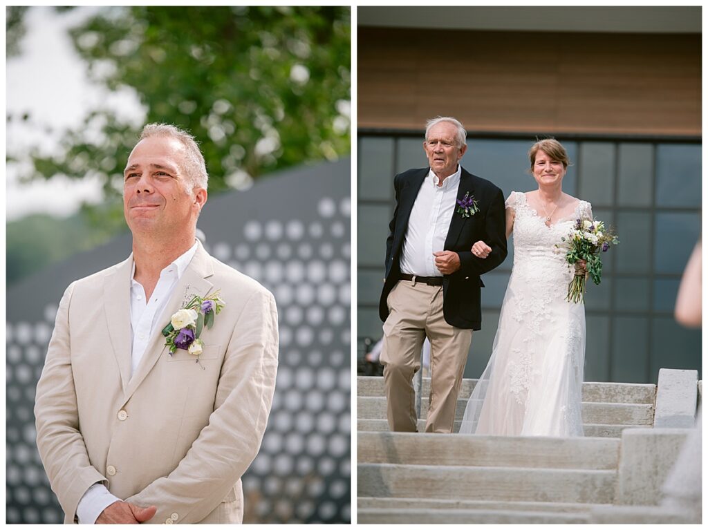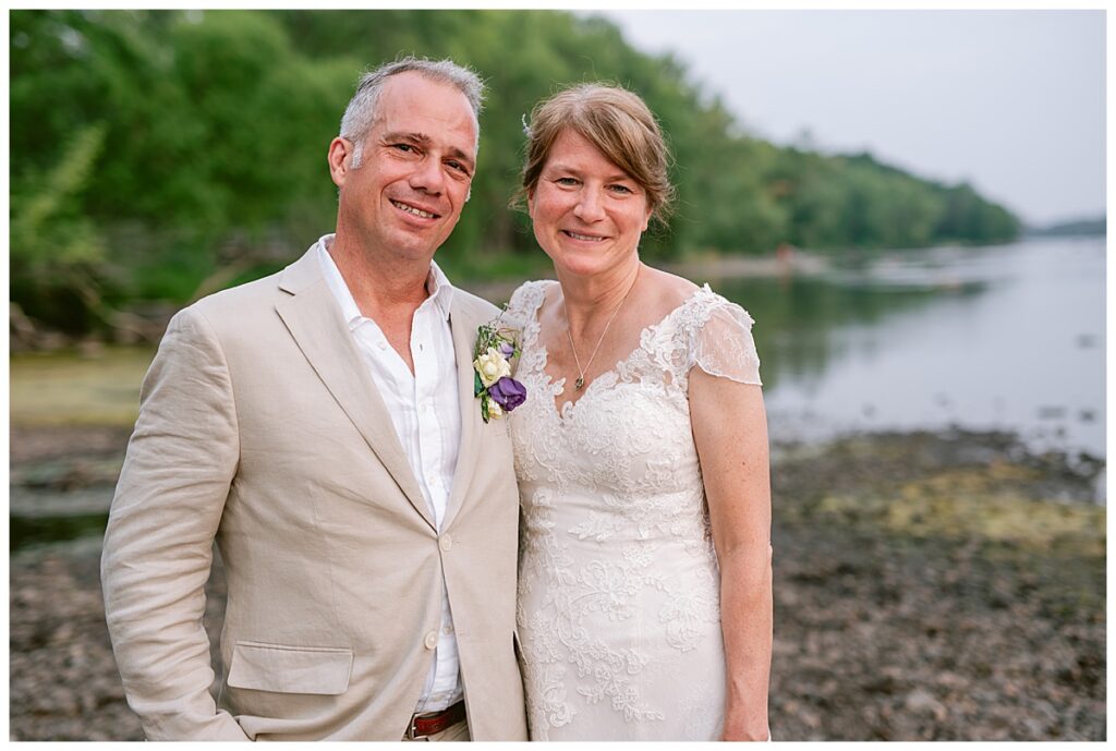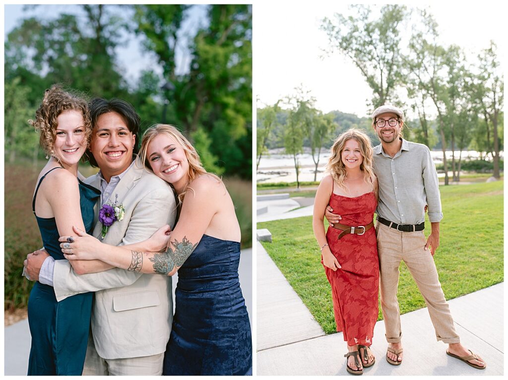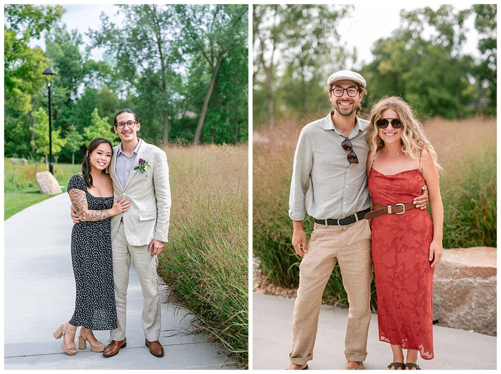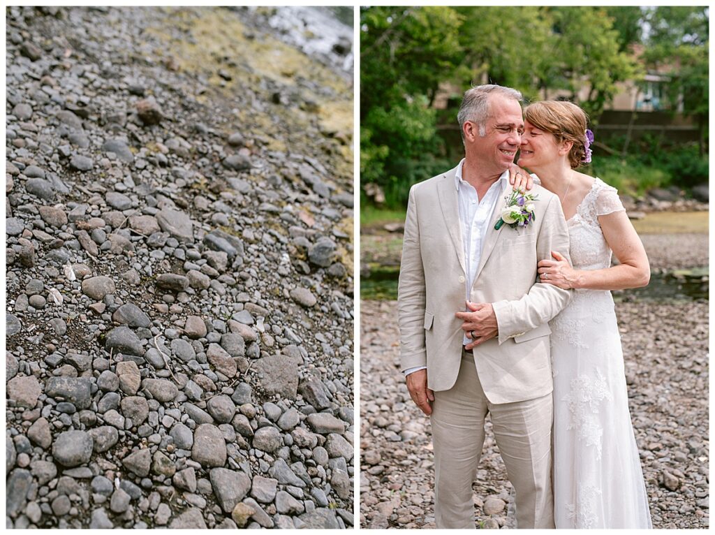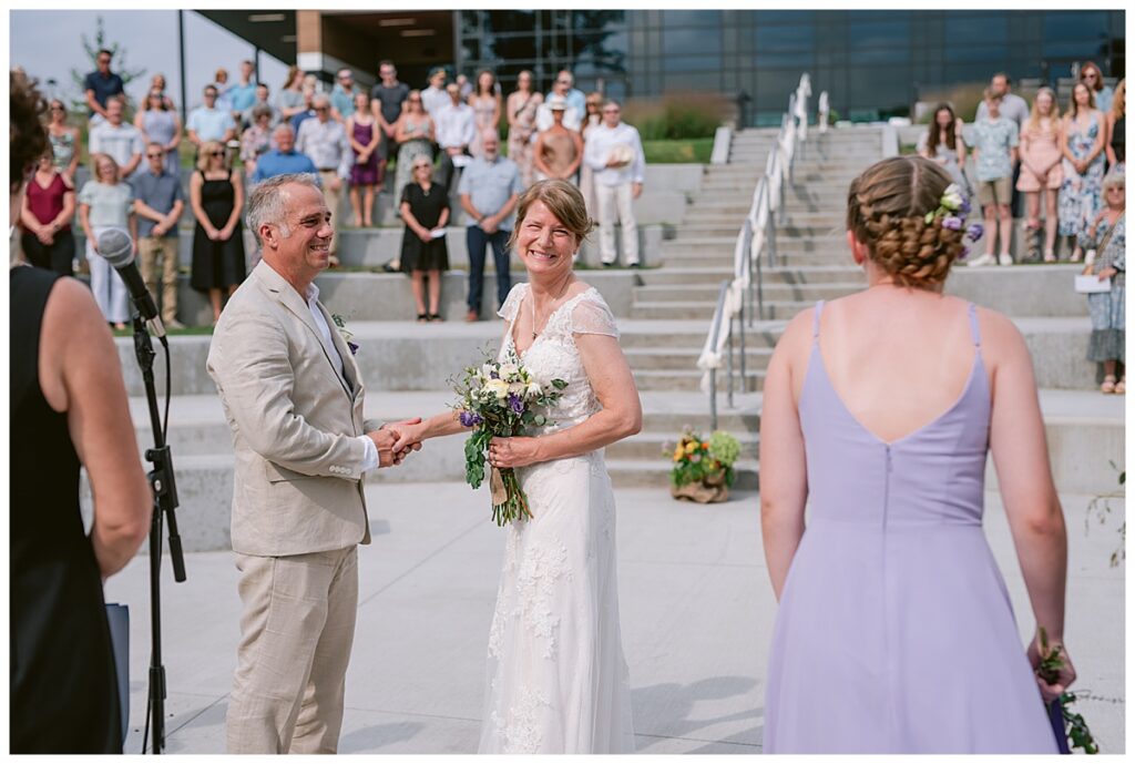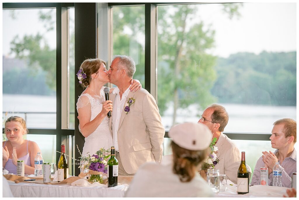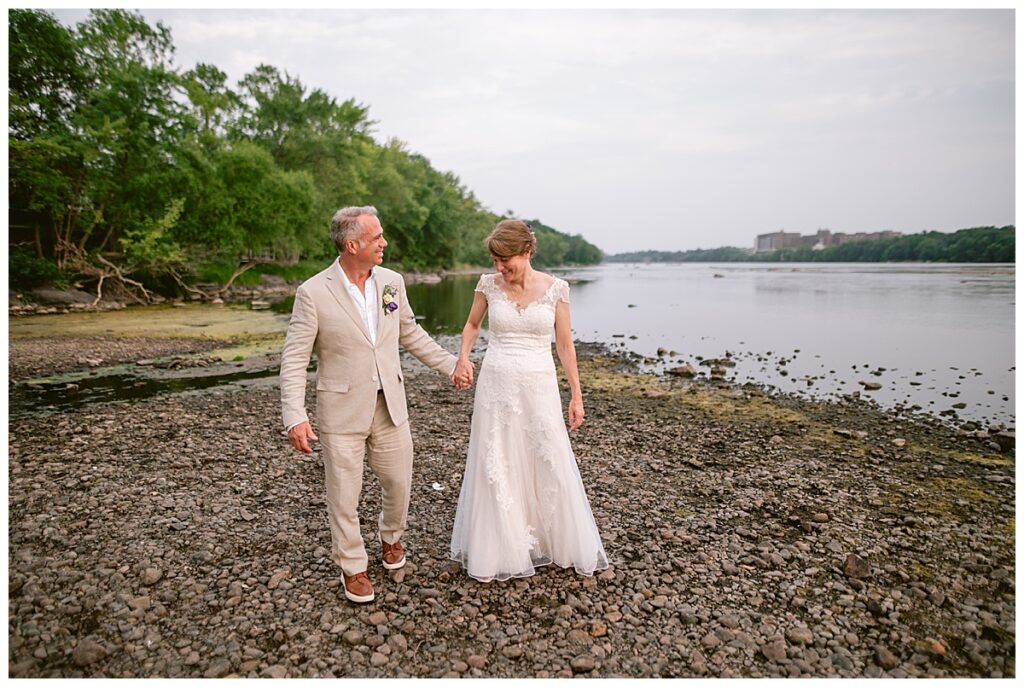 Jonathan and Dana chose to be married at The Clearing at Riverside Terrace, a beautiful event space along the banks of the Mississippi River in Sauk Rapids, Minnesota. The couple wanted to be in an outdoor space that emanated their love for nature and the outdoors, and the space was perfect. Wildflowers, water, rocks, and trees gave a serene, feel to all who joined them for their wedding day. Dana and her bridesmaids began the day by getting ready together for hair and makeup. Mitsu Yang from Liv and Reed Salon did Dana‘s hair in a beautiful up-do. Trisha Power grew and then created, a beautiful array of zinnias, dahlias, and wildflowers for the bouquets, boutonnieres, and table arrangements to display on their wedding day. The florals paired perfectly with the lavender Azazie dresses that each bridesmaid chose. The men looked dapper and their Ralph Lauren and Banana Republic tan linen suits while Dana wore a Sincerity Bridal dress purchased at Brides of France in Edina, Minnesota. Classic and elegant, it was a perfect dress for her.