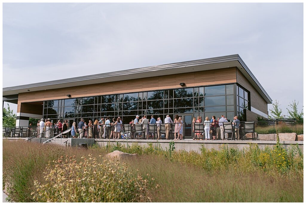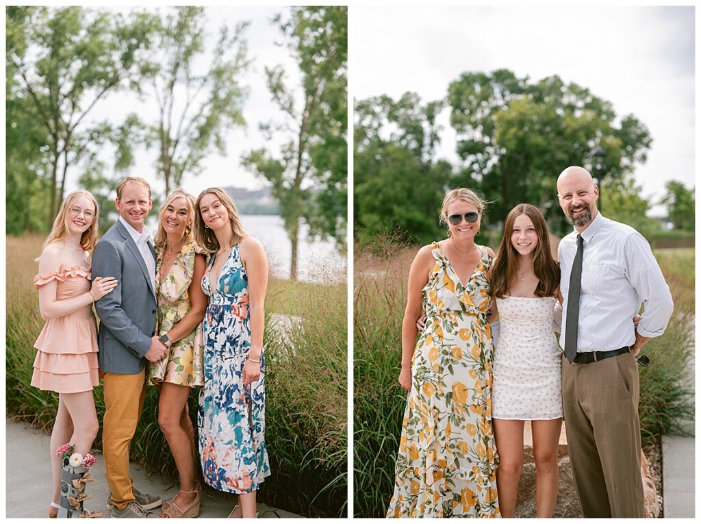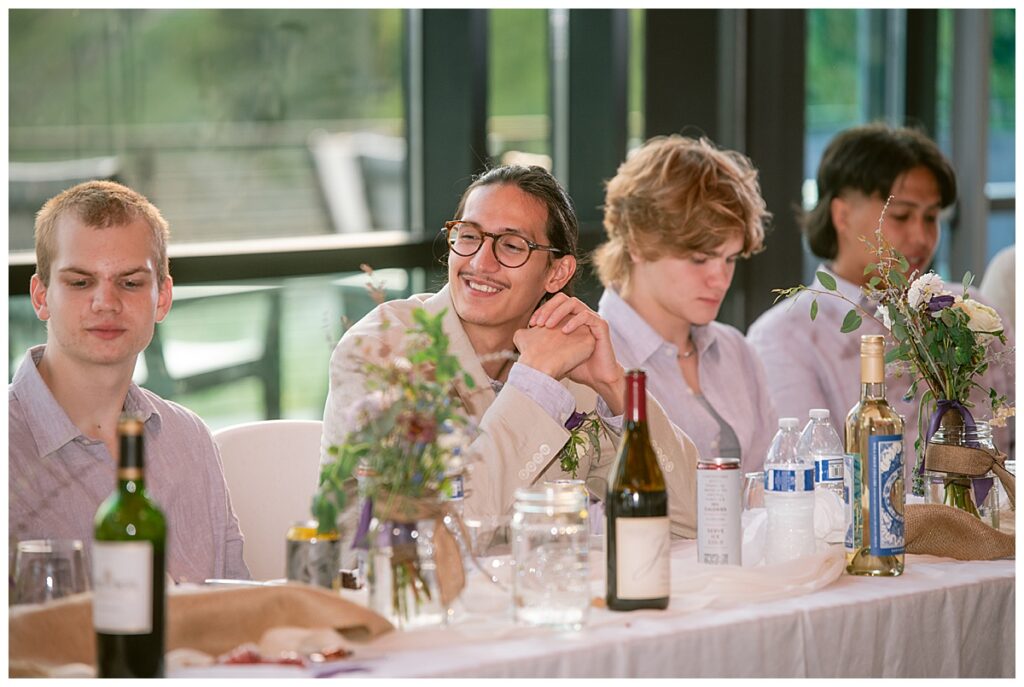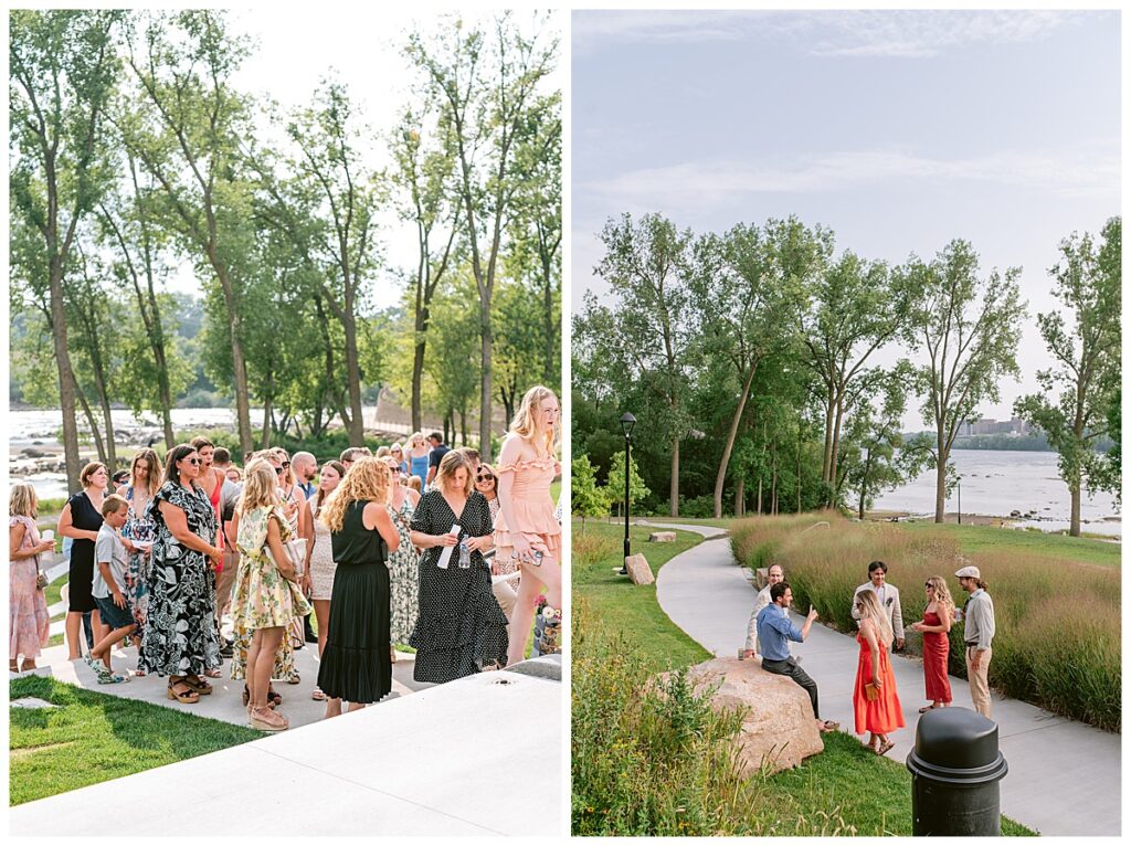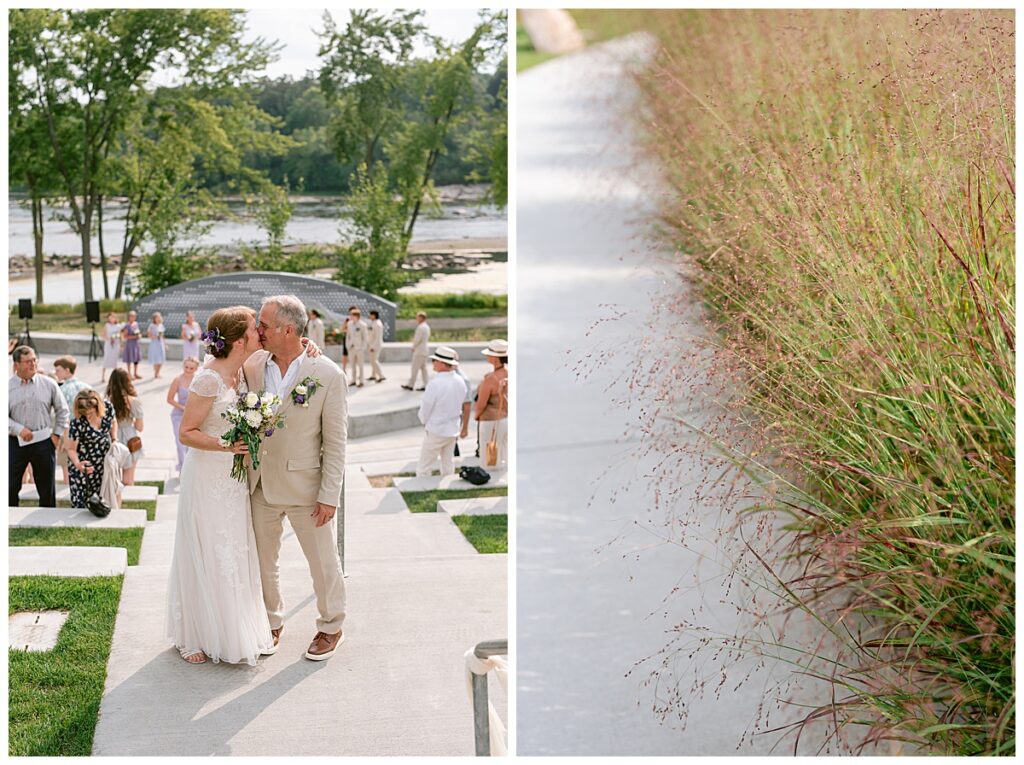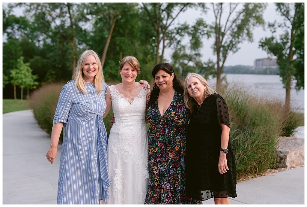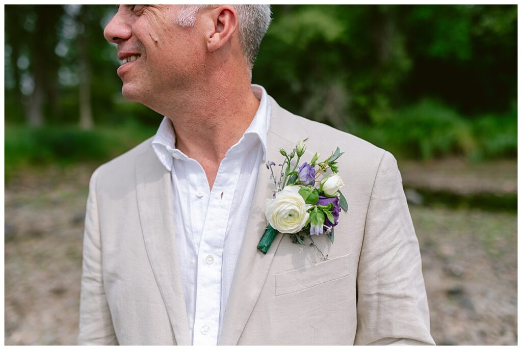 Jonathan and Dana chose to be married at The Clearing at Riverside Terrace, a beautiful event space along the banks of the Mississippi River in Sauk Rapids, Minnesota. The couple wanted to be in an outdoor space that emanated their love for nature and the outdoors, and the space was perfect. Wildflowers, water, rocks, and trees gave a serene, feel to all who joined them for their wedding day. Dana and her bridesmaids began the day by getting ready together for hair and makeup. Mitsu Yang from Liv and Reed Salon did Dana‘s hair in a beautiful up-do. Trisha Power grew and then created, a beautiful array of zinnias, dahlias, and wildflowers for the bouquets, boutonnieres, and table arrangements to display on their wedding day. The florals paired perfectly with the lavender Azazie dresses that each bridesmaid chose. The men looked dapper and their Ralph Lauren and Banana Republic tan linen suits while Dana wore a Sincerity Bridal dress purchased at Brides of France in Edina, Minnesota. Classic and elegant, it was a perfect dress for her.