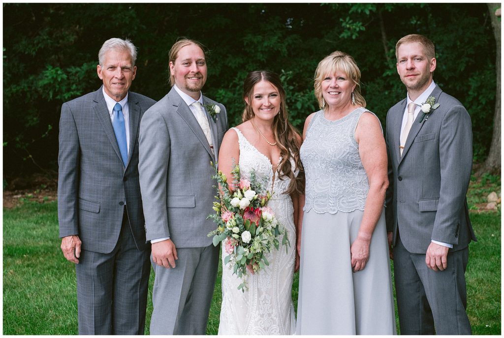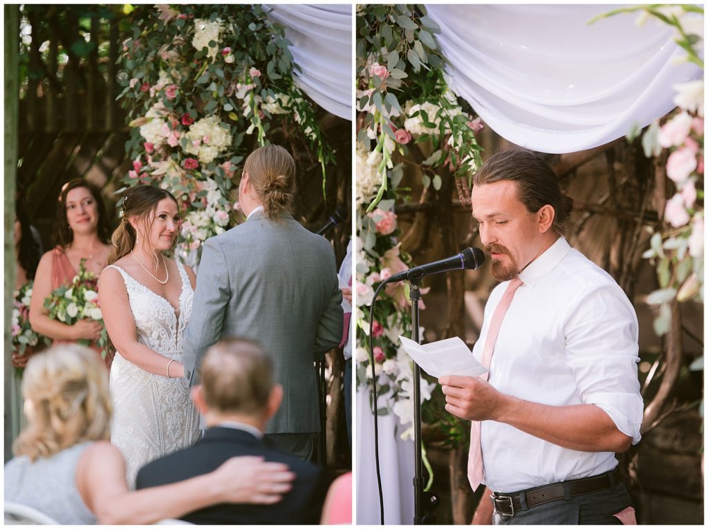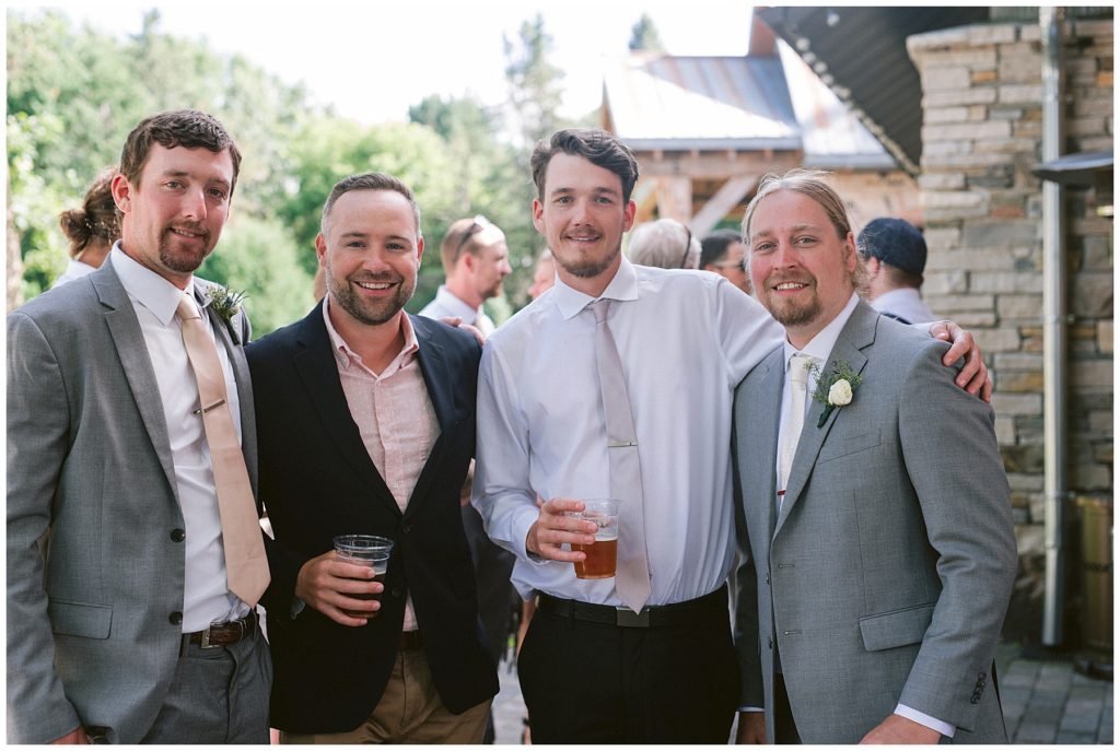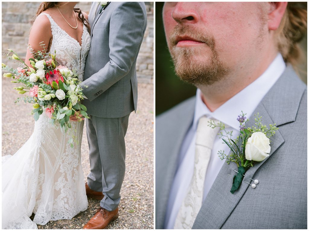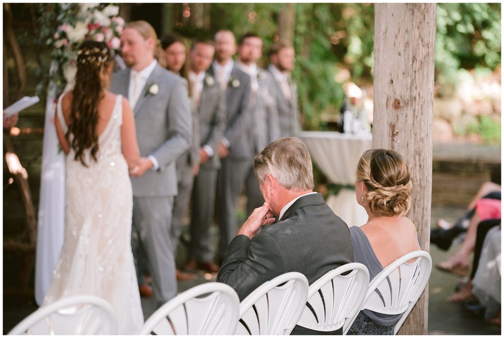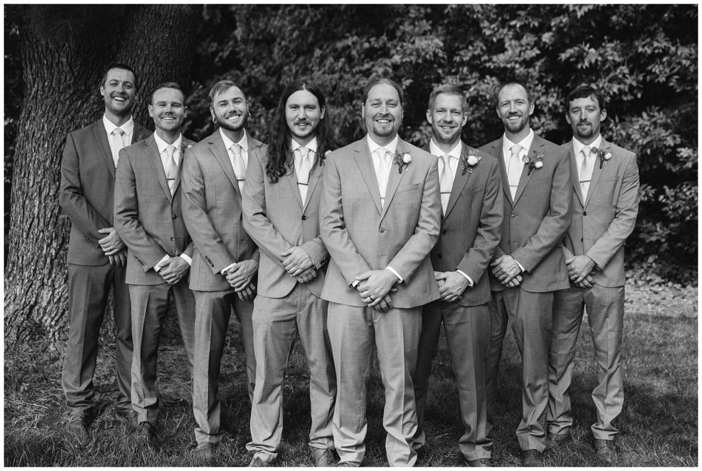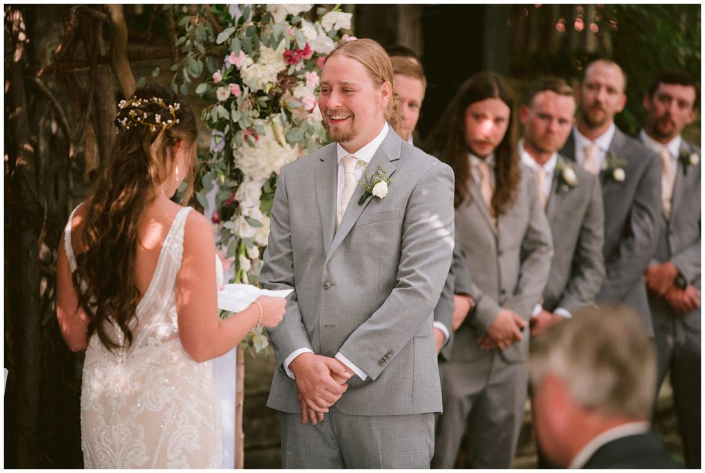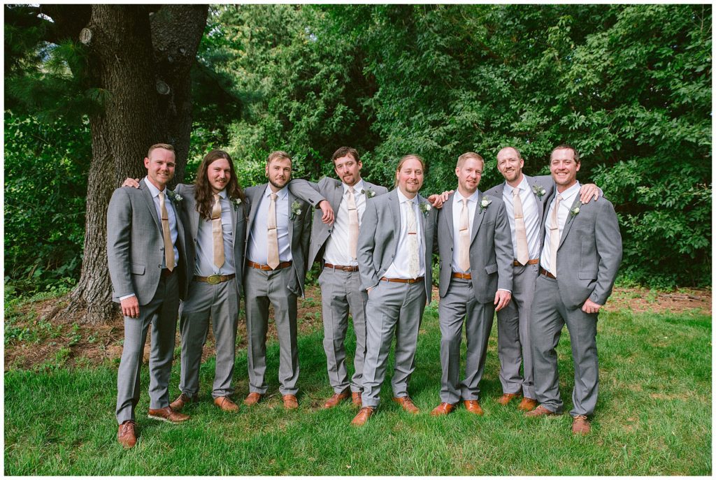 Adam’s mother was a genus with the florals, and made gorgeous bouquets for the women that looked beautiful against the neutral palette of dresses they all wore. Adam and his groomsmen wore grey suits that when put up against the green backdrop looked incredible.