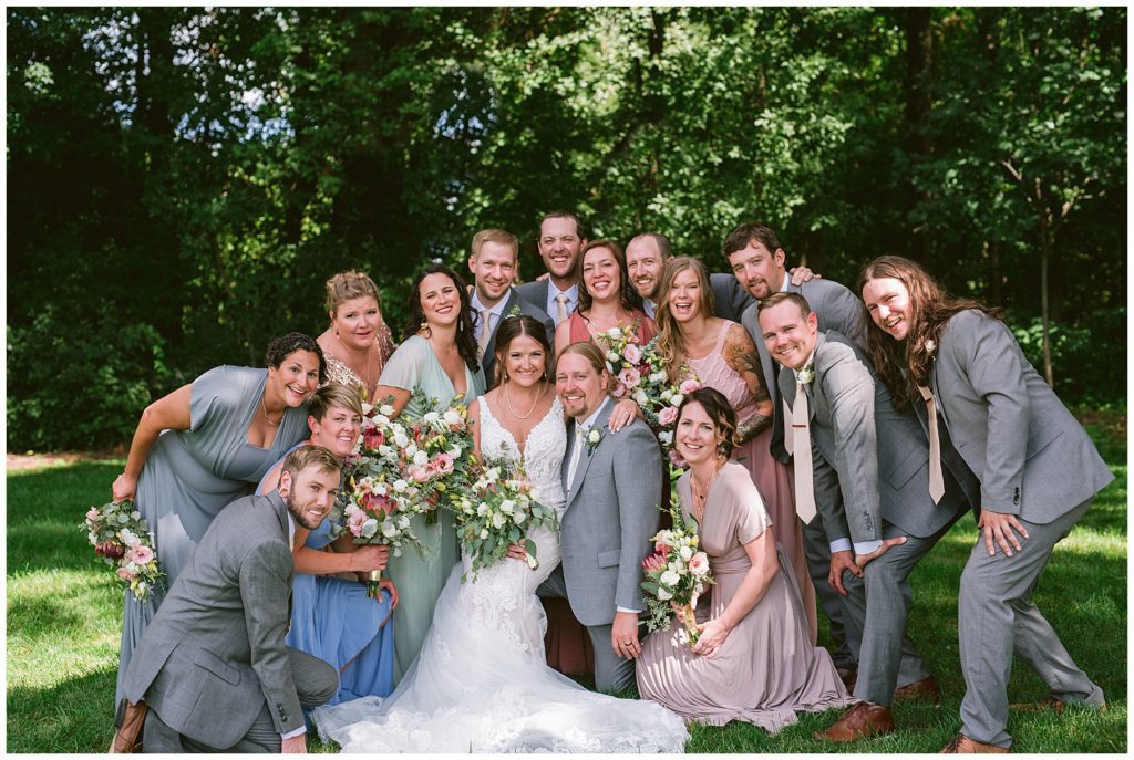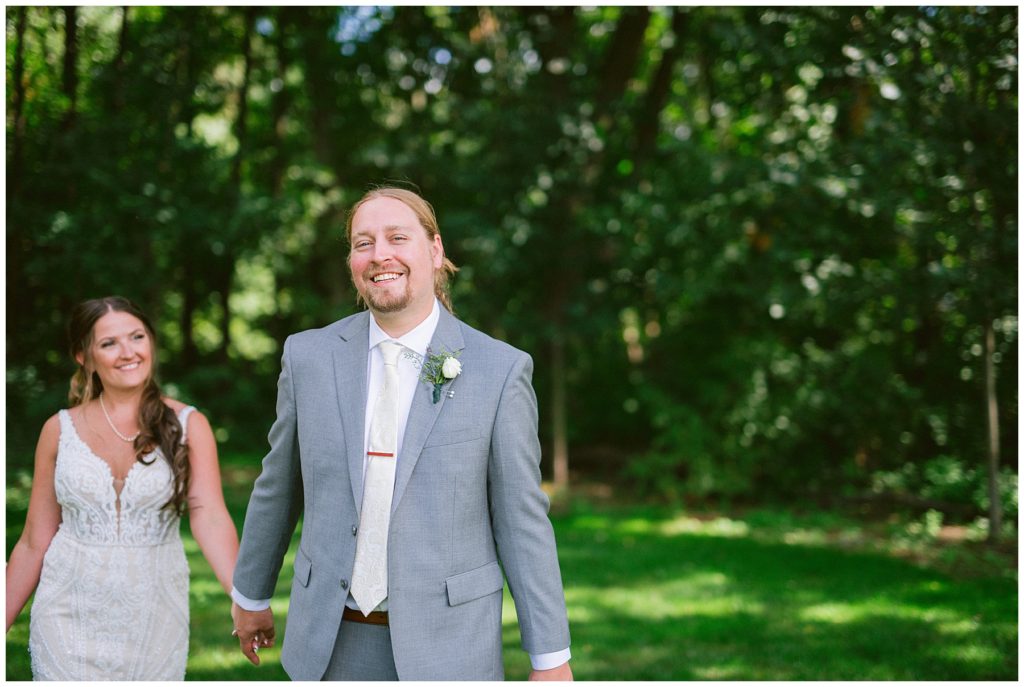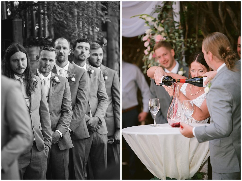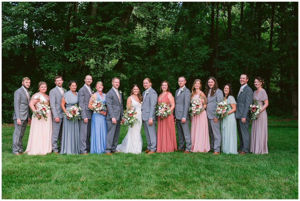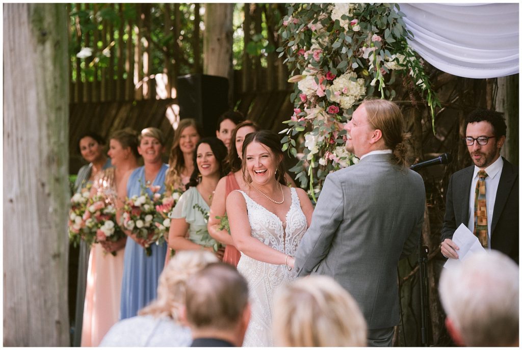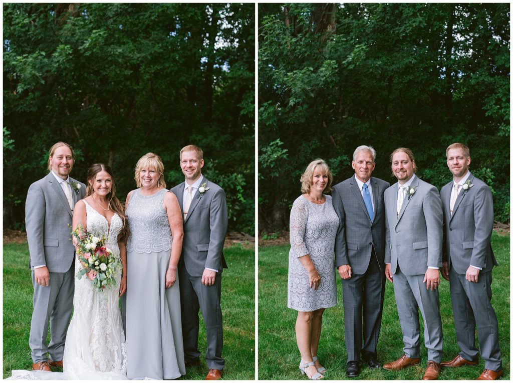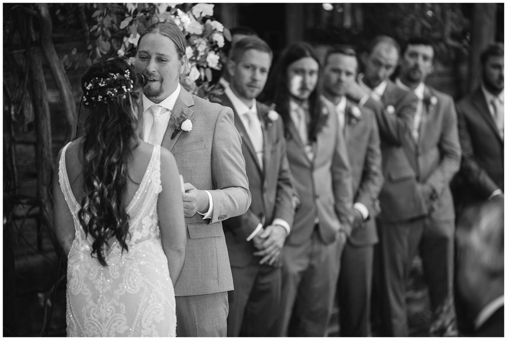 Adam’s mother was a genus with the florals, and made gorgeous bouquets for the women that looked beautiful against the neutral palette of dresses they all wore. Adam and his groomsmen wore grey suits that when put up against the green backdrop looked incredible.